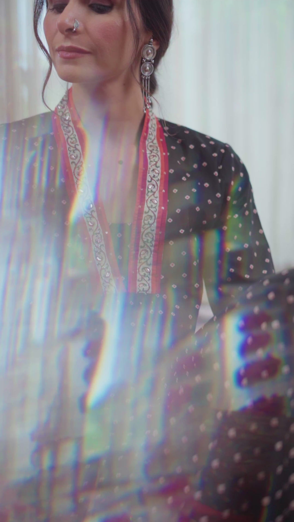 Black Bandhej Printed A-line gathered yoke Kurta has aari and sequins embroidery work on neckline and border of three quarter sleeves. This kurta comes along with a black printed pant.