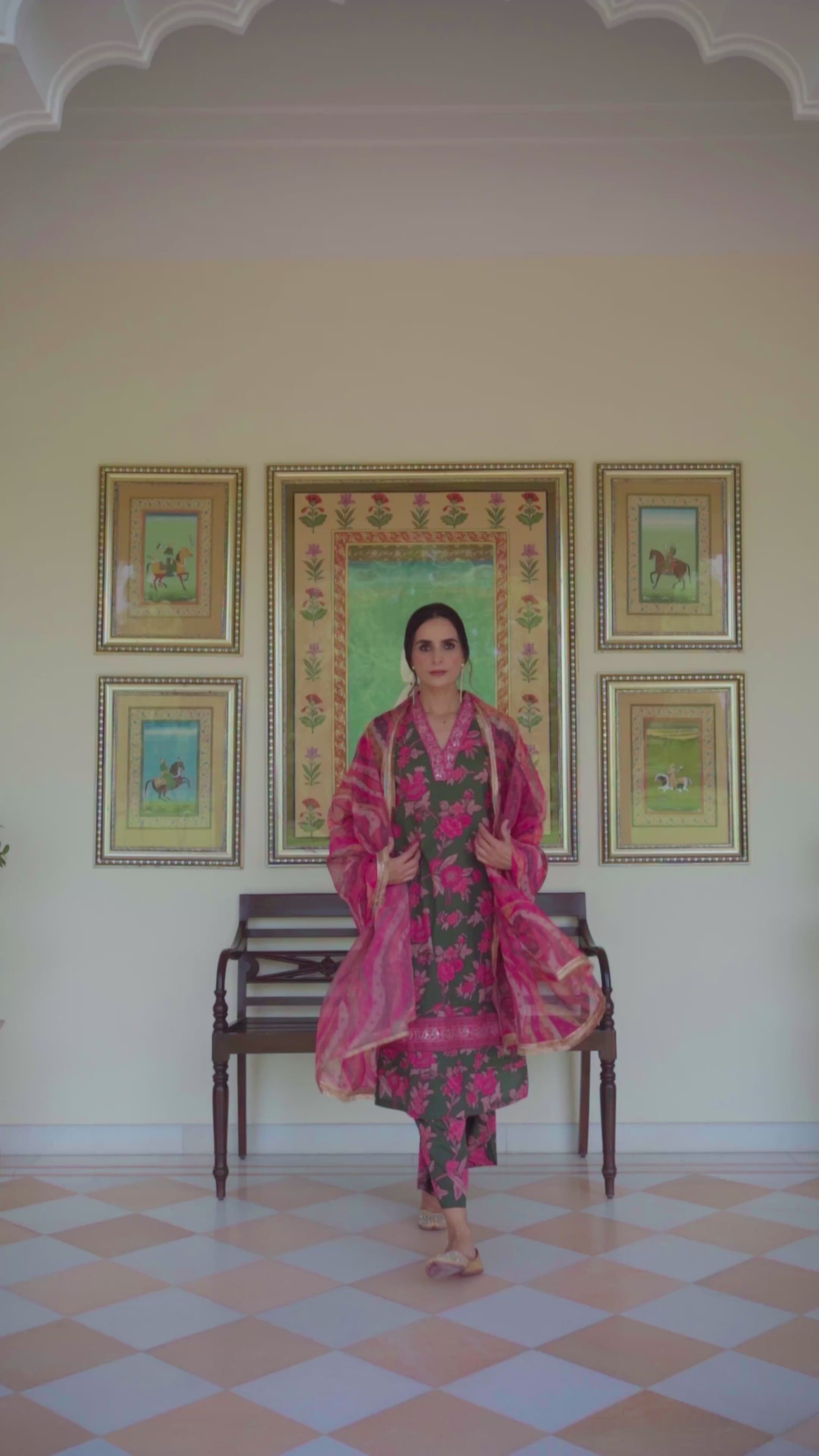 Green printed straight V-neck kurta detailed with aari, sequins and badla embroidered neckline with pin tucks detail along with the border on hem and three quarter sleeves, kurta comes with matching printed Pants.