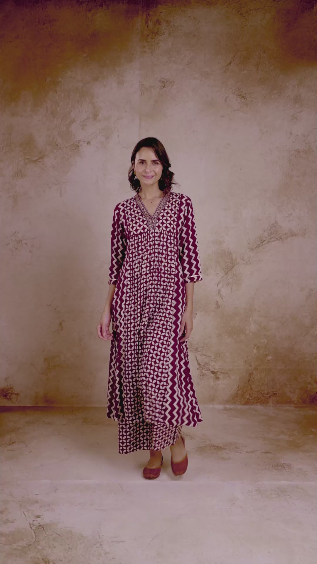 Wine hues A-line kurta with hand embroidered Aari and Sequins work on neckline and yoke with gathers, three quarter sleeves detail with gota line on hem of sleeves. This beautiful kurta comes with wine printed pant.
