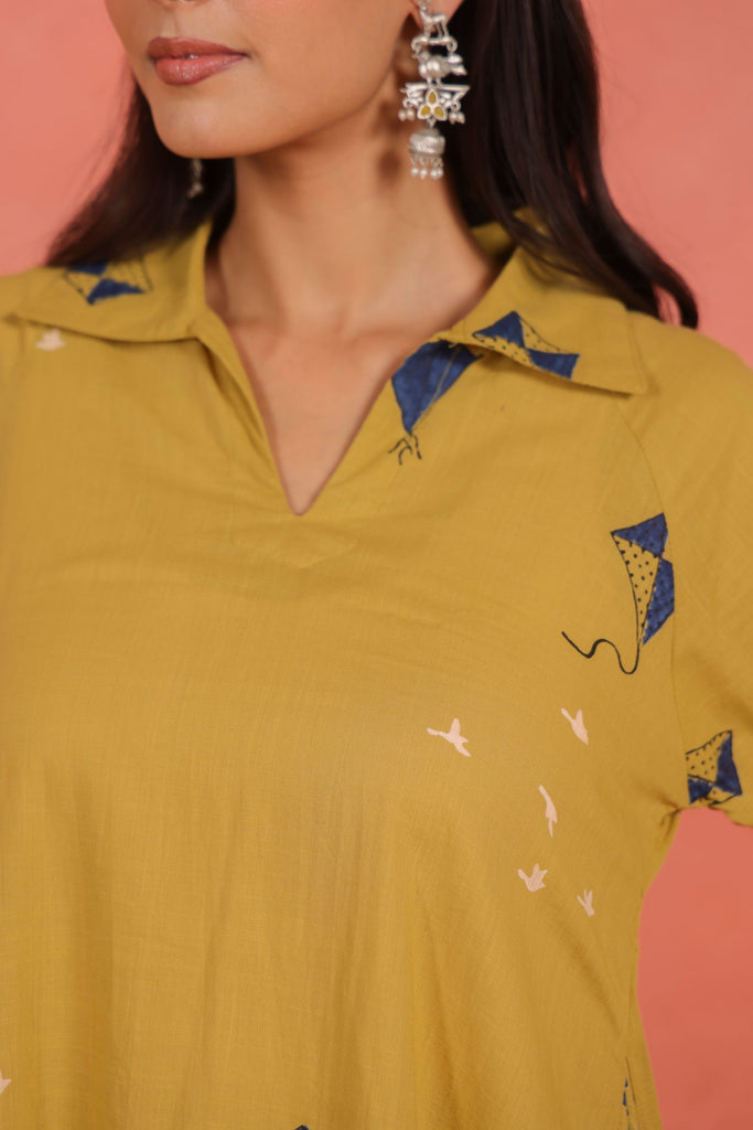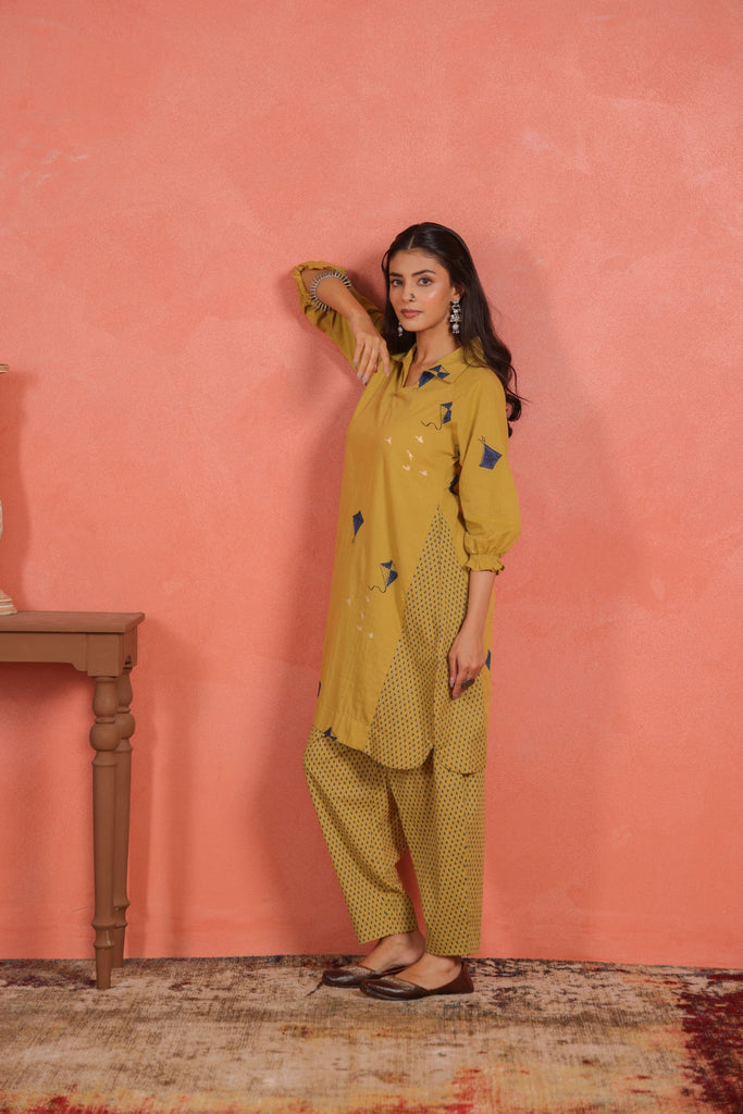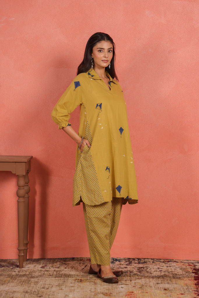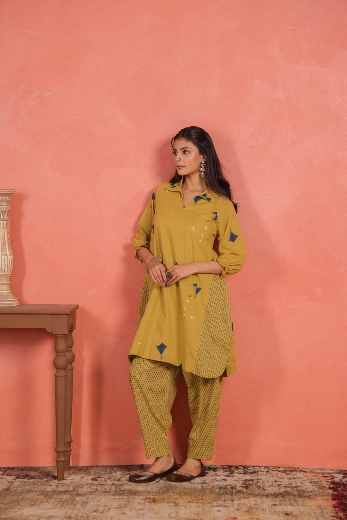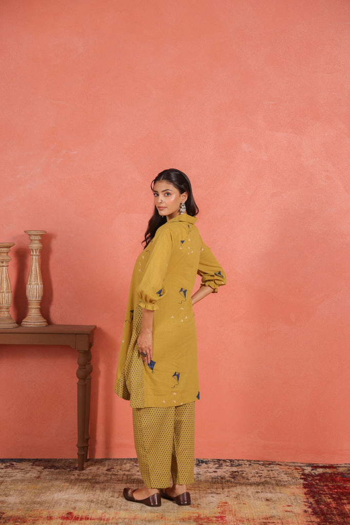 Infuse your everyday ethnic wardrobe with a touch of brightness and effortless style. This Yellow Cotton Slub A-Line Kurta Set pairs a knee-length A-line kurta with relaxed Afghani pants, blending cheerful design with breathable comfort.