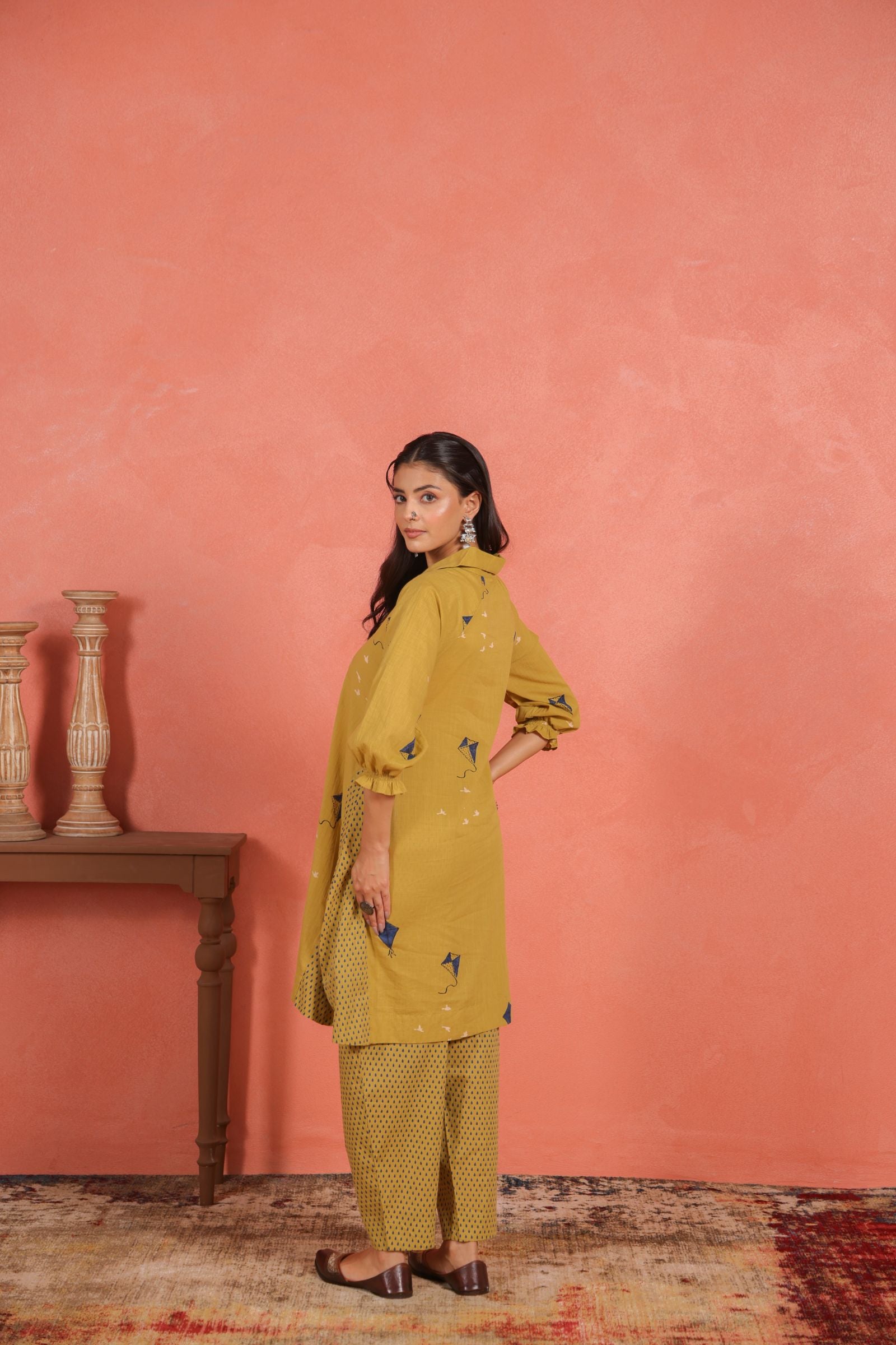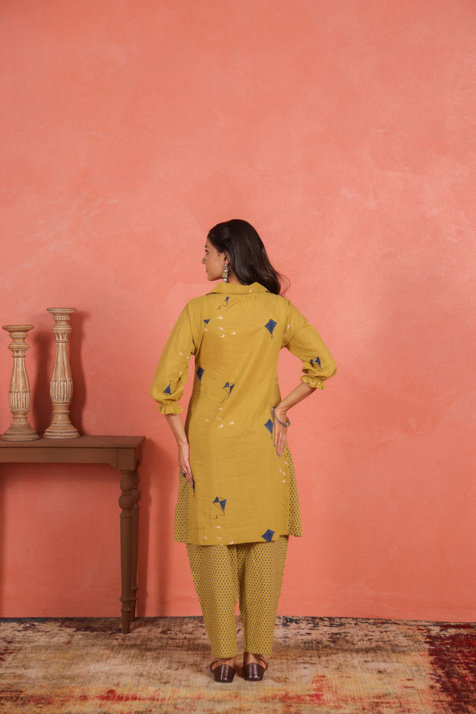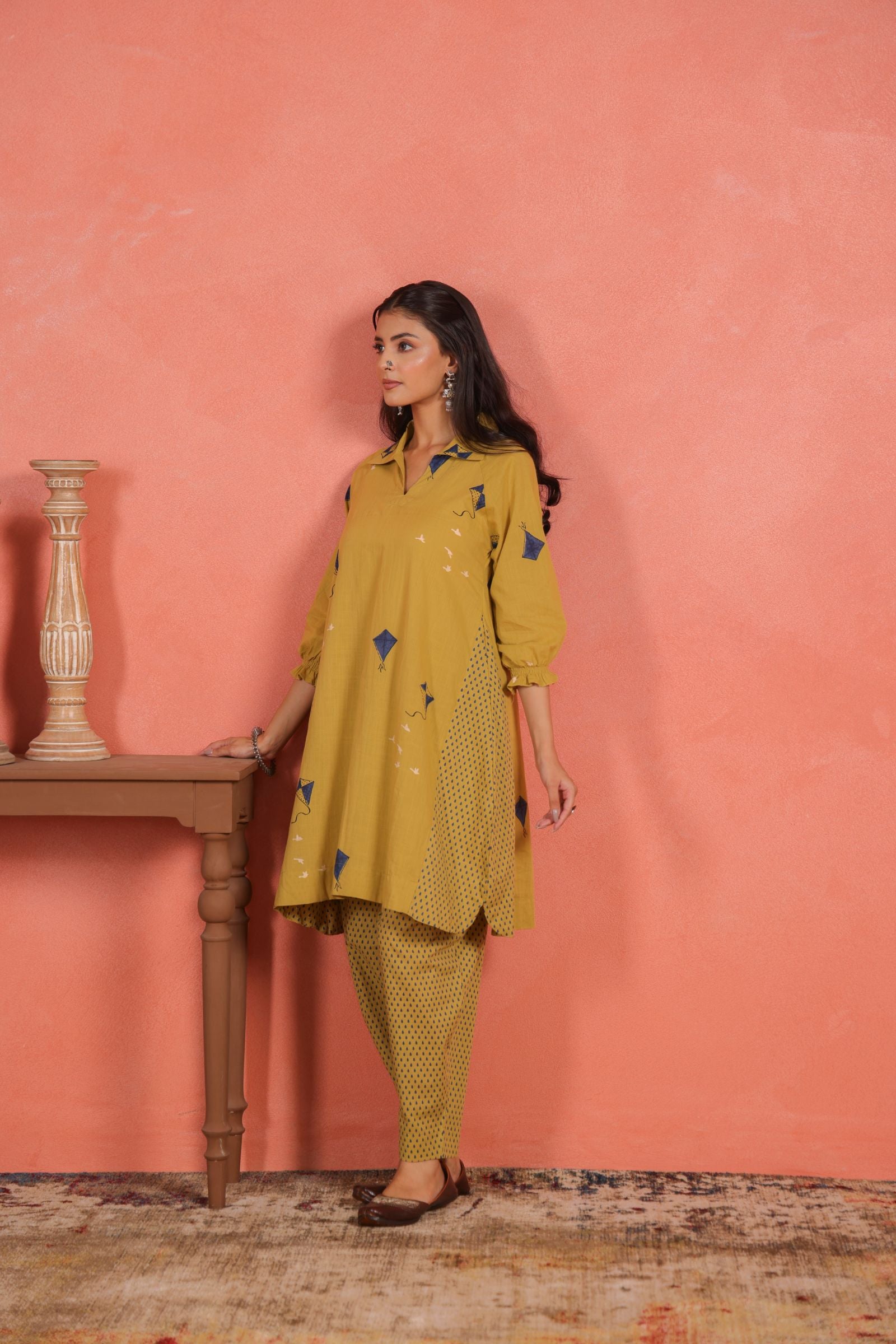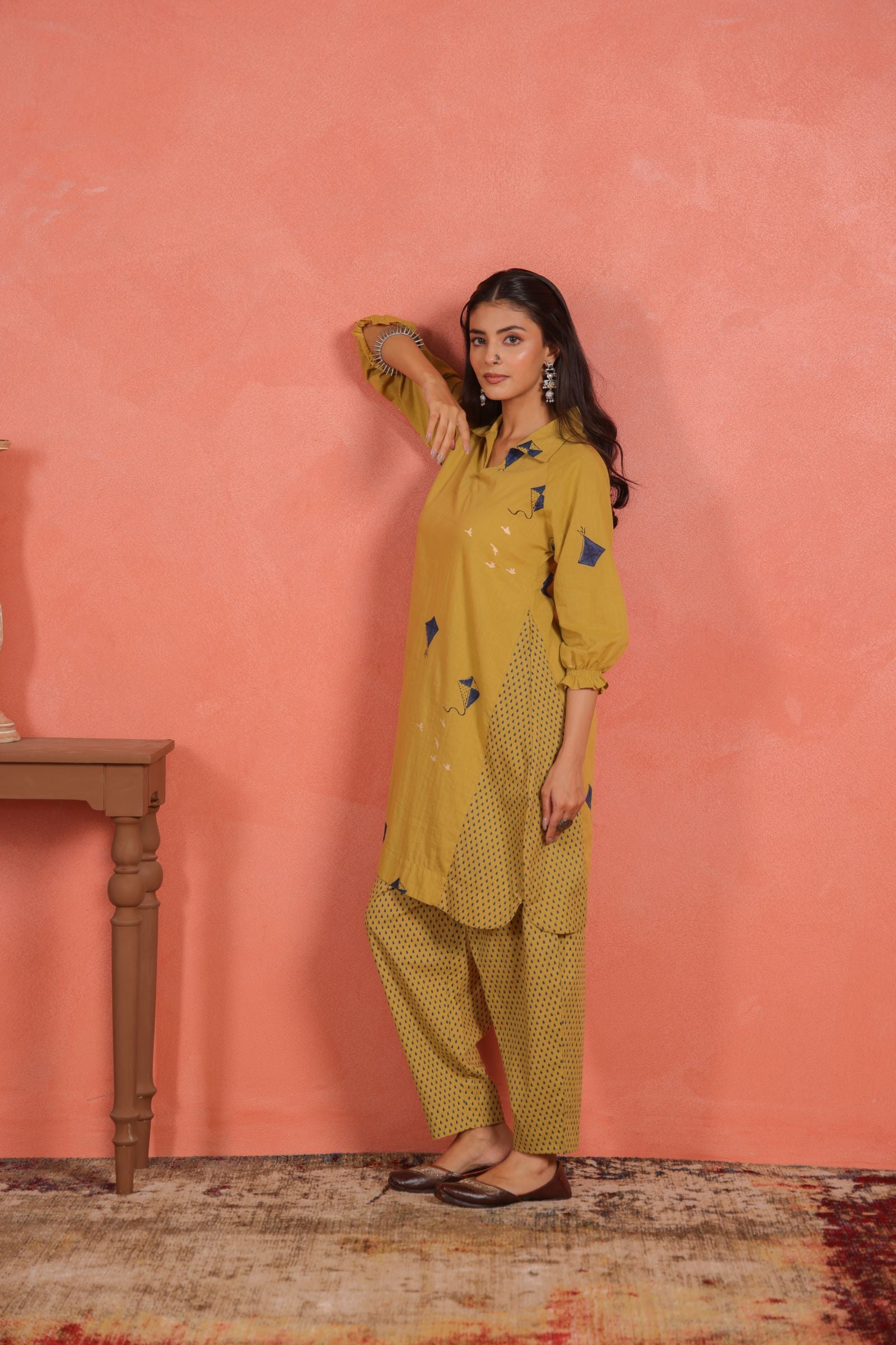 Crafted from lightweight cotton slub fabric, the kurta drapes softly and offers a comfort fit that’s ideal for warm weather. The shirt collar neckline adds a contemporary edge, while 3/4th sleeves maintain a refined, graceful balance. Whether it’s a daytime get-together or a festive brunch, this two-piece set ensures all-day ease and elegance.