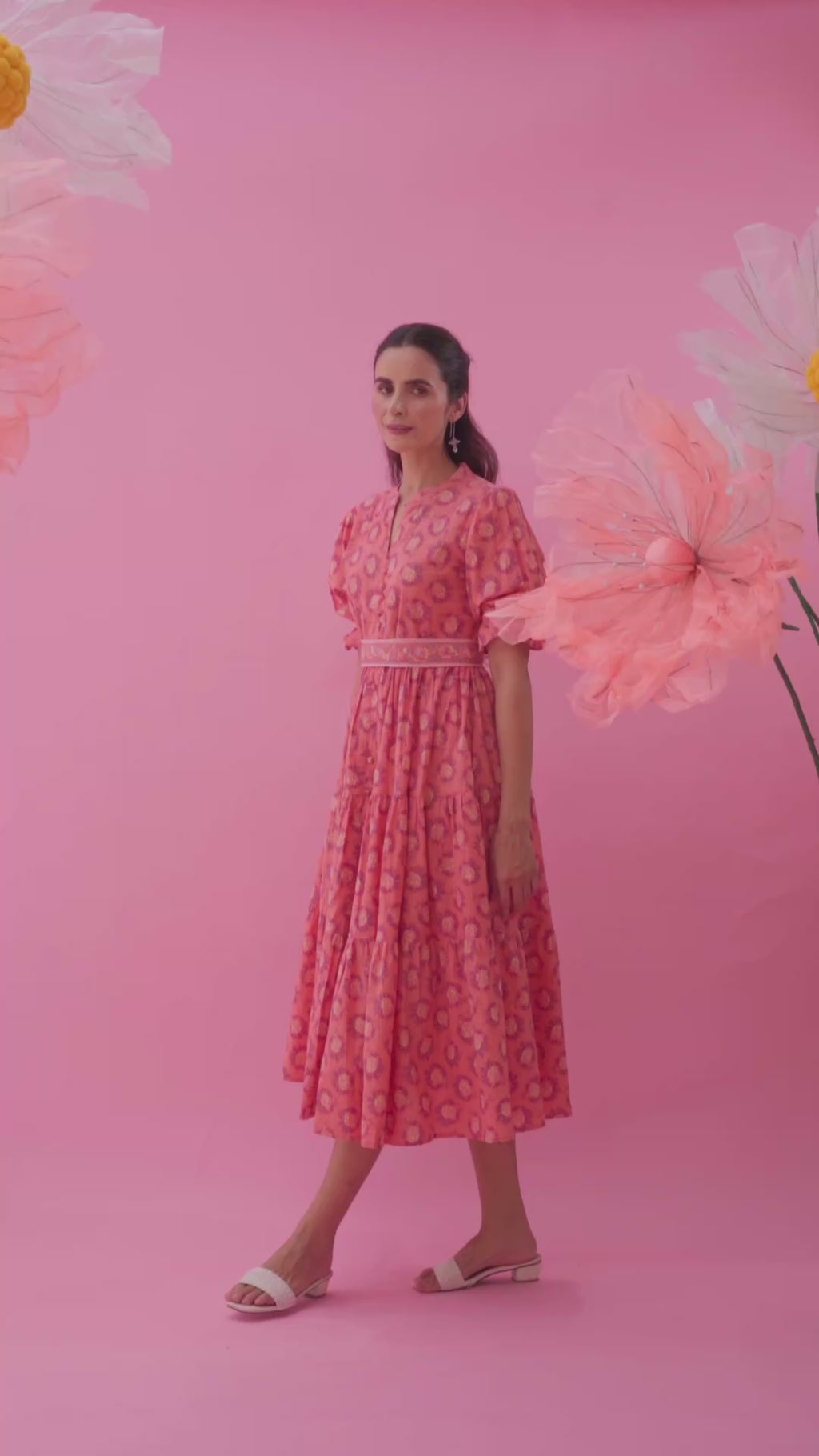 Orange Printed Tiered Maxi Dress with Elasticated Short Puff Sleeves, Mandarin Collar and Flounce Hem along with a Belt