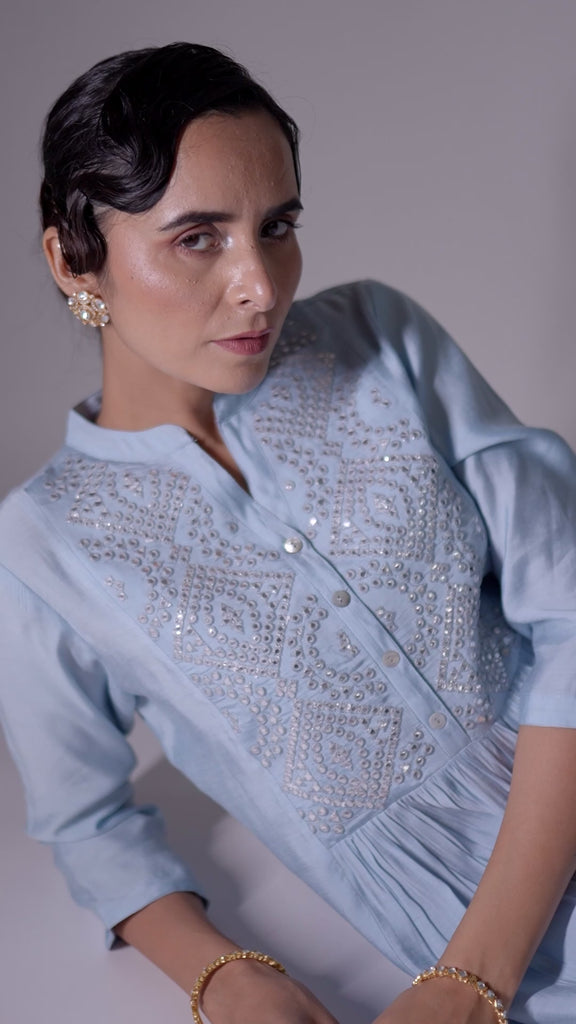 Sky blue gathered A-Line kurta with mirror embroidery yoke, has a mandarin collar, three-quarter sleeves with Pant.