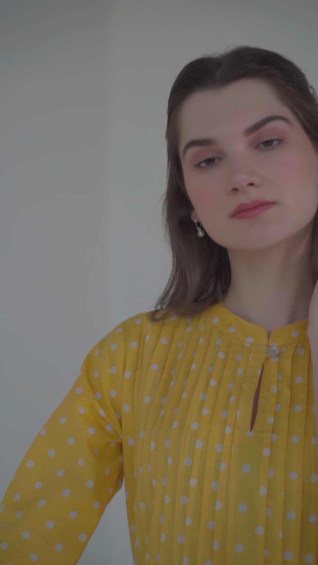 Yellow polka dot pleated A-Line Kurta with front button detailing, has a mandarin collar, three-quarter sleeves. This yellow polka dot kurta comes with white pant with cut-work embroidered hem.