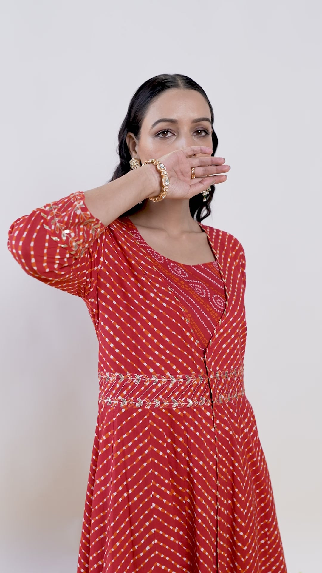 Red laheriya print double layer kalidaar kurta detailed with beautiful aari gotta patti work on waist and sleeves, has a heavy gotta lines and lace on hem, three-quarter sleeves, round neck. This kalidaar comes with saperate leheriya print inner and dupatta.
