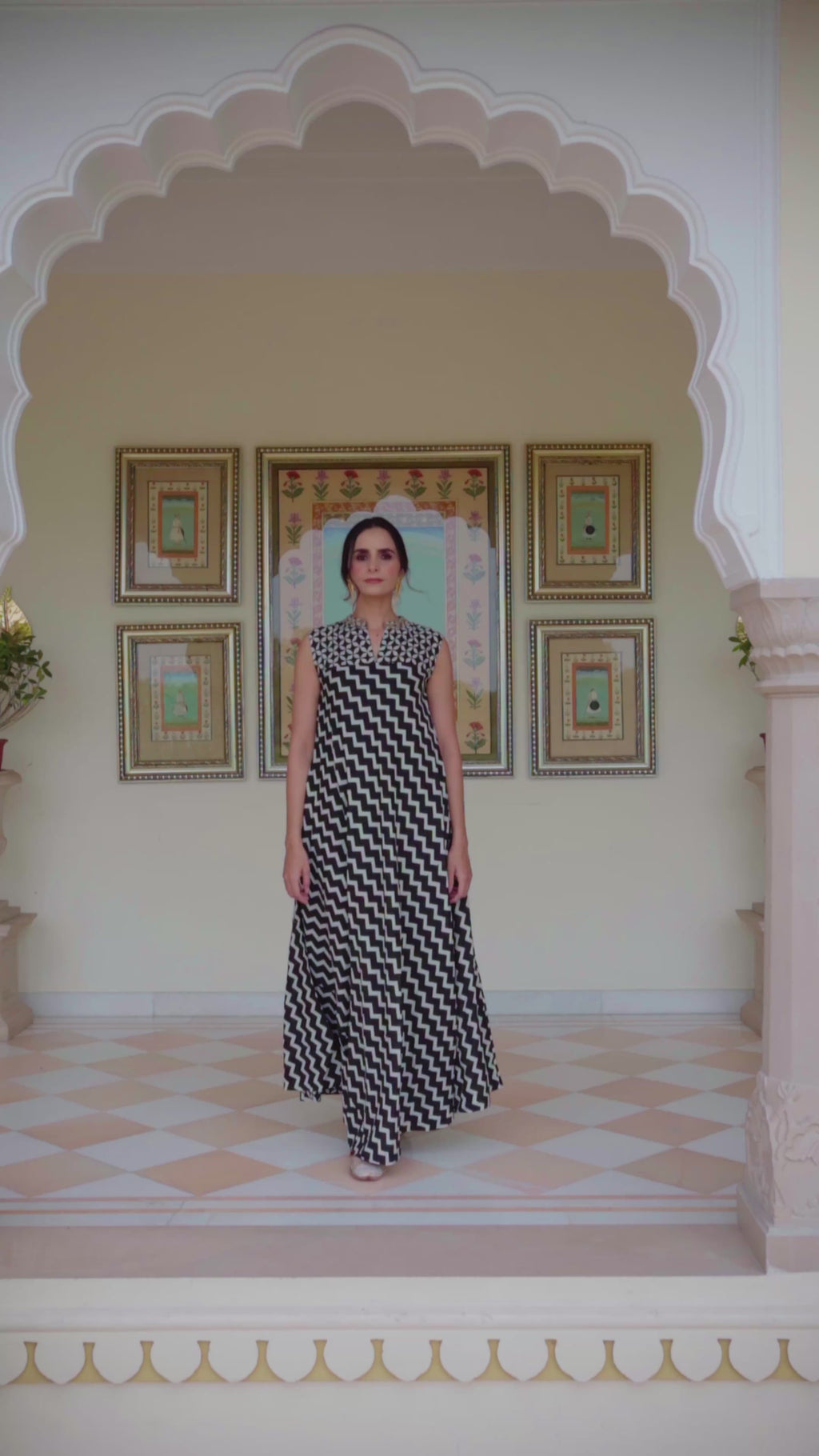 Black Monochromatic long flared mandarin collar dress kurta has aari, sequins embroidery work on yoke. This single piece dress is sleeveless.