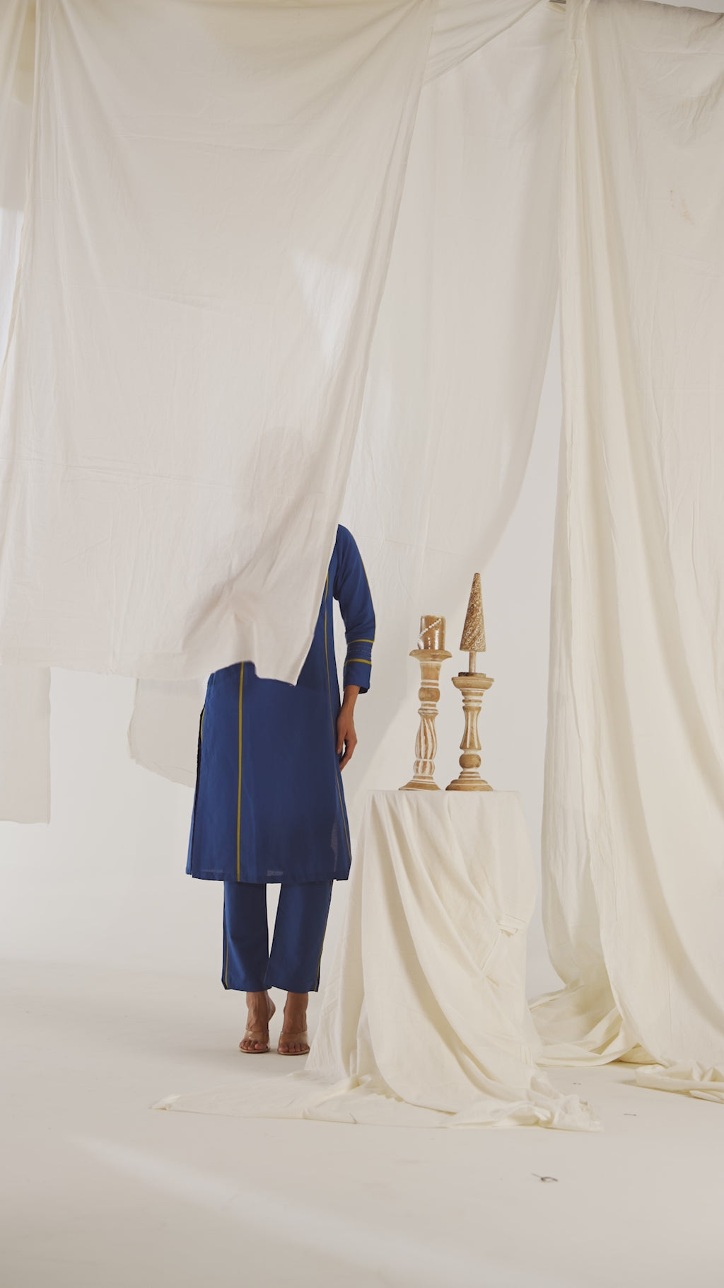 Blue Cotton Linen Kurta Pant Set in Contrast Piping