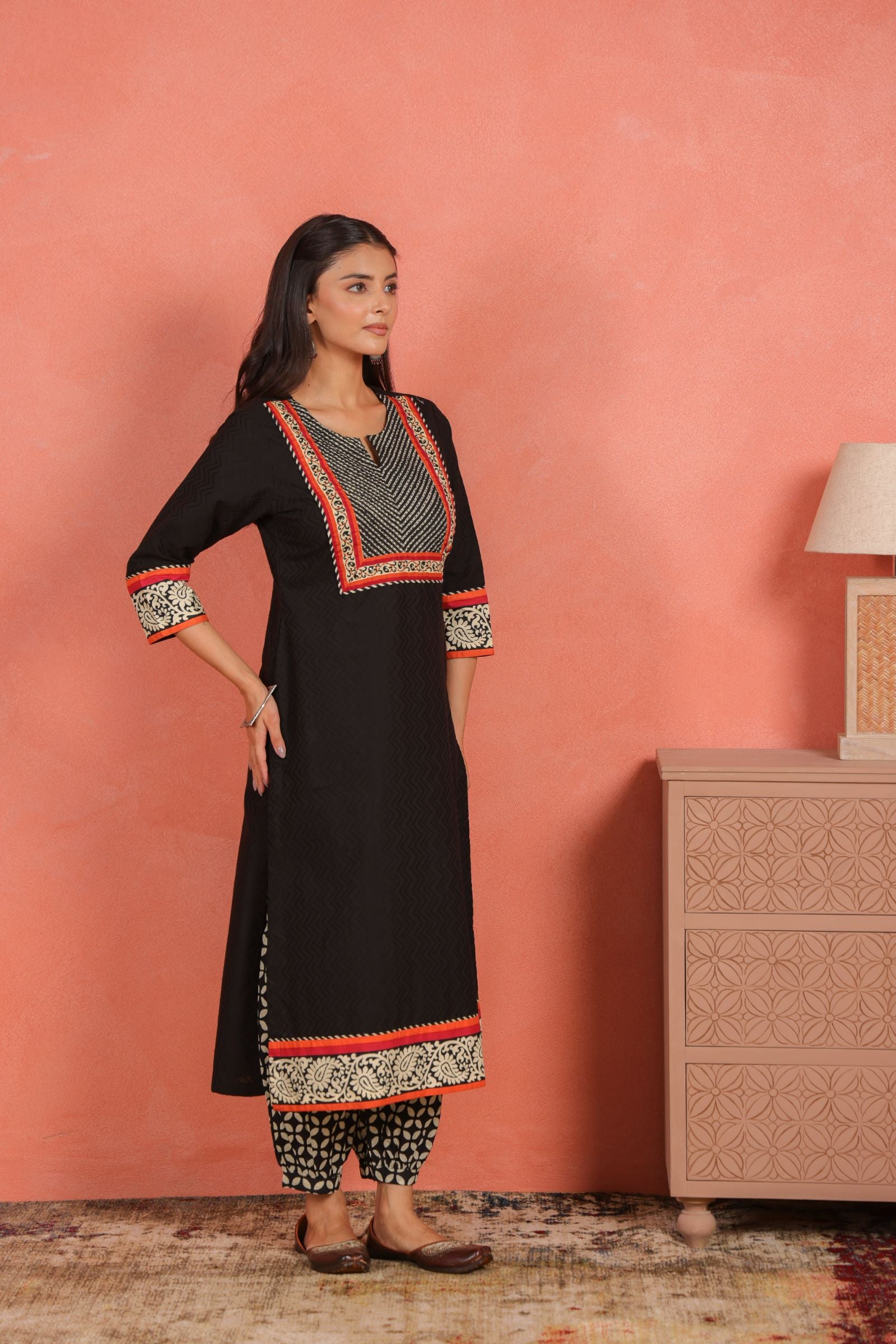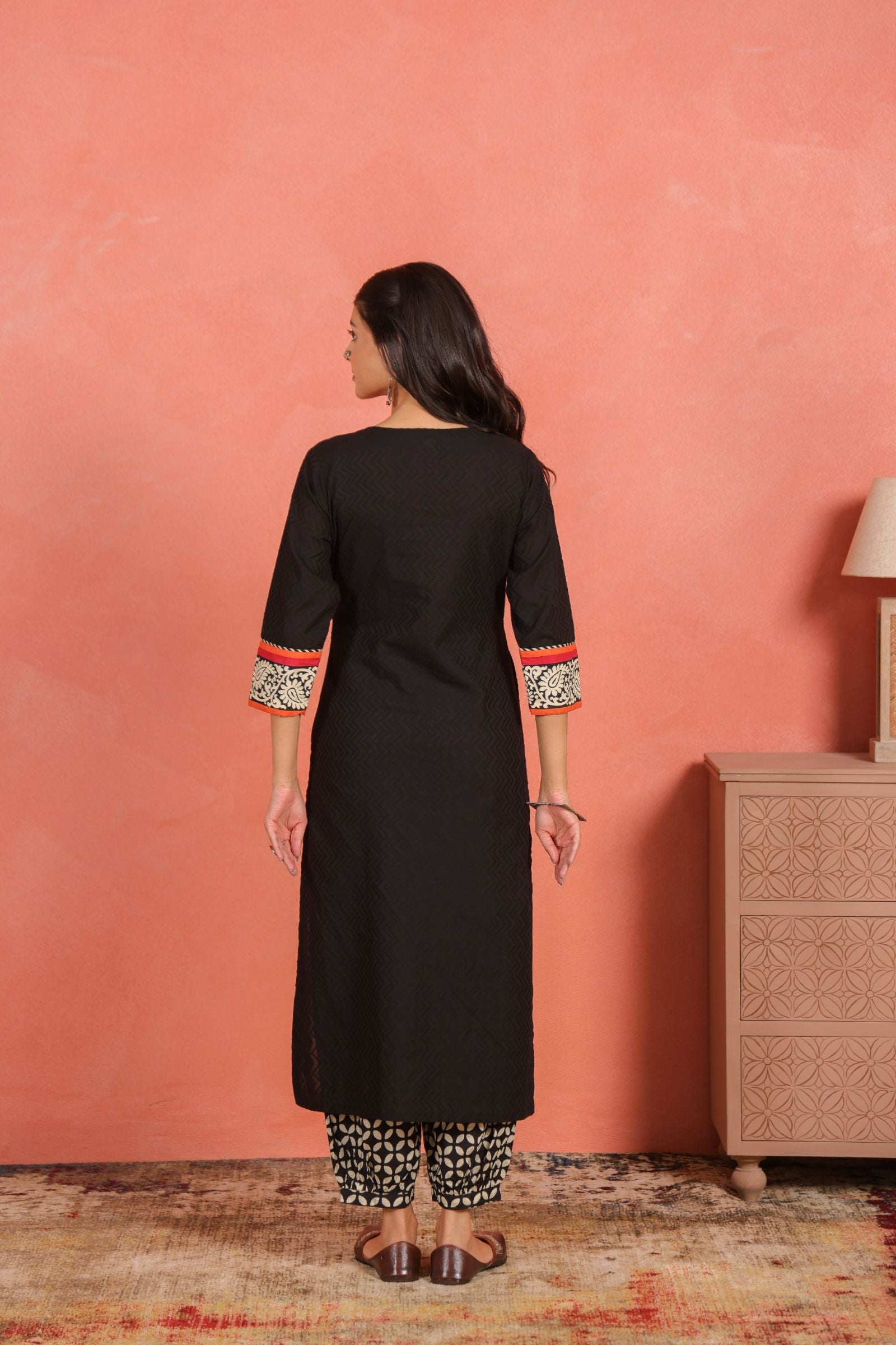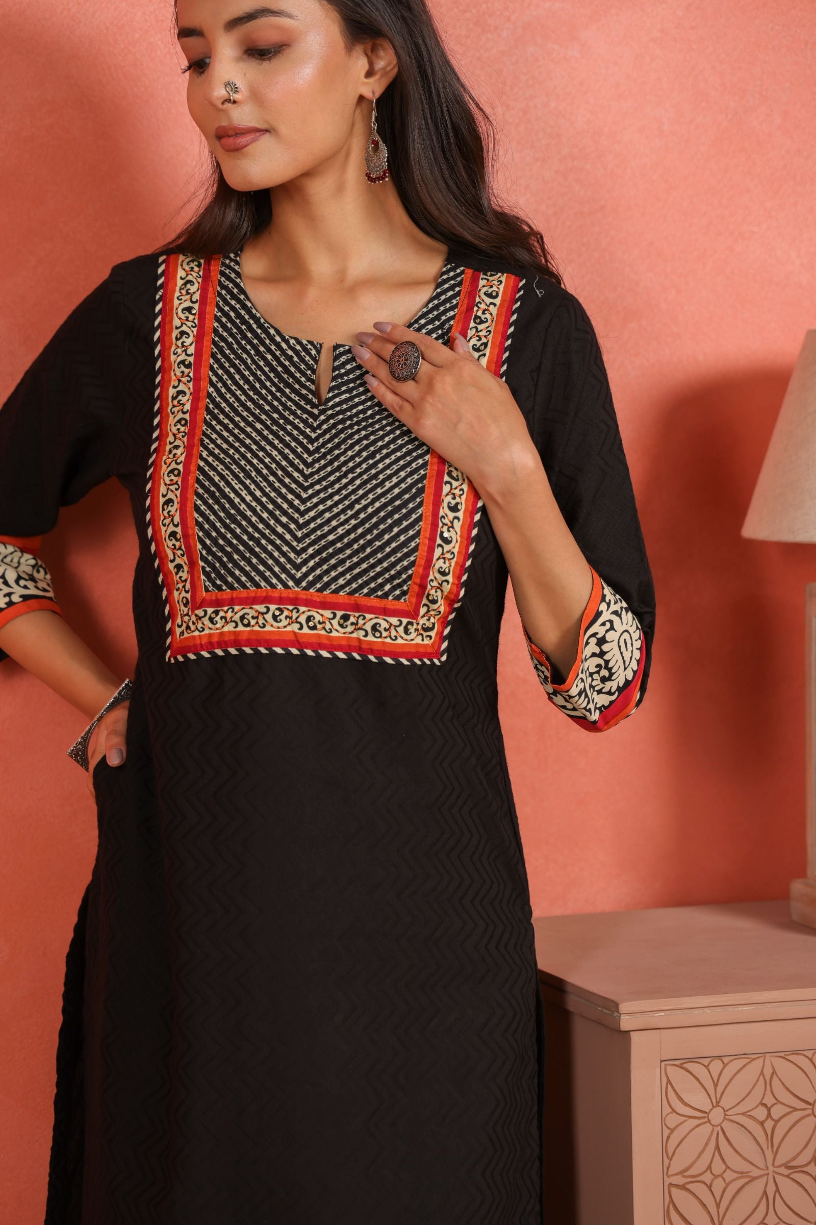 Black Cotton Dobby Kurta Set with Kantha Embroidery