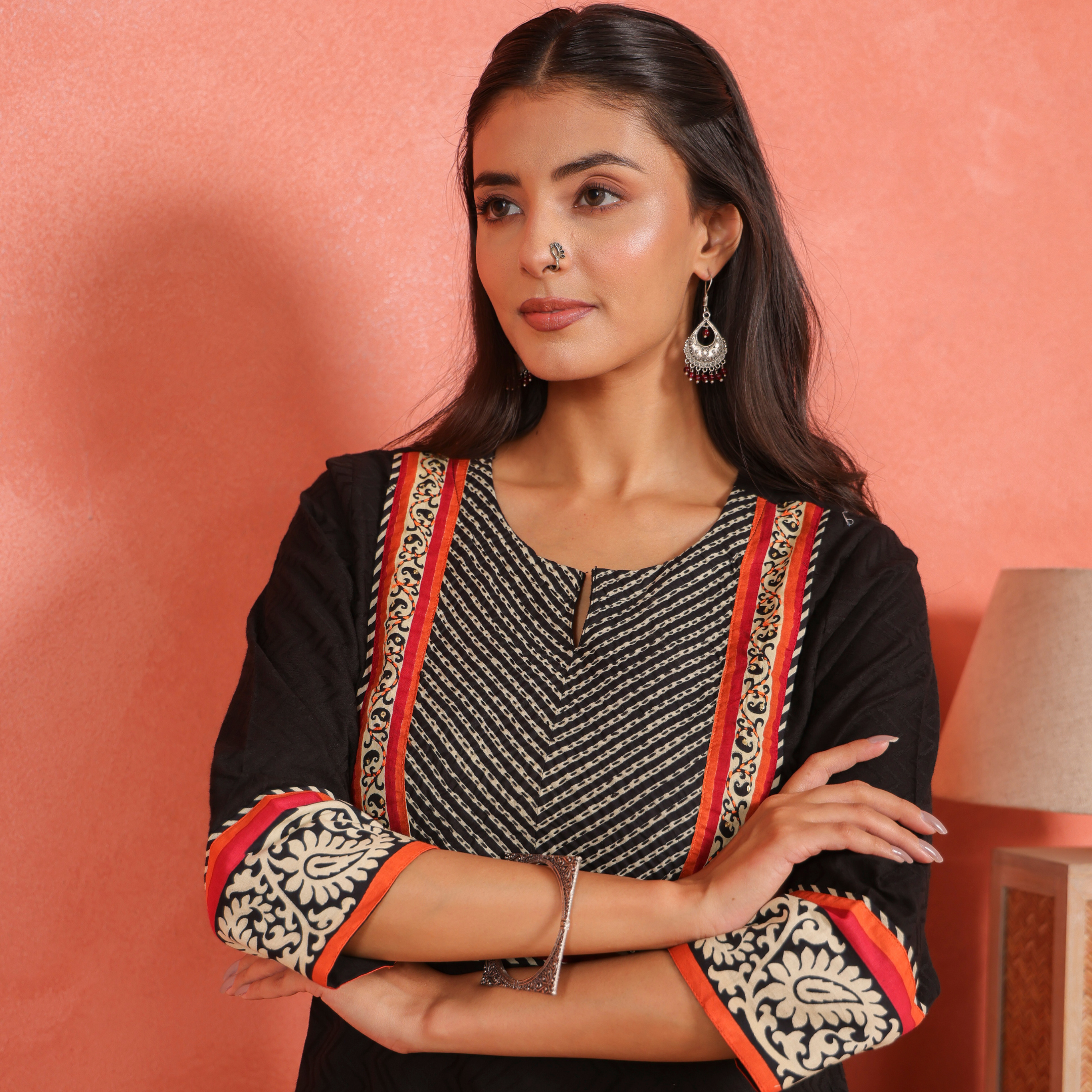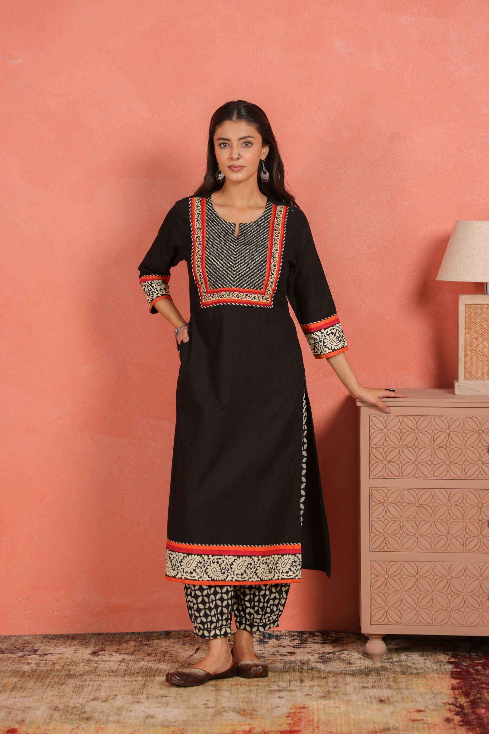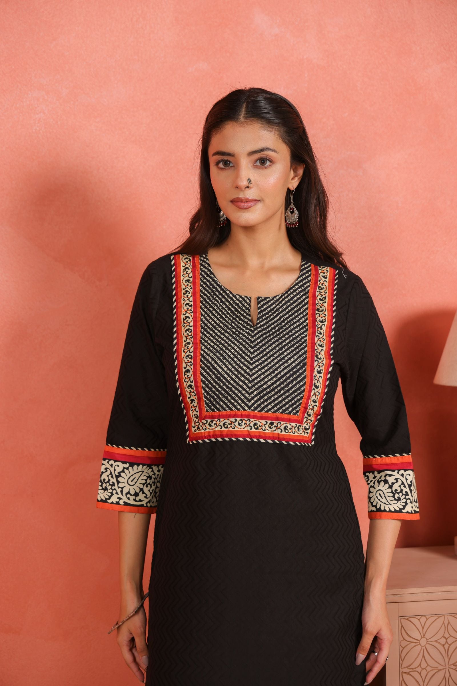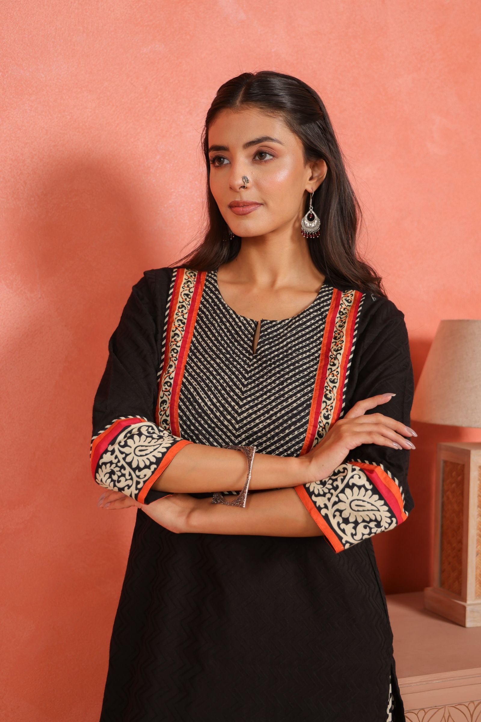 Black Cotton Dobby Kurta Set with Kantha Embroidery