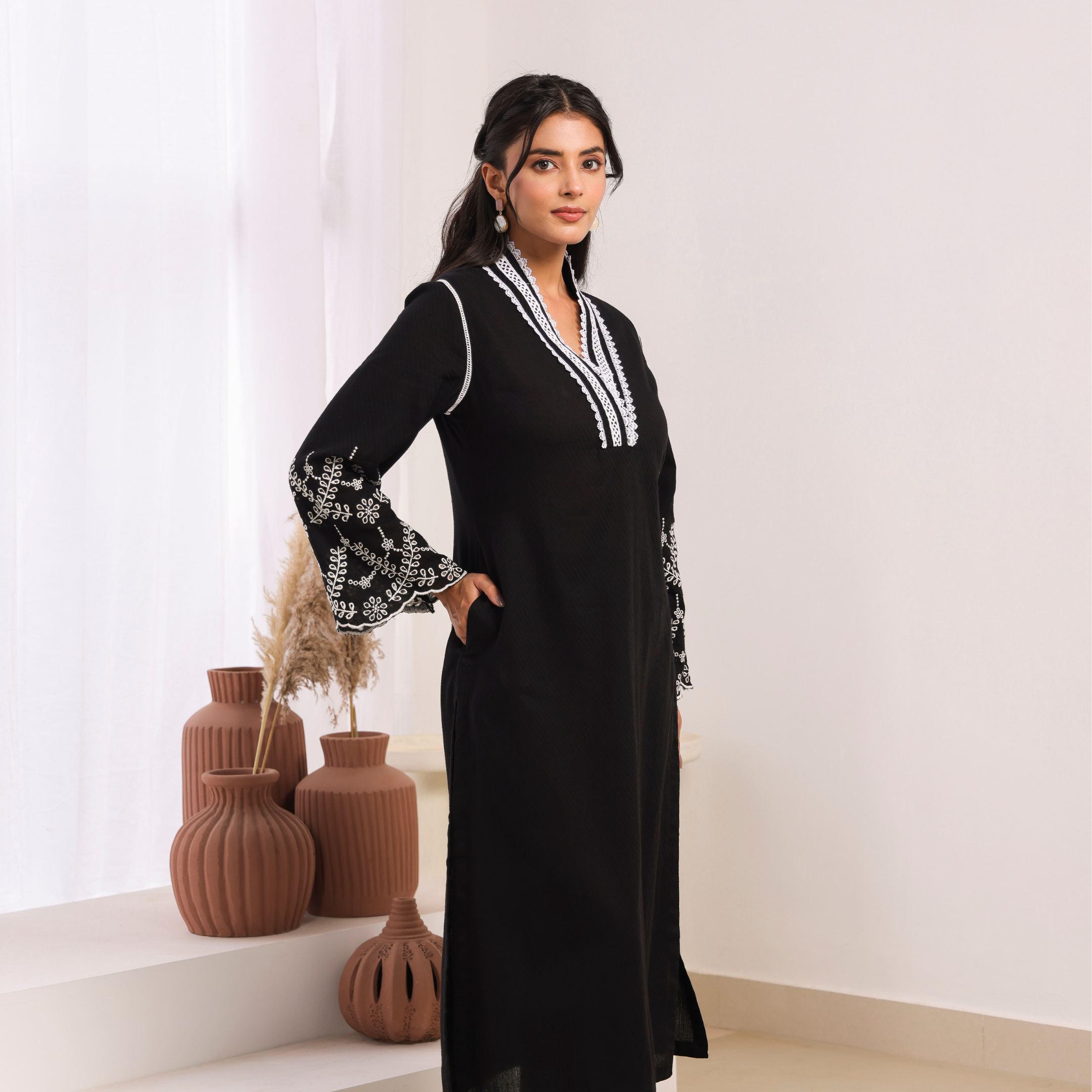 Elegant black cotton dobby kurta set featuring sophisticated lace work on the neck and intricate cut work on the sleeves. This traditional Indian ethnic wear ensemble combines authentic craftsmanship with contemporary design, perfect for both casual and semi-formal occasions. The calf-length kurta with full sleeves and overlap collar offers a comfortable, regular fit that flatters all body types. Ideal for Indian festivals, family gatherings, and cultural celebrations.