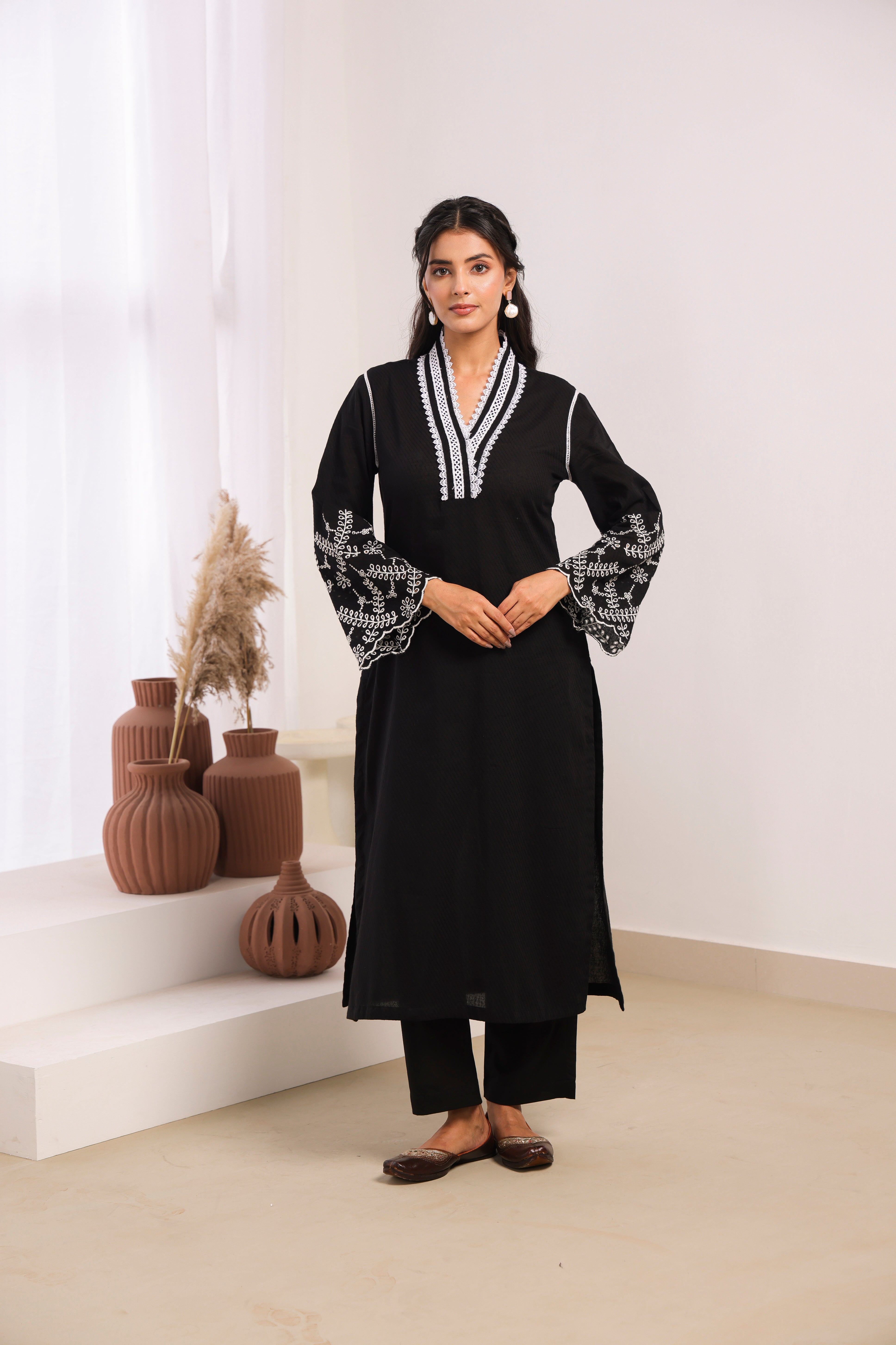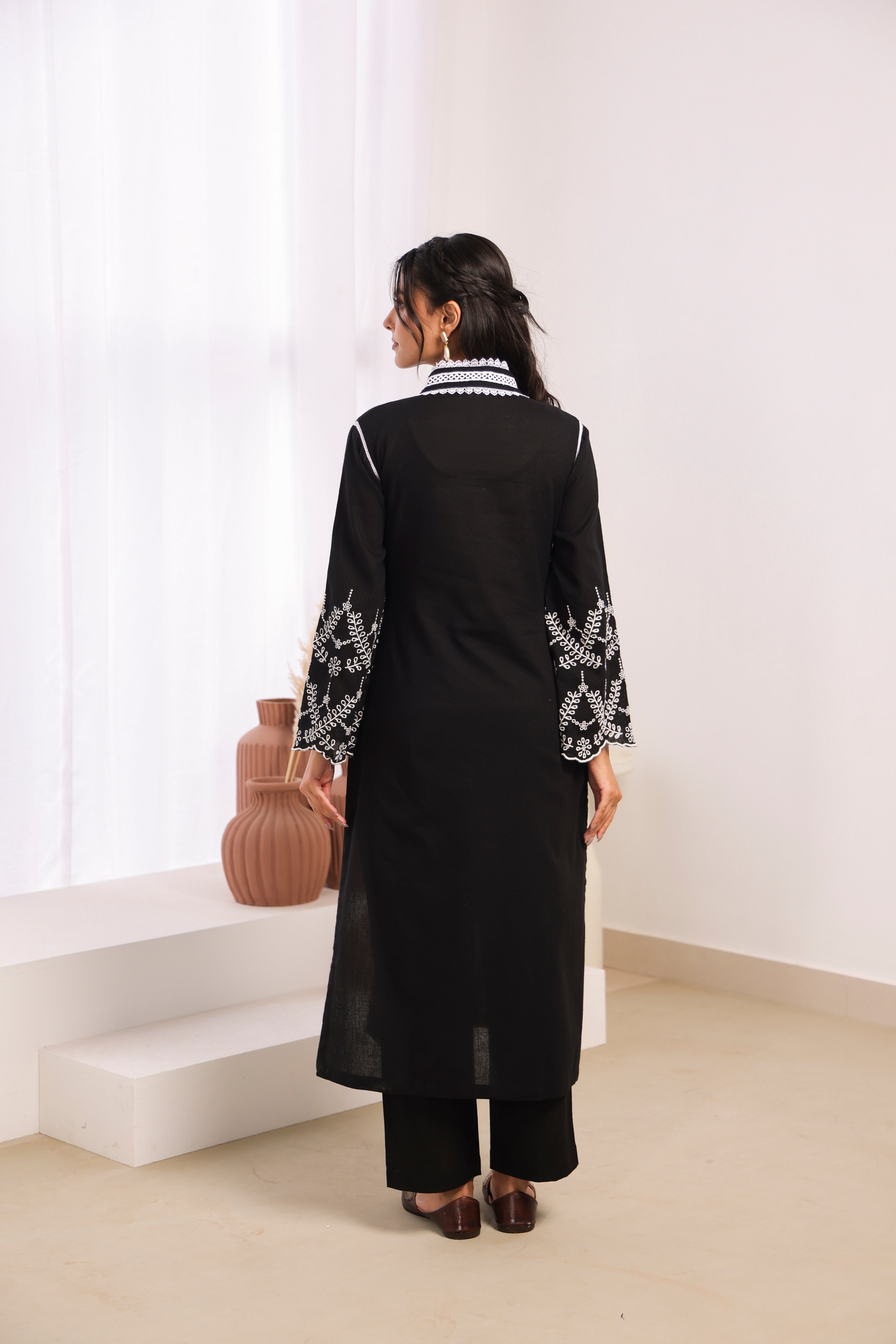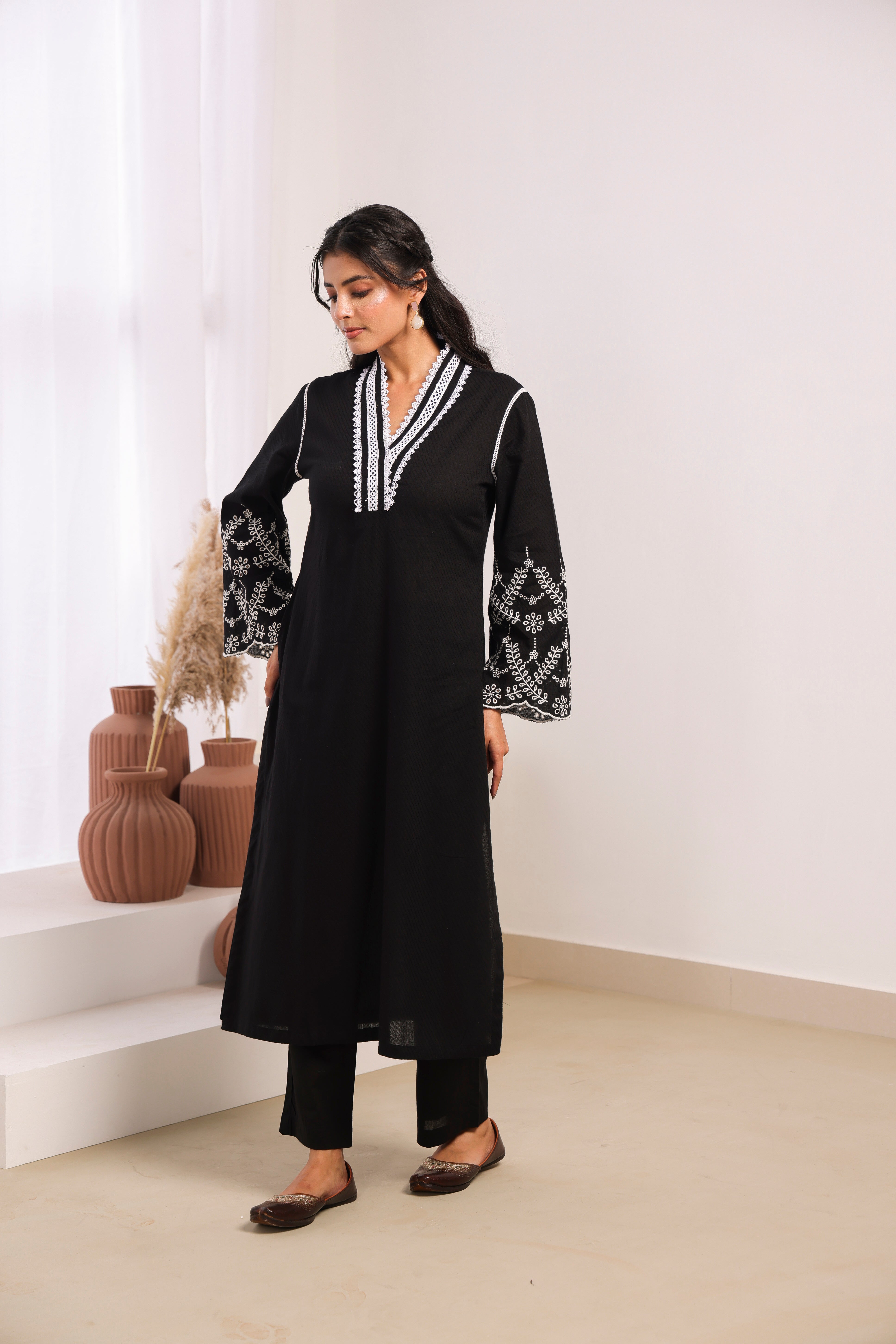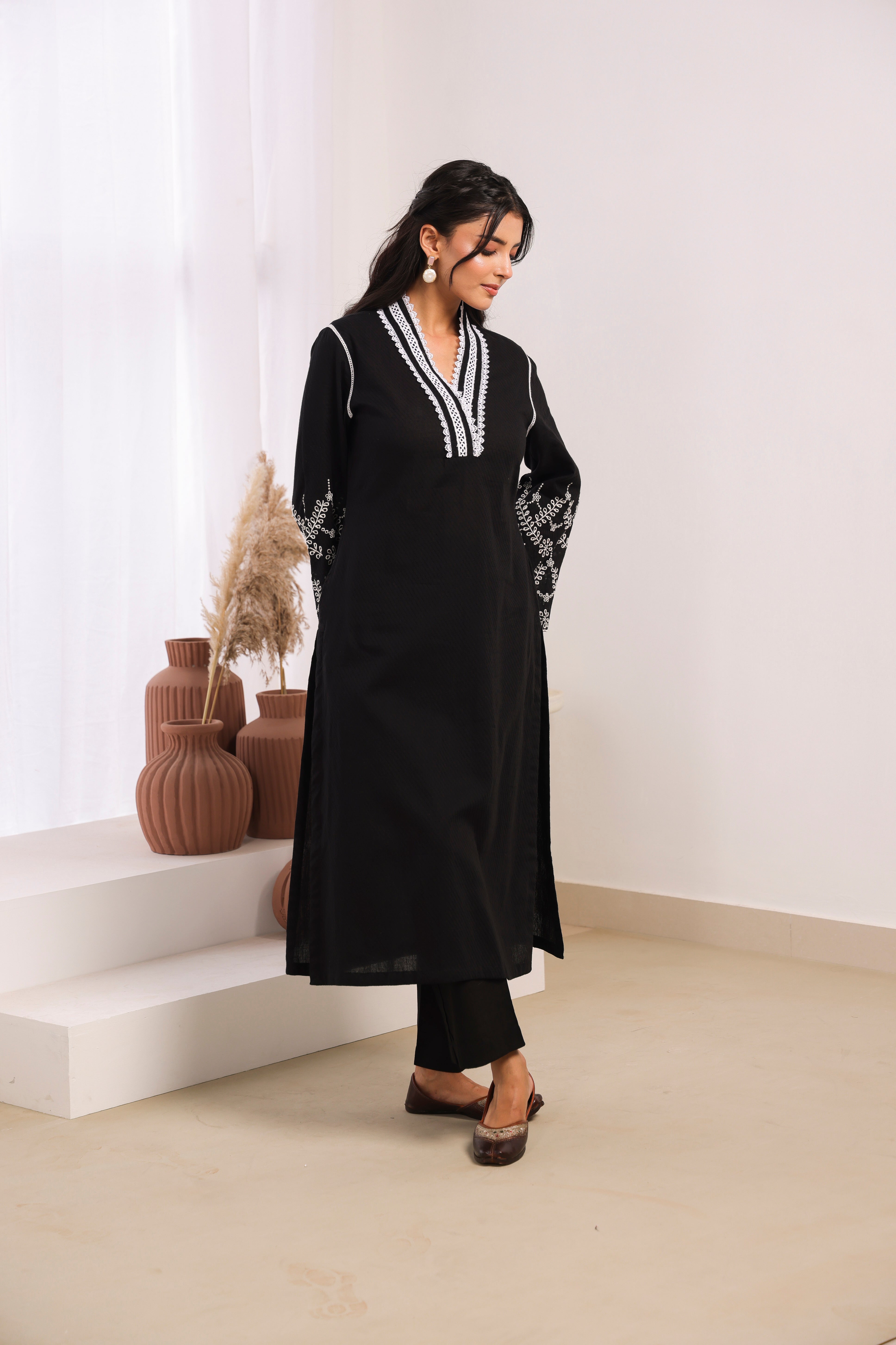 Black Cotton Dobby Kurta Set with Lace Work Neck and Cut Work Sleeves