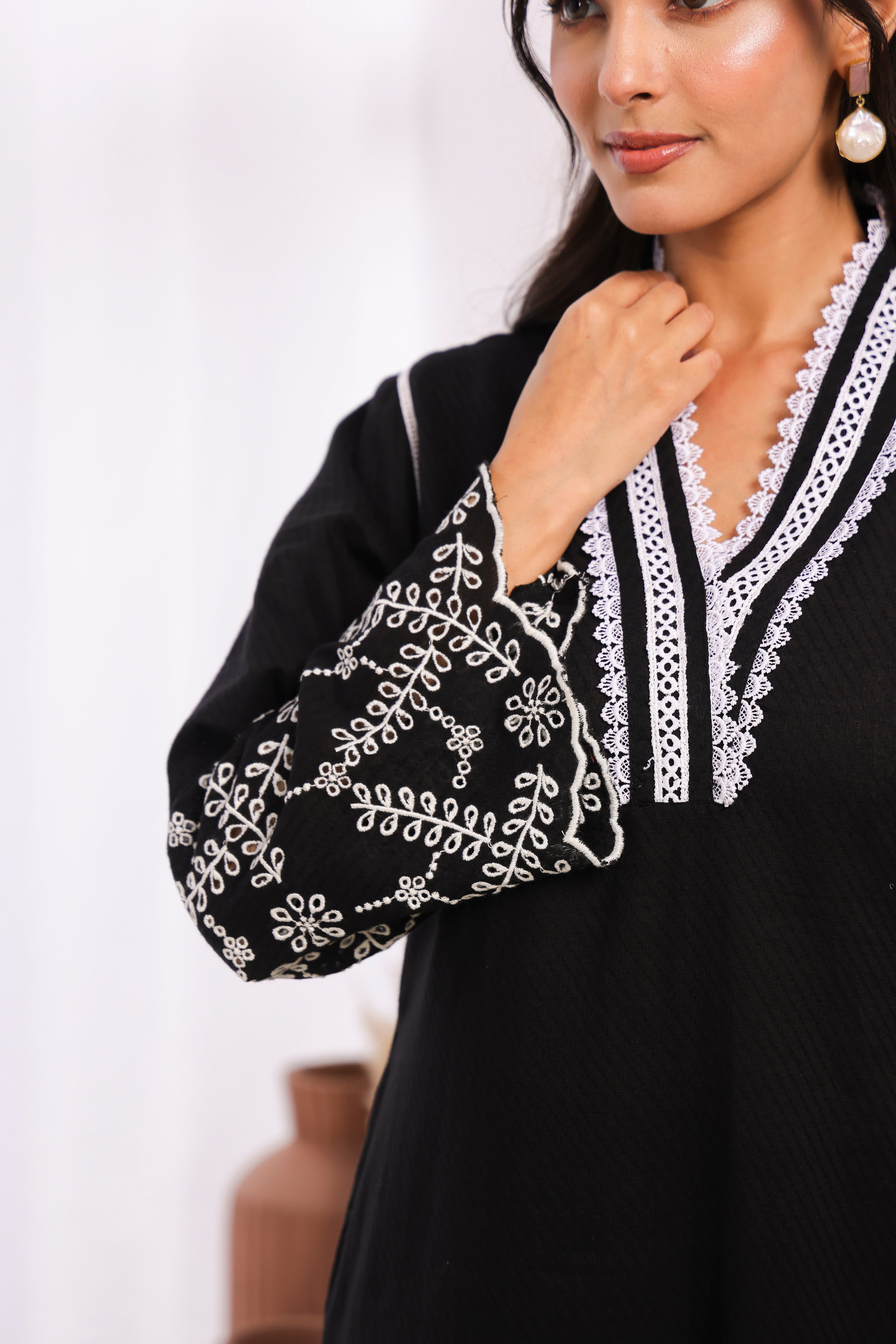 Design Details: Lace work on neck, cut work on sleeves