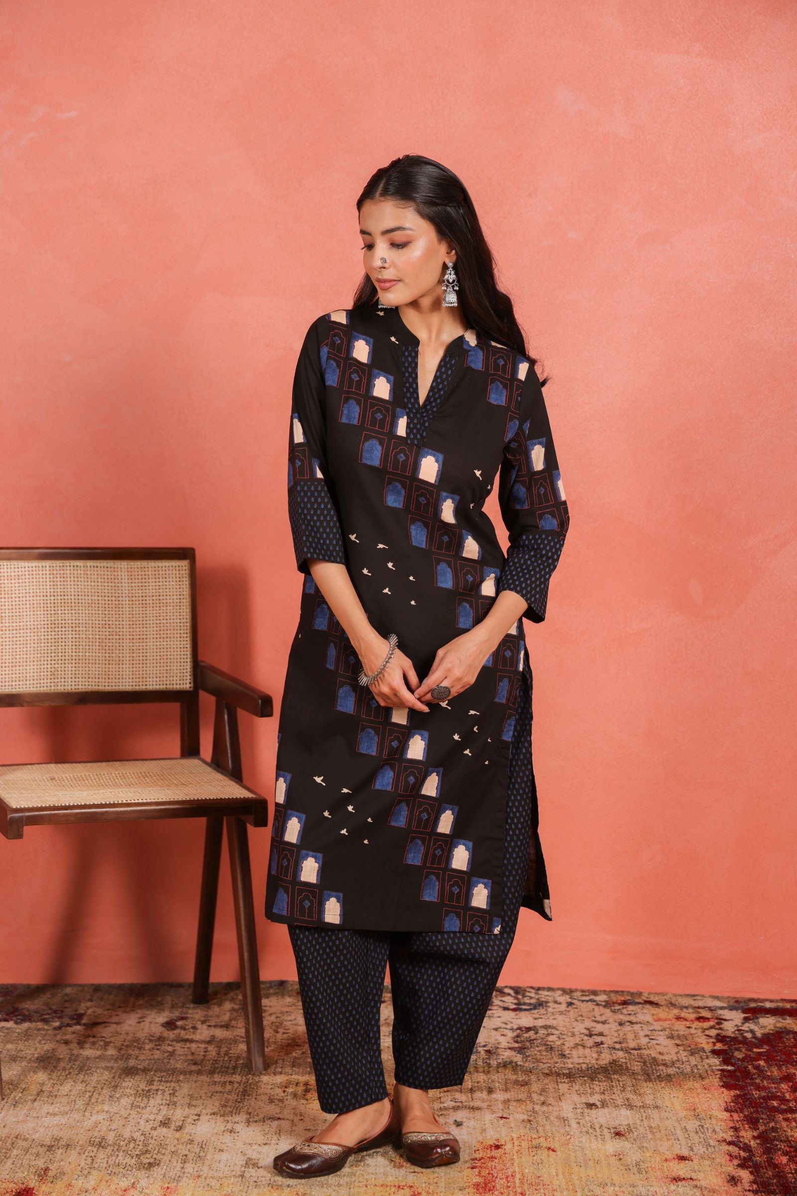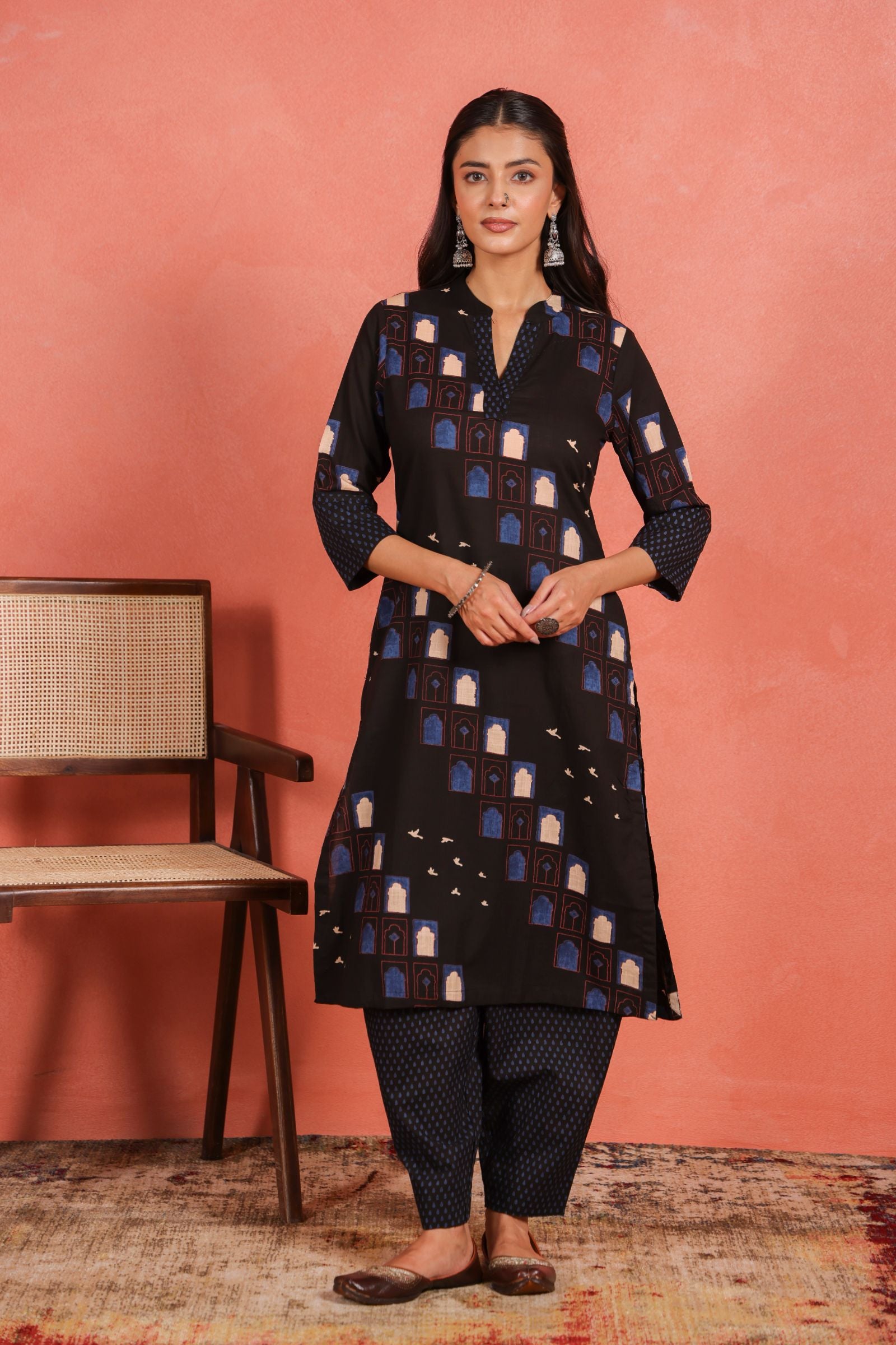 The straight-cut kurta features a calf-length design, 3/4th sleeves, and a mandarin collar, providing a subtle sophistication without compromising ease of movement. Paired with Afghani-style pants, this ensemble ensures relaxed comfort and a modern ethnic aesthetic suitable for casual gatherings, office wear, or everyday outings.