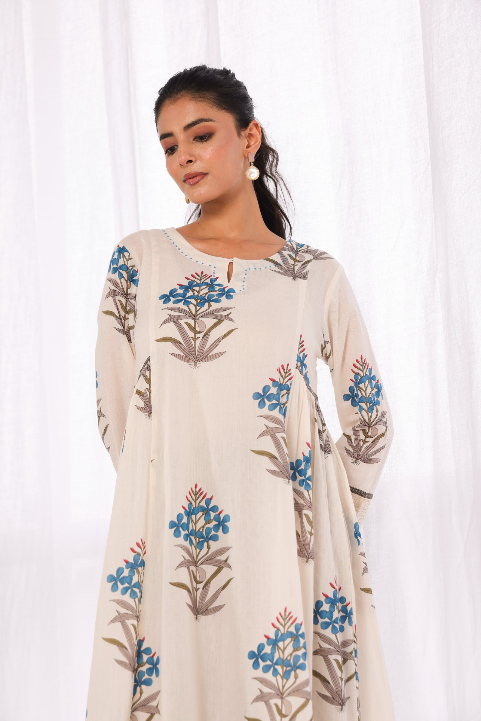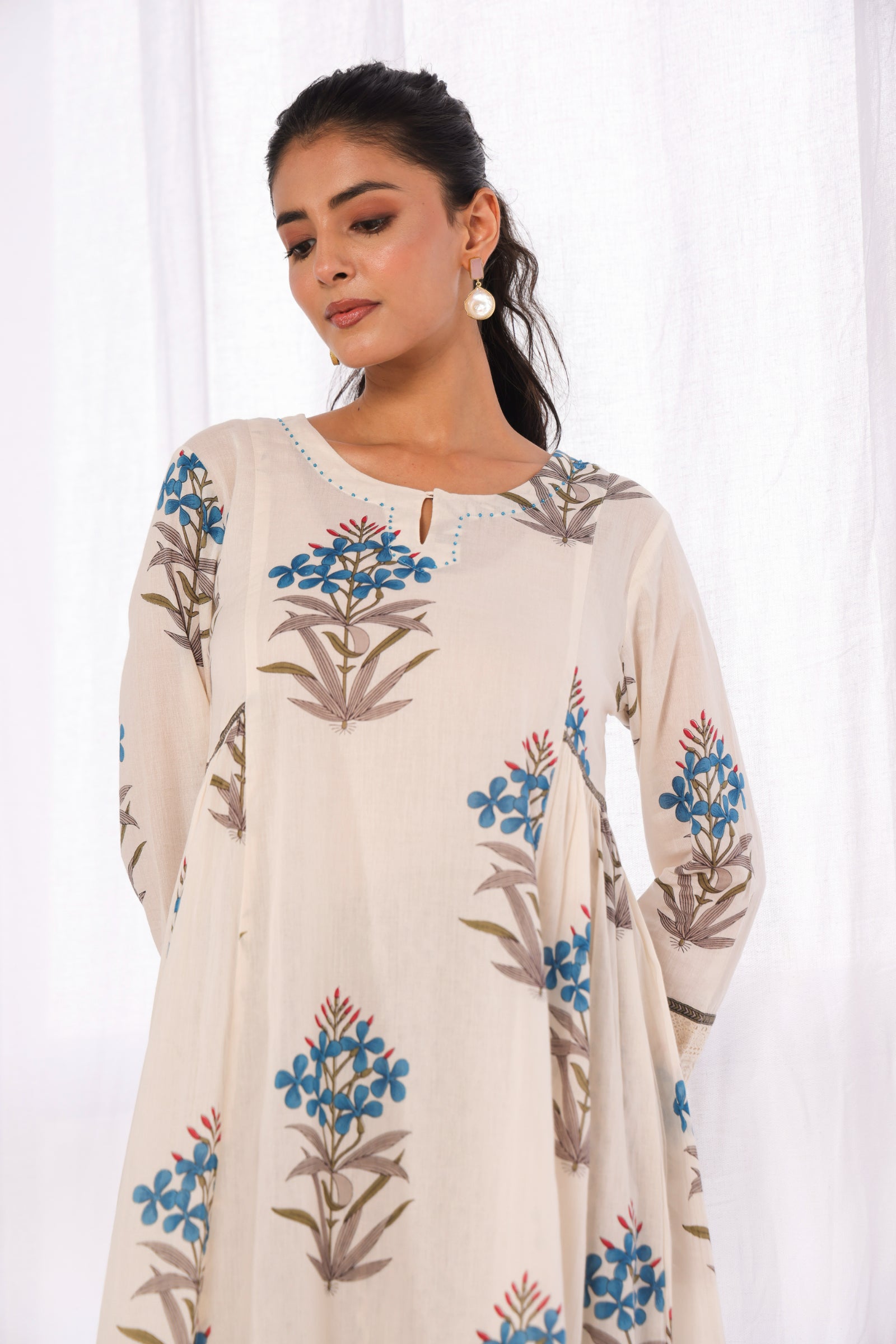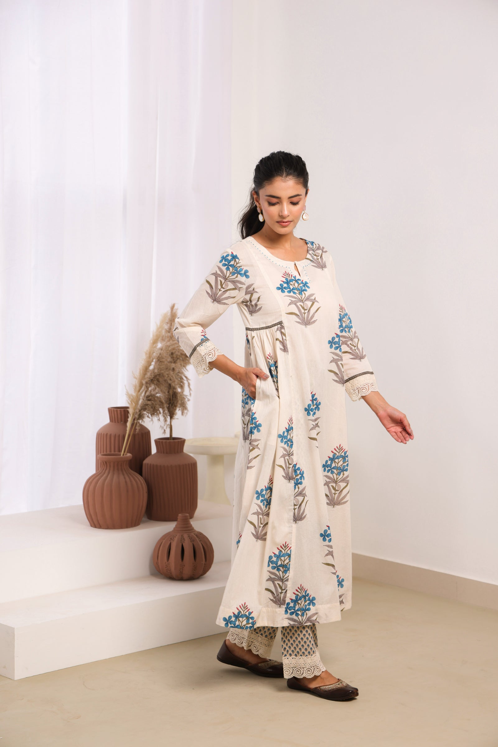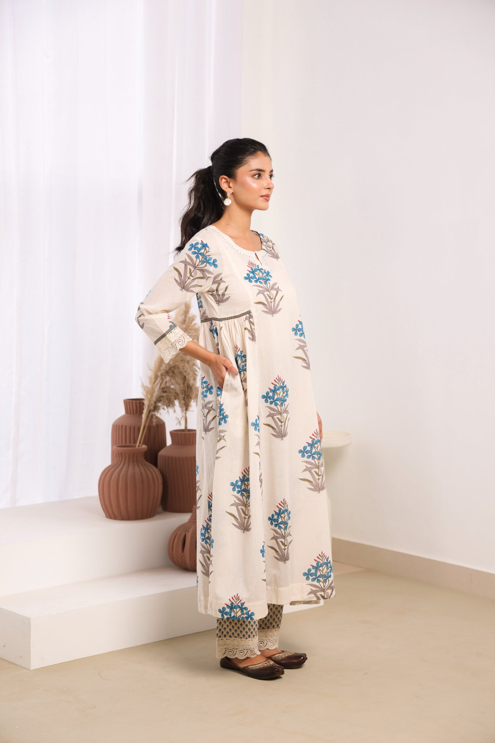 Cream Mul Cotton Gathered Kurta with Blue Floral Motifs, Lace & Bead Work – Pant Set