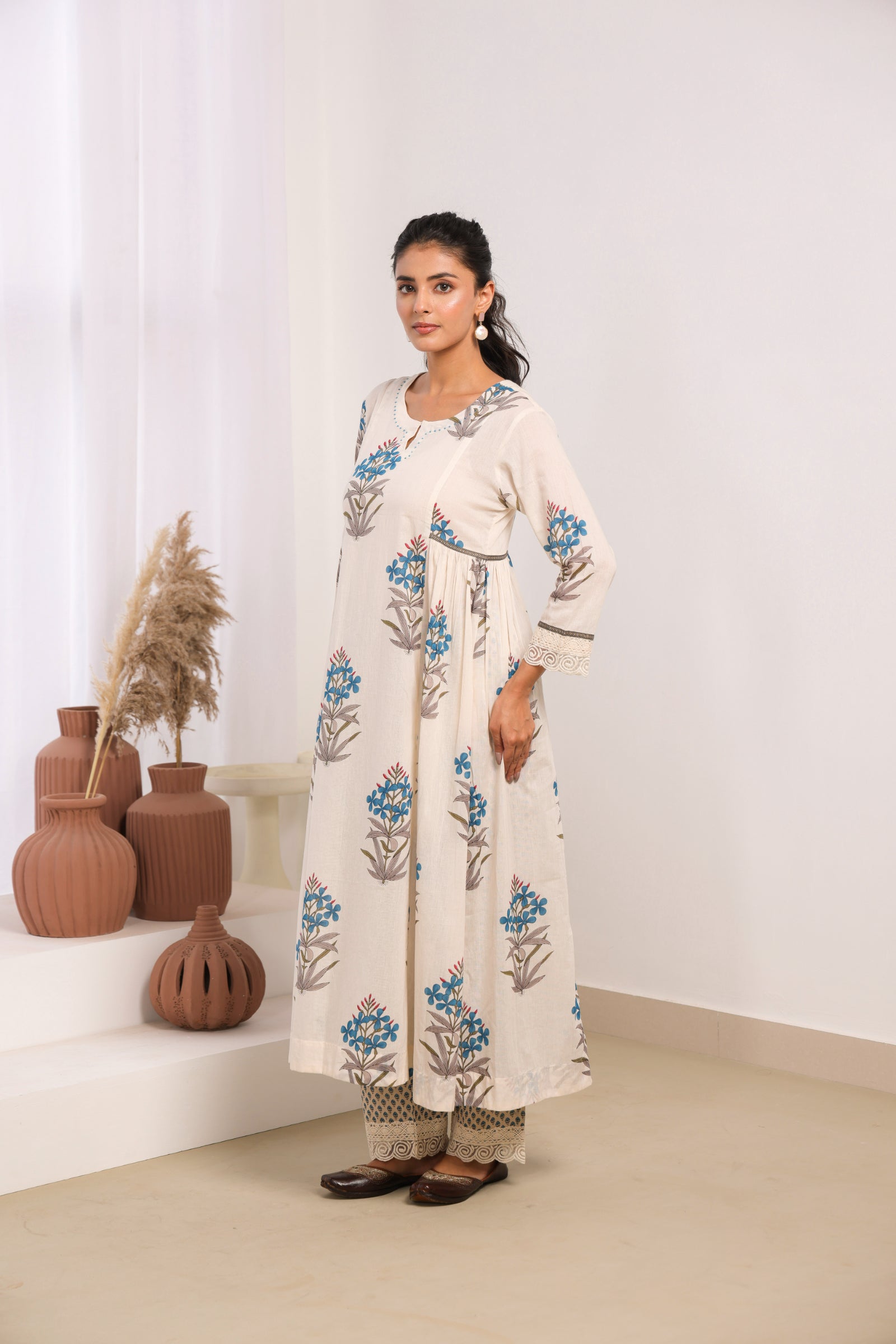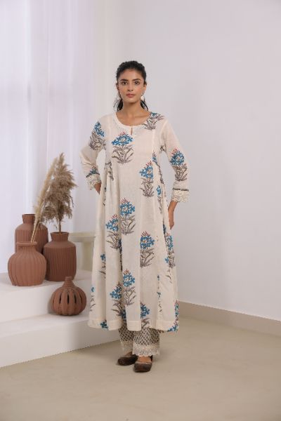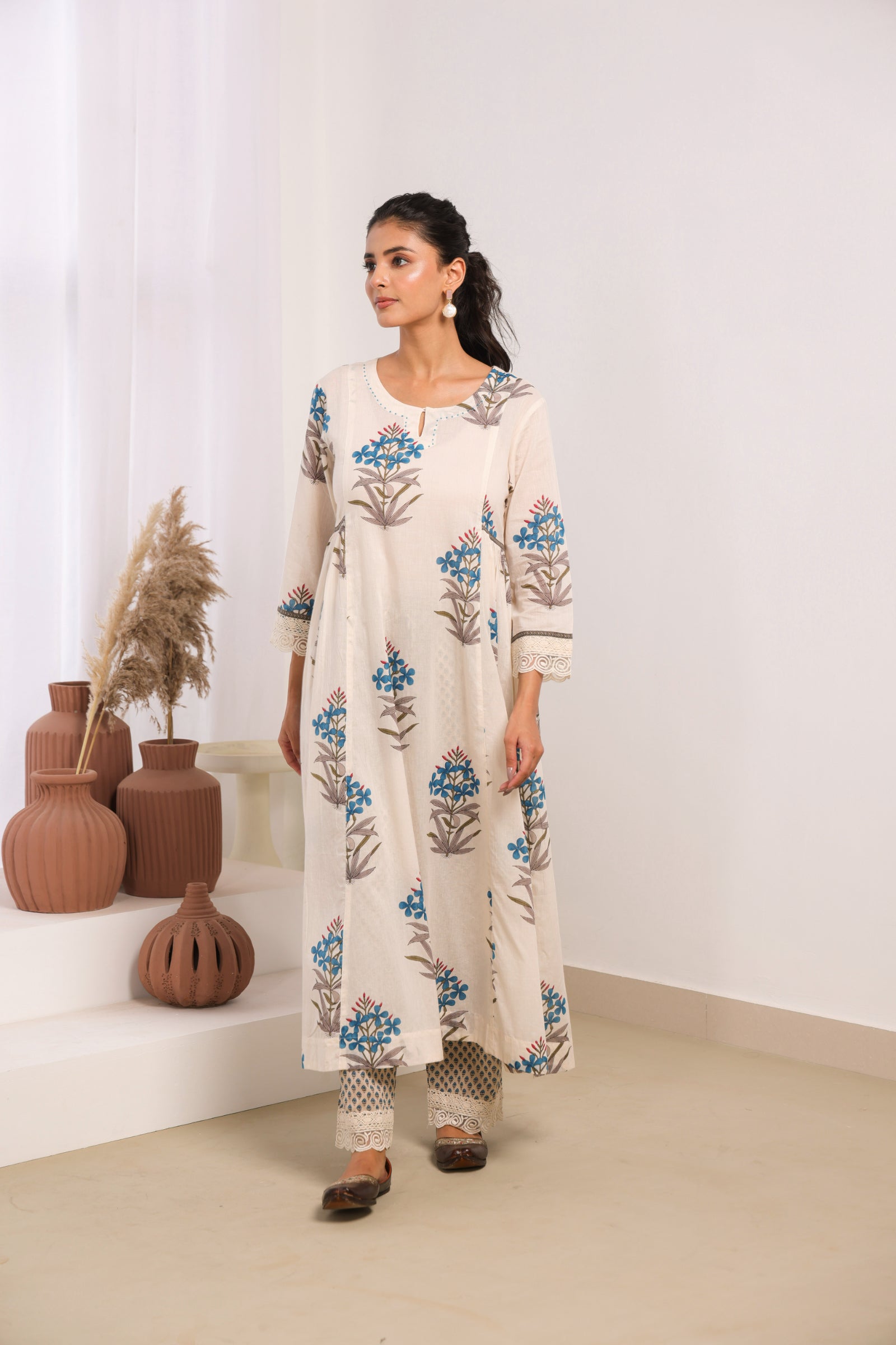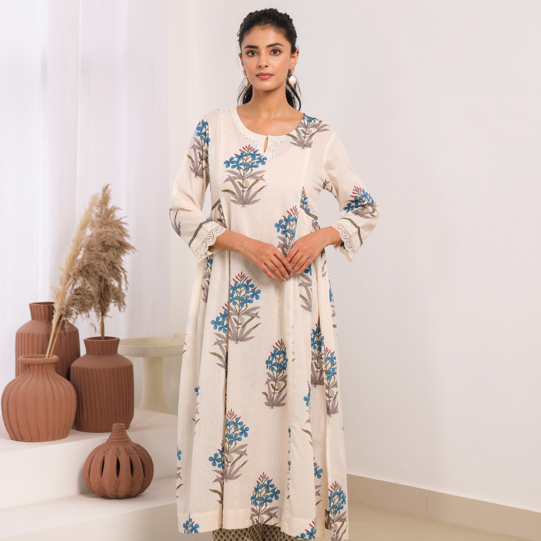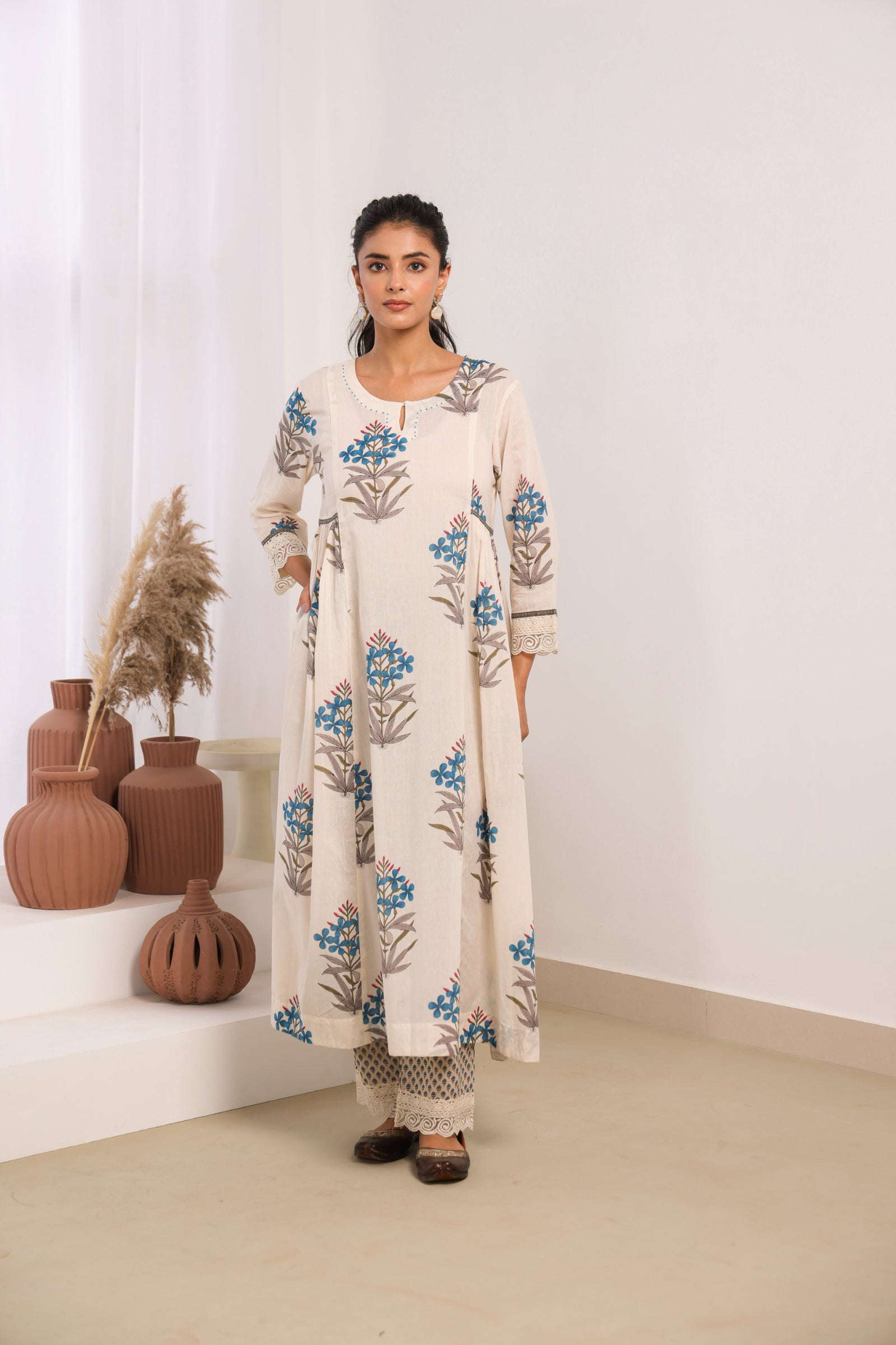 Cream Mul Cotton Gathered Kurta with Blue Floral Motifs, Lace & Bead Work – Pant Set