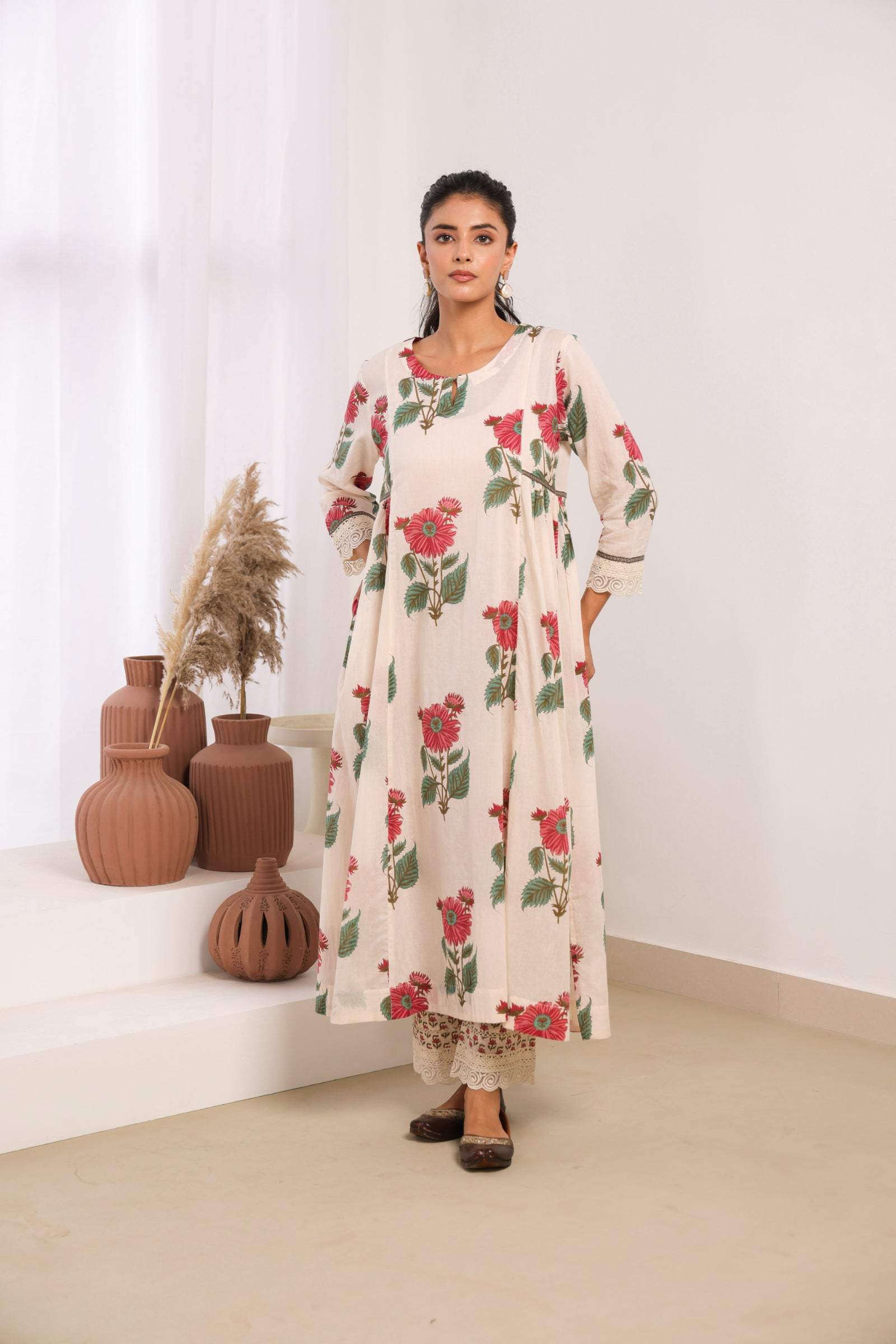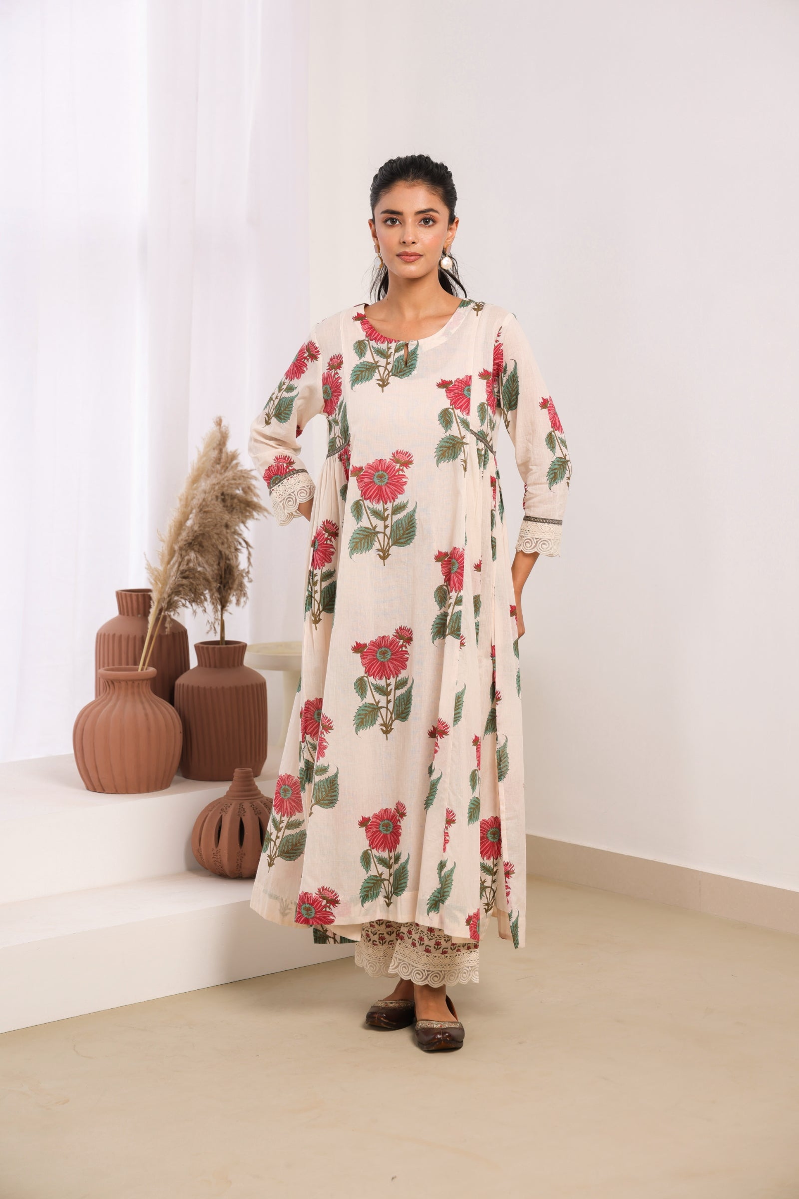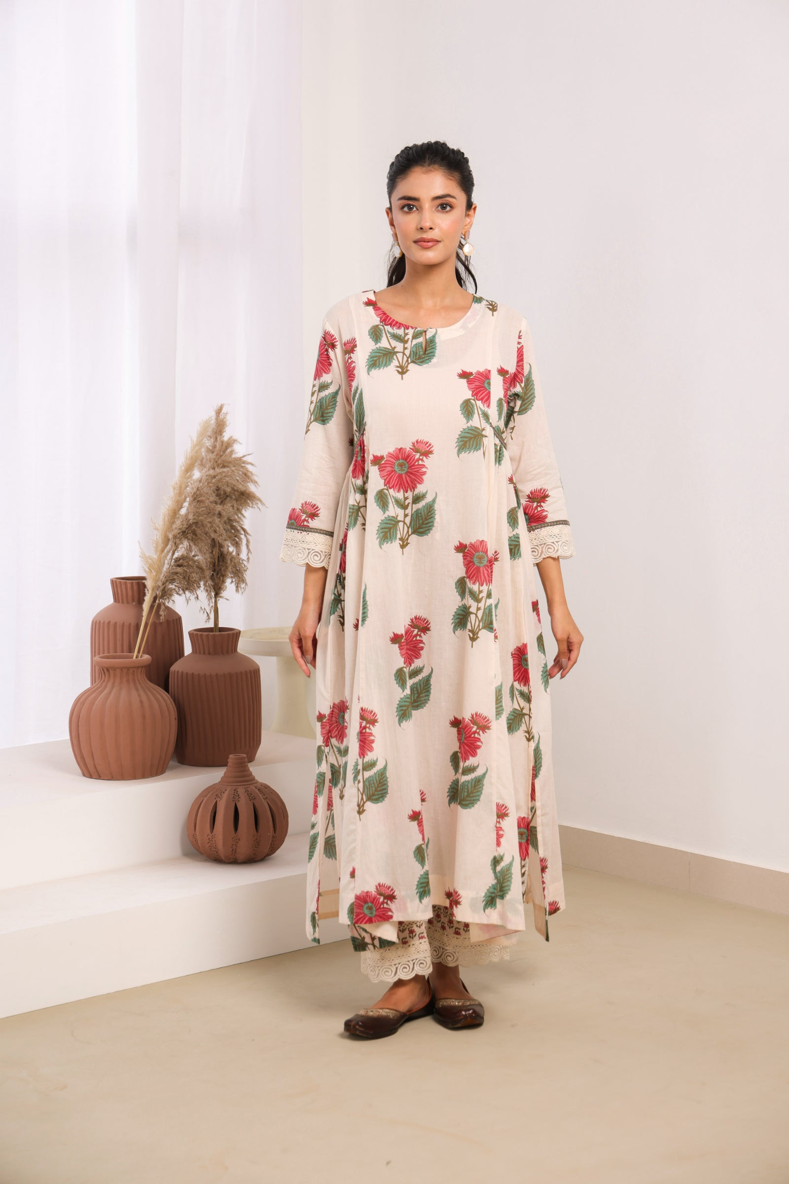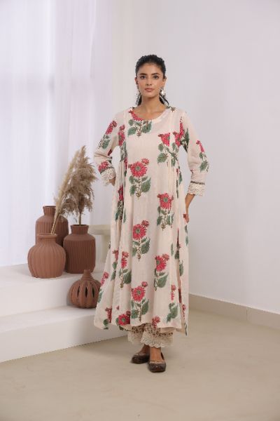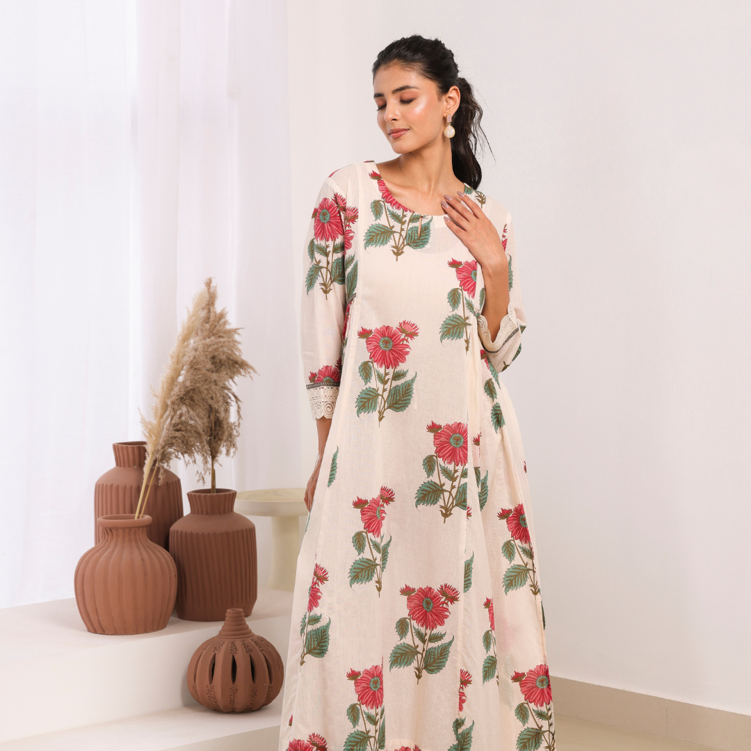 Elegant cream mul cotton kurta set adorned with delicate pink floral motifs, sophisticated lace detailing on the sleeves and pant, and intricate bead work on the neckline. This traditional Indian ethnic wear ensemble blends authentic craftsmanship with contemporary aesthetics, making it perfect for both casual and semi-formal occasions. The calf-length kurta with 3/4th sleeves and round neck offers a comfortable, regular gathered fit that flatters all body types. Ideal for Indian festivals, family gatherings, office wear, and cultural celebrations.