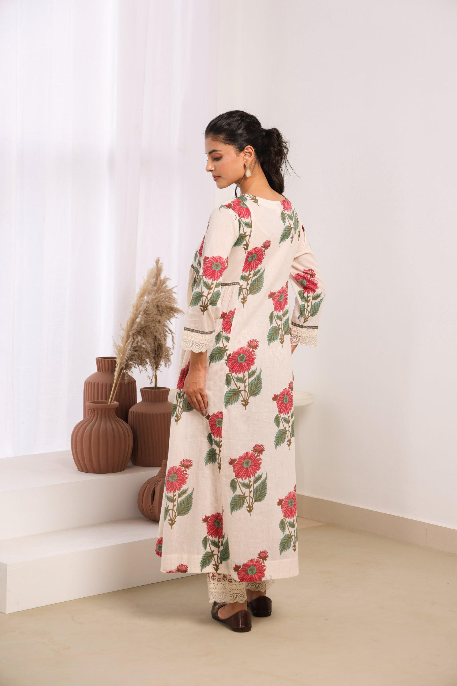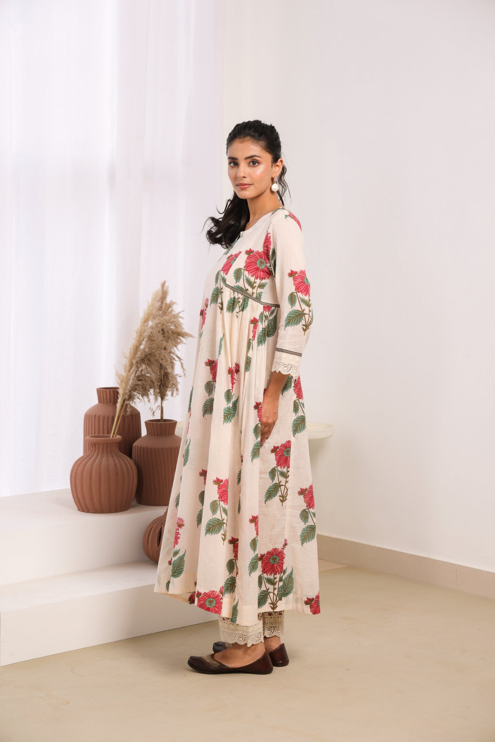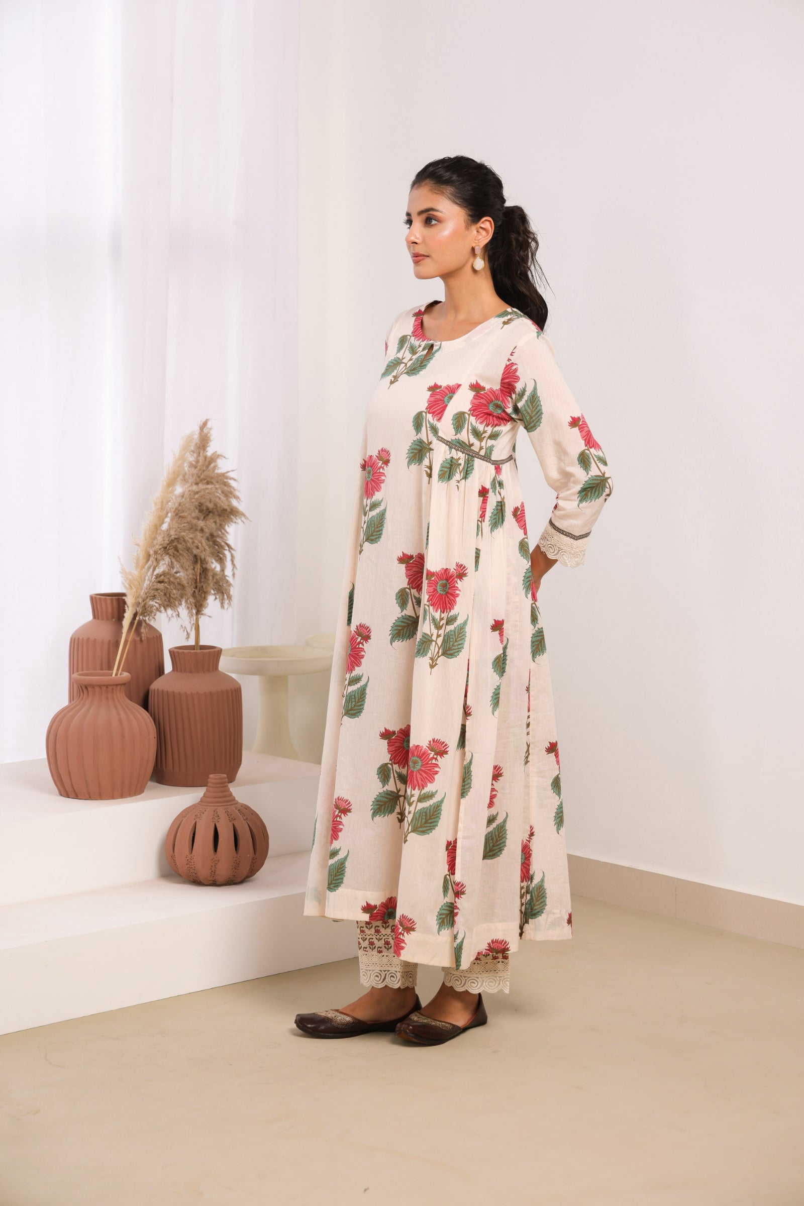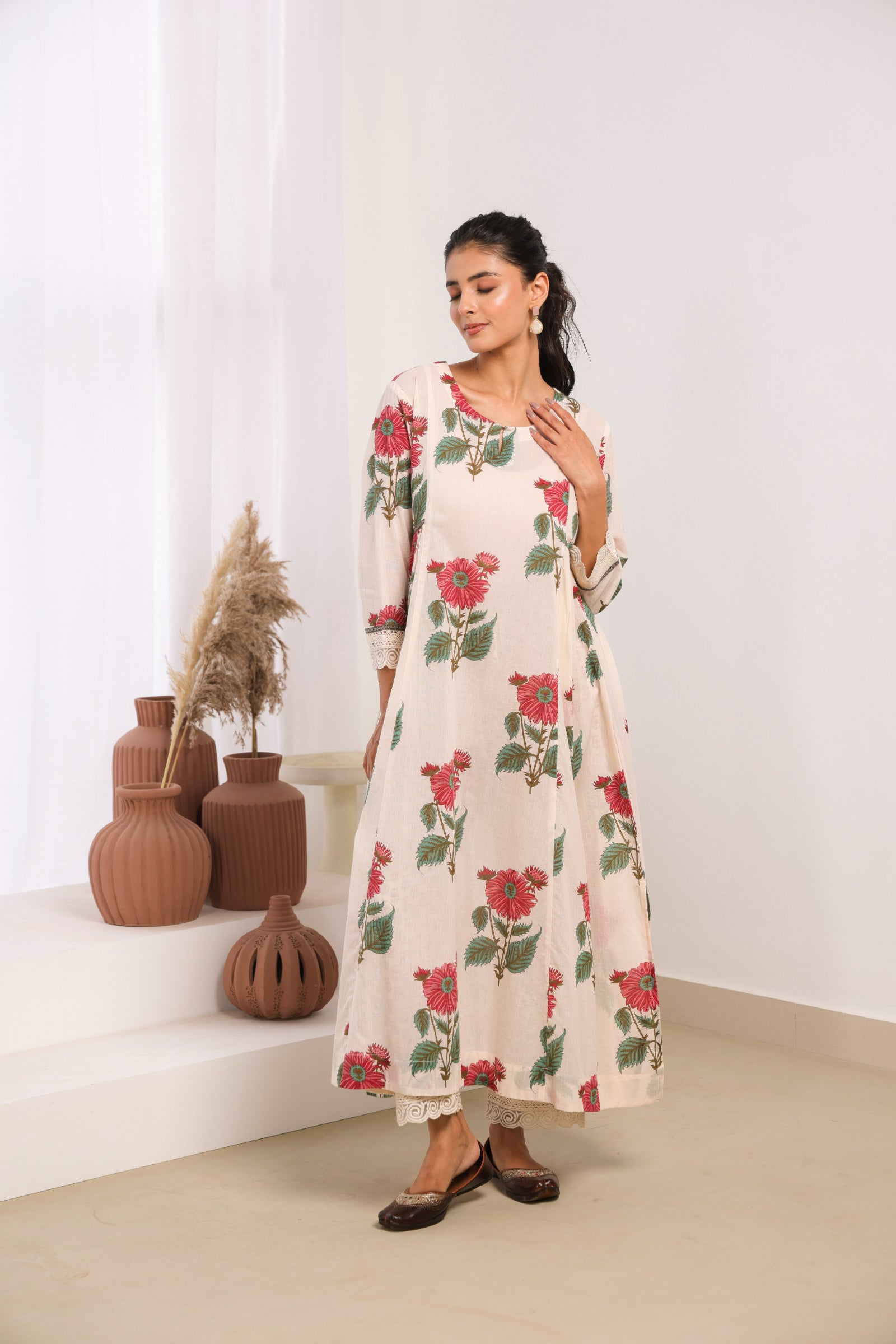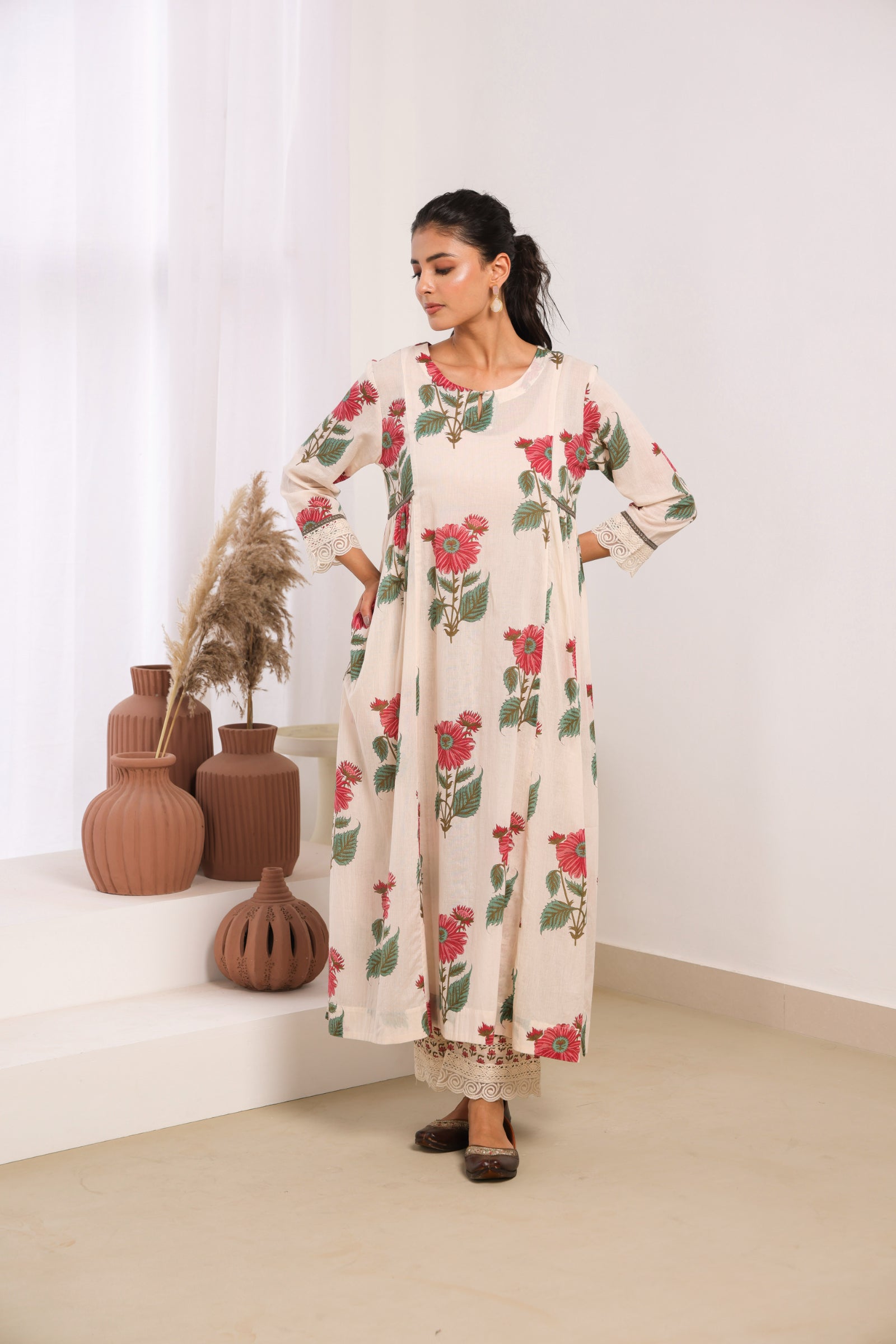 Elegant cream mul cotton kurta set adorned with delicate pink floral motifs, sophisticated lace detailing on the sleeves and pant, and intricate bead work on the neckline. This traditional Indian ethnic wear ensemble blends authentic craftsmanship with contemporary aesthetics, making it perfect for both casual and semi-formal occasions. The calf-length kurta with 3/4th sleeves and round neck offers a comfortable, regular gathered fit that flatters all body types. Ideal for Indian festivals, family gatherings, office wear, and cultural celebrations.