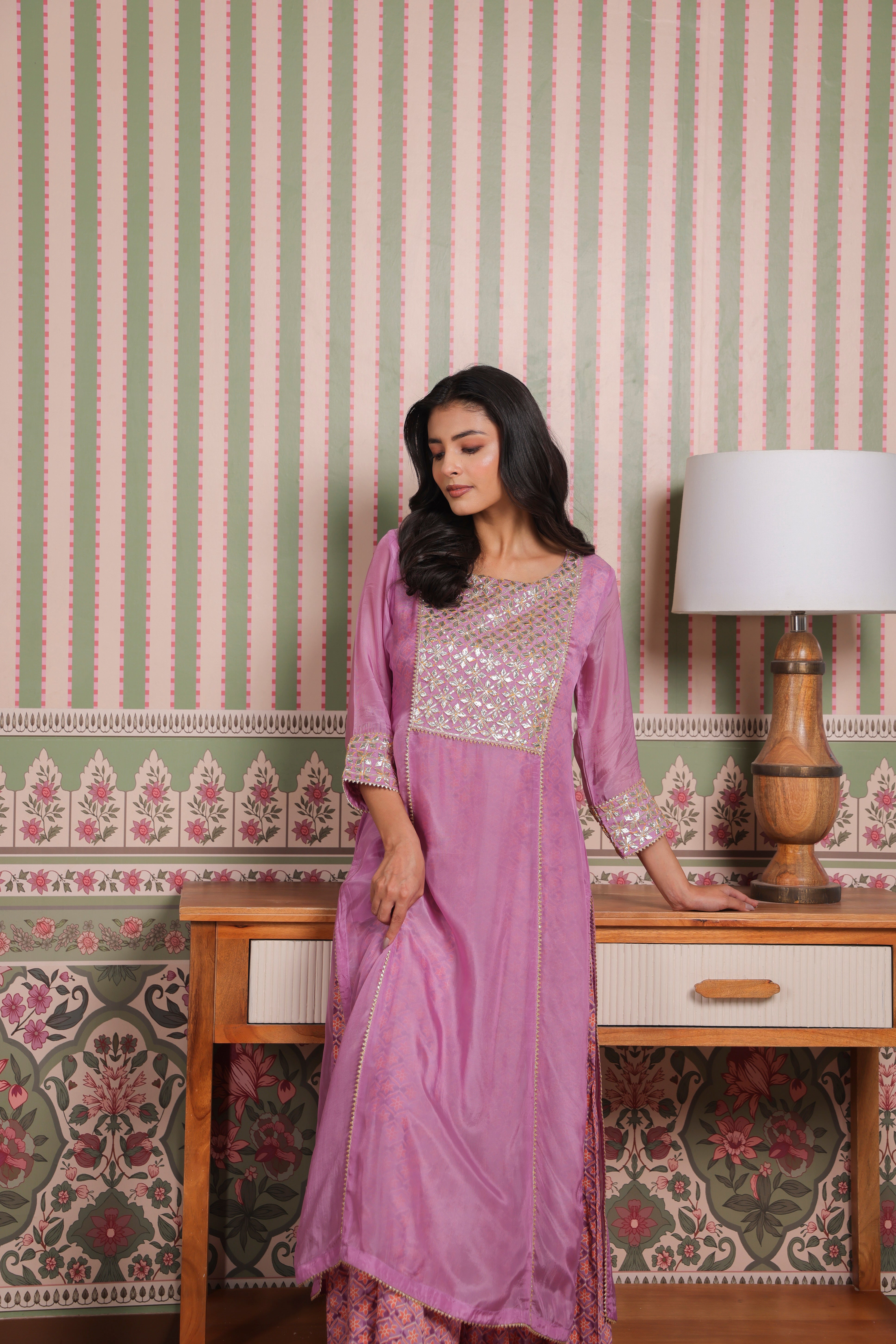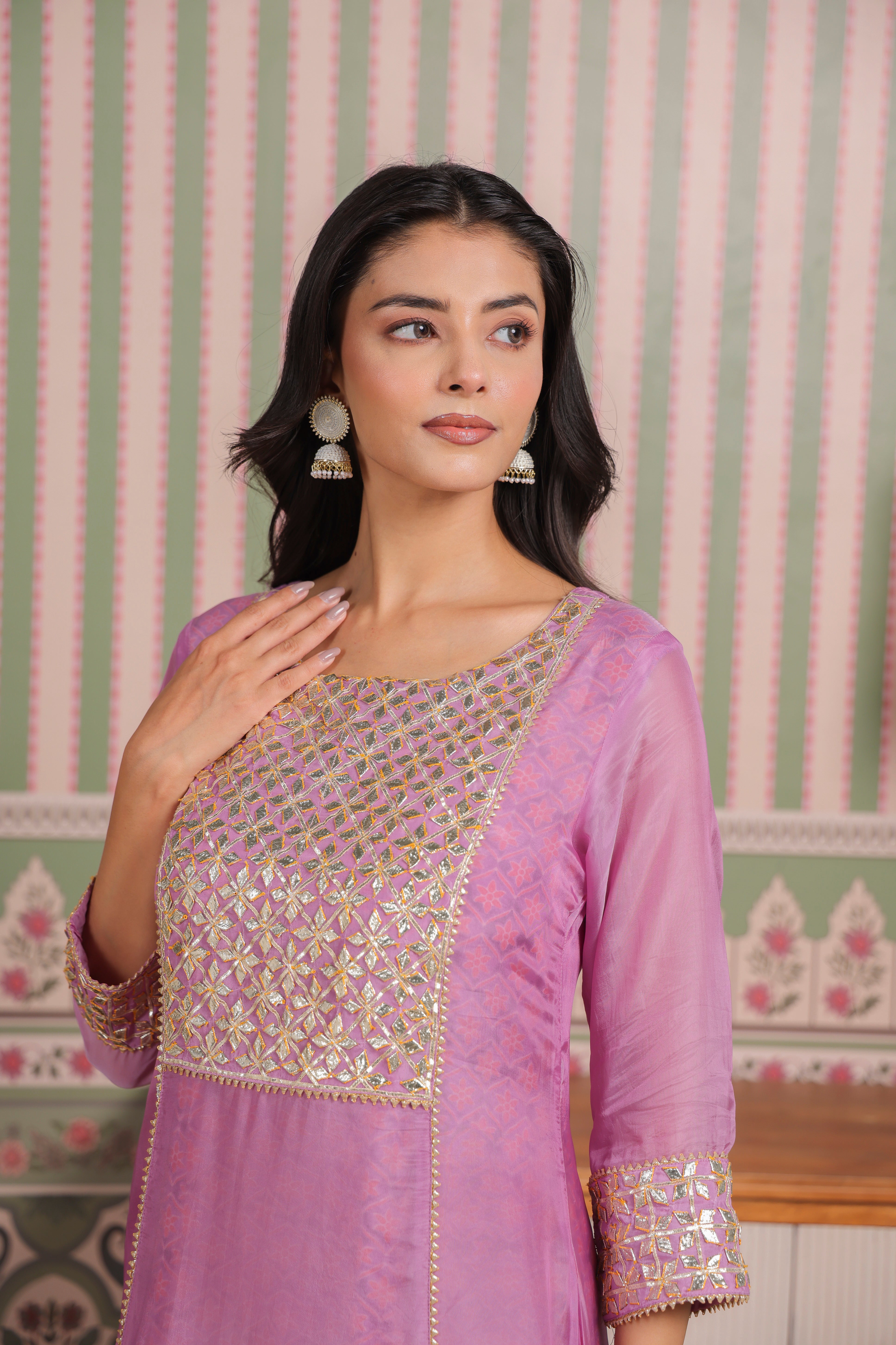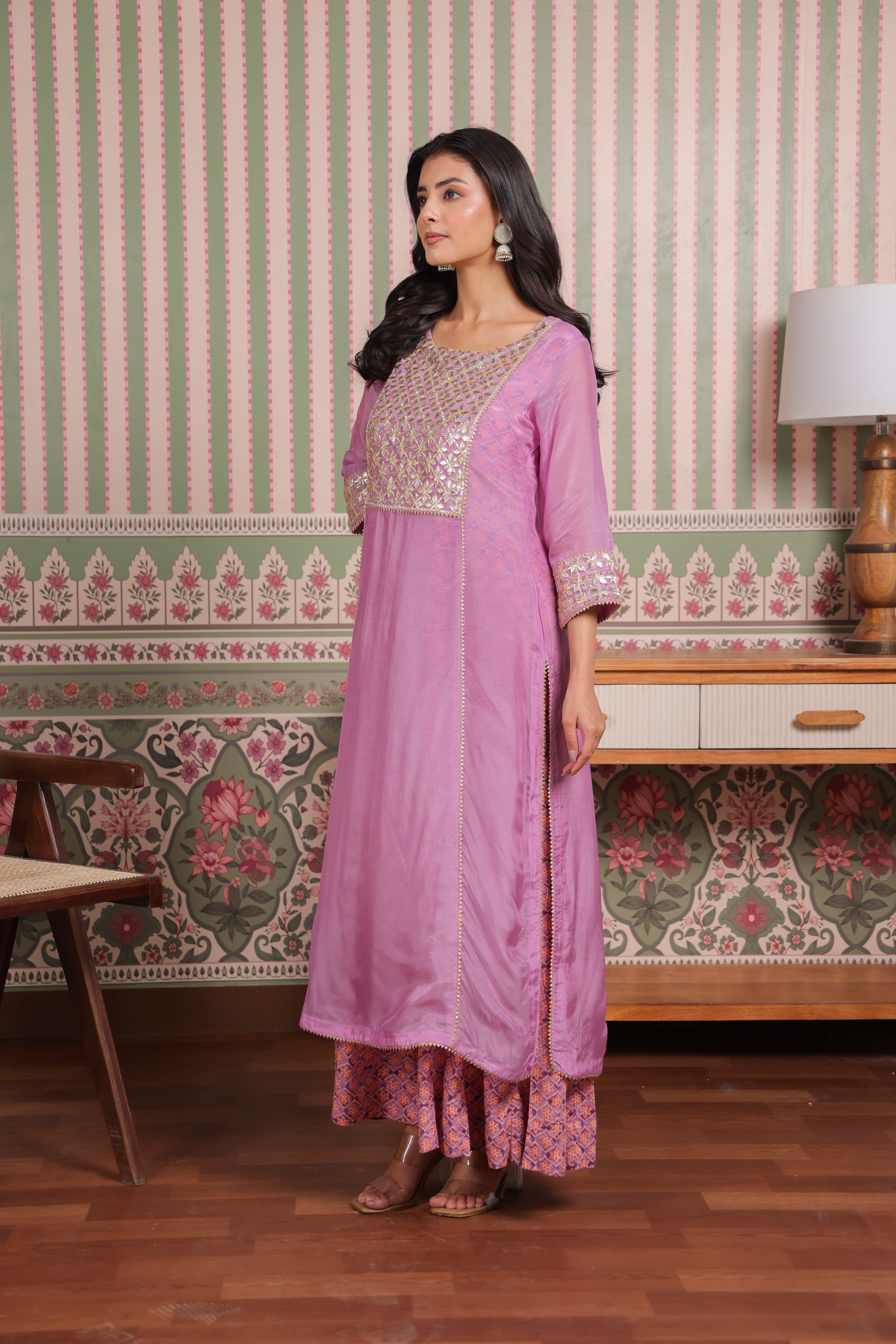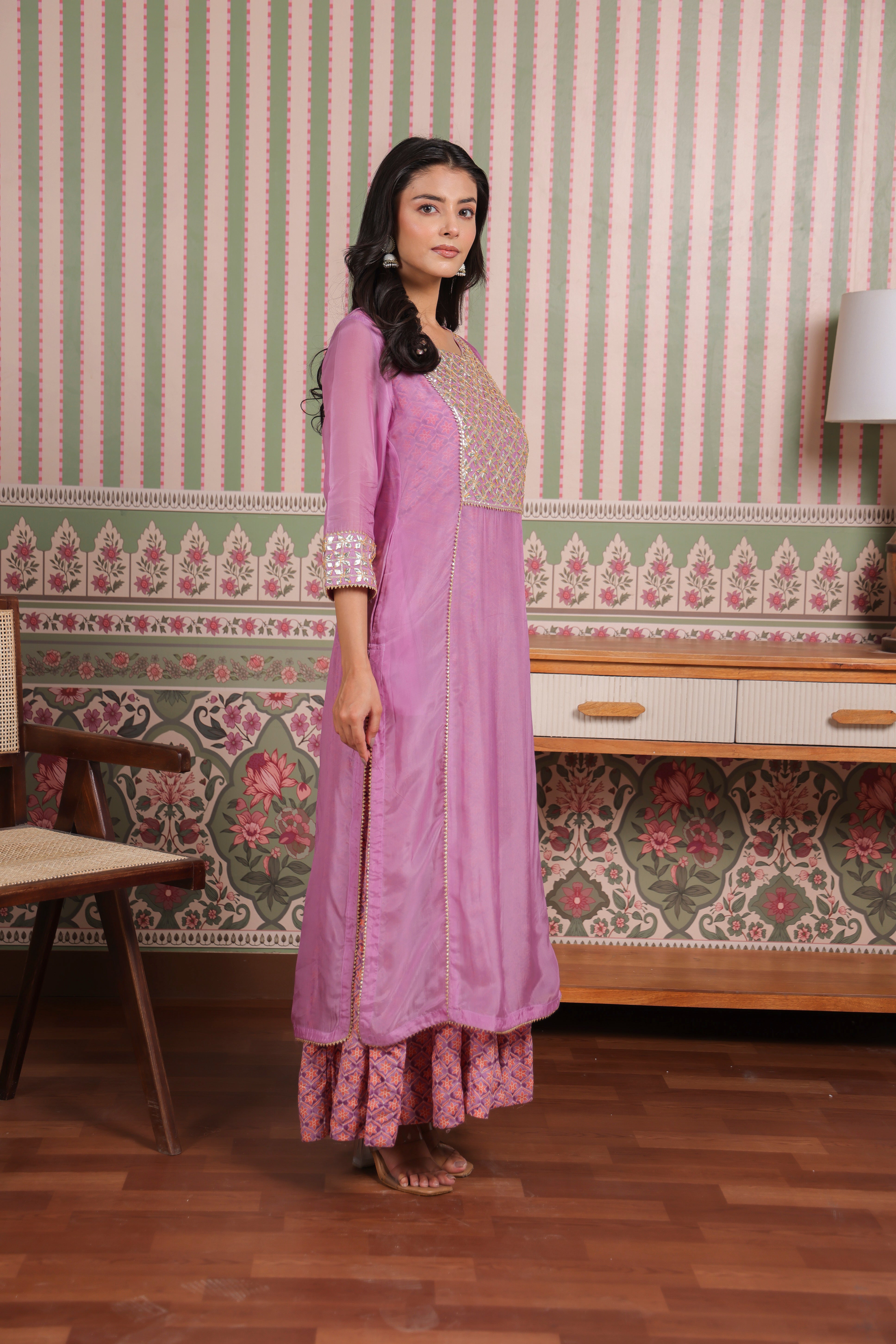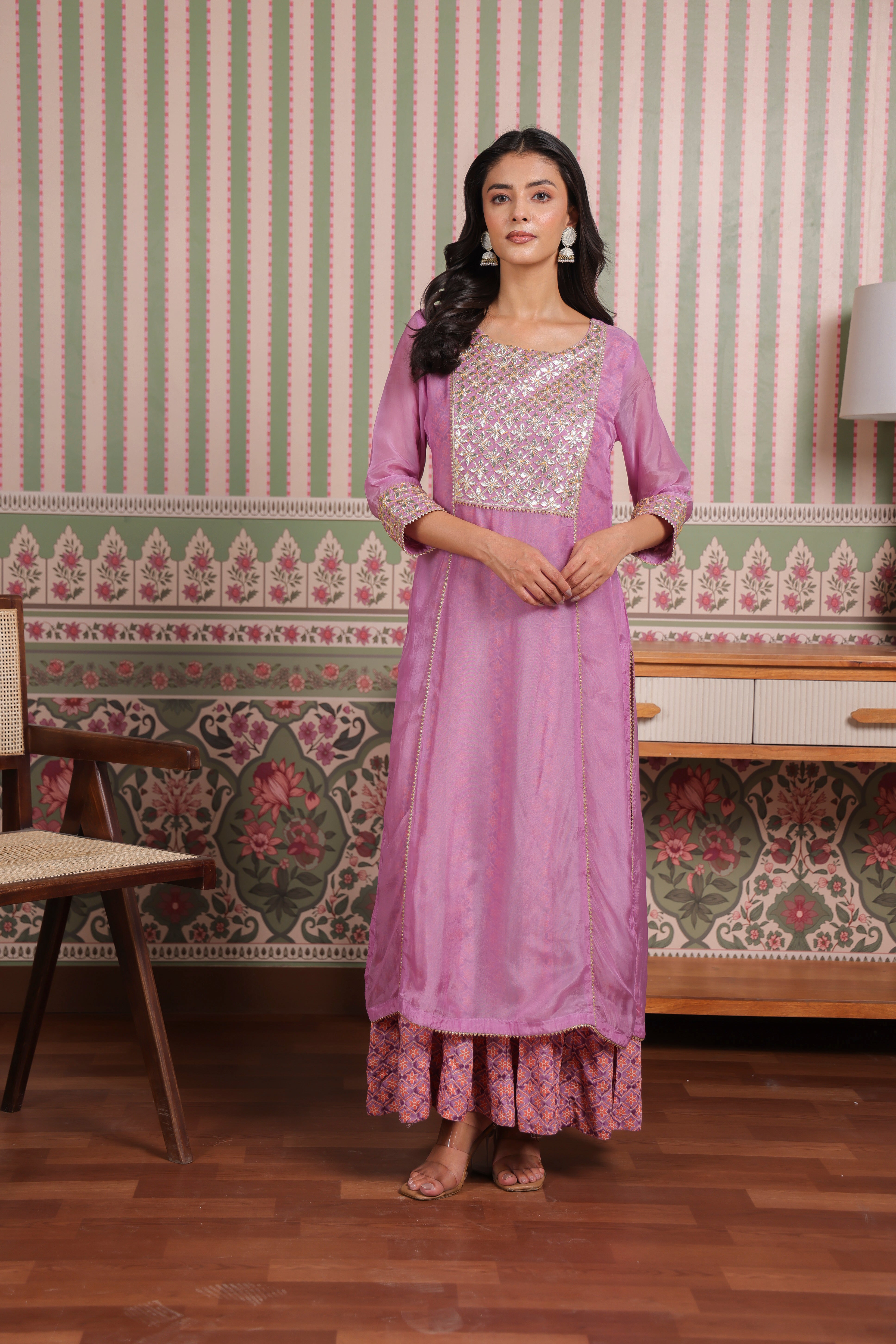 Exquisite mauve double-layered kurta featuring organza in the upper part and modal in the lower part, adorned with Gota Patti embroidery on the yoke and sleeves. This unique Indian designer kurta creates a beautiful layered effect while maintaining comfort and elegance. Perfect for Indian ethnic wear enthusiasts seeking distinctive designs.
