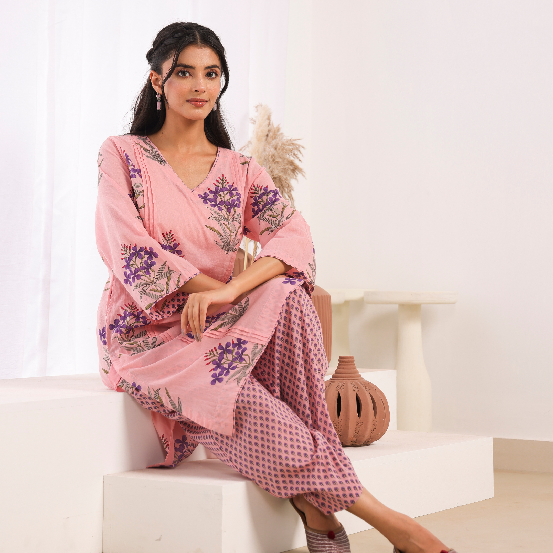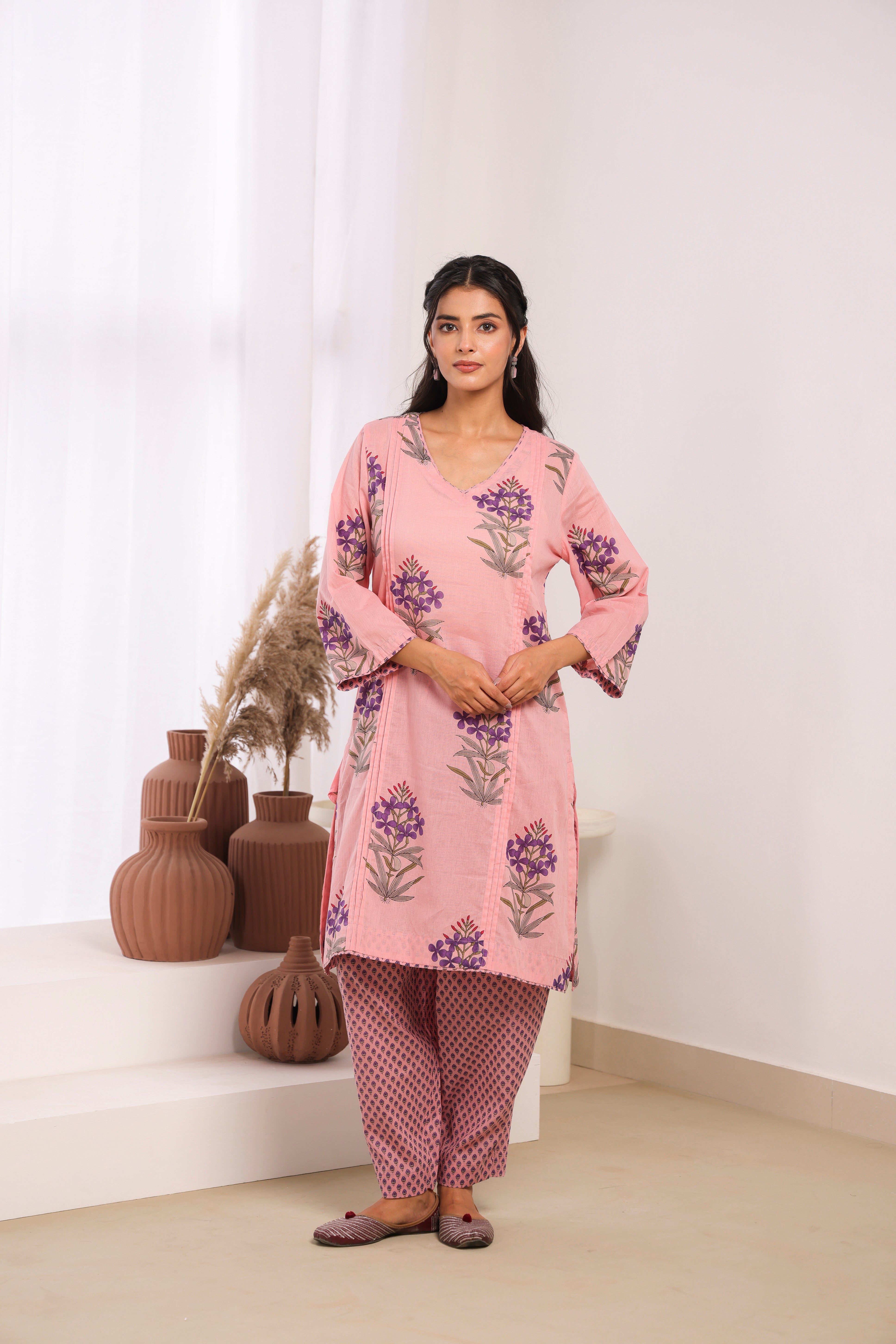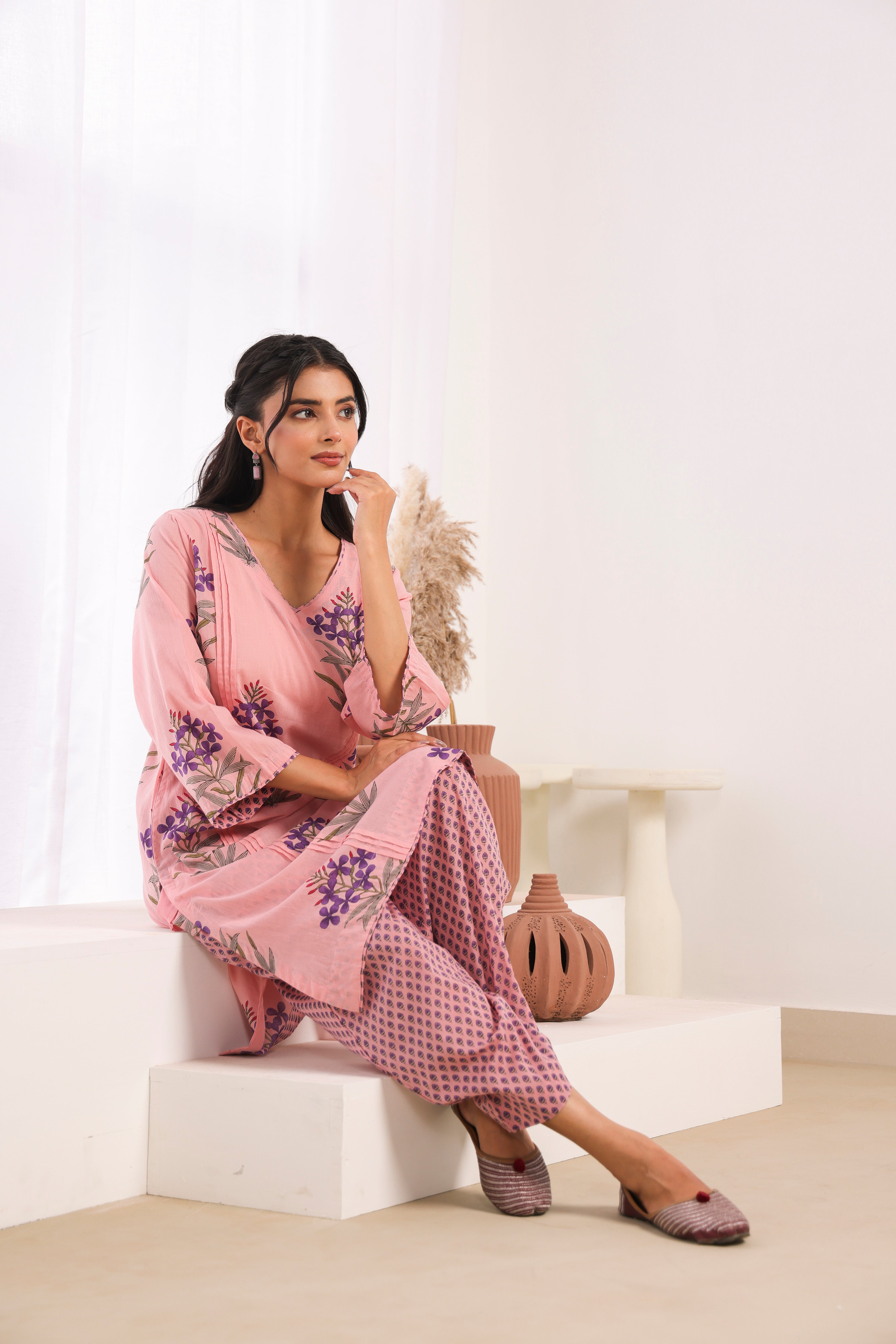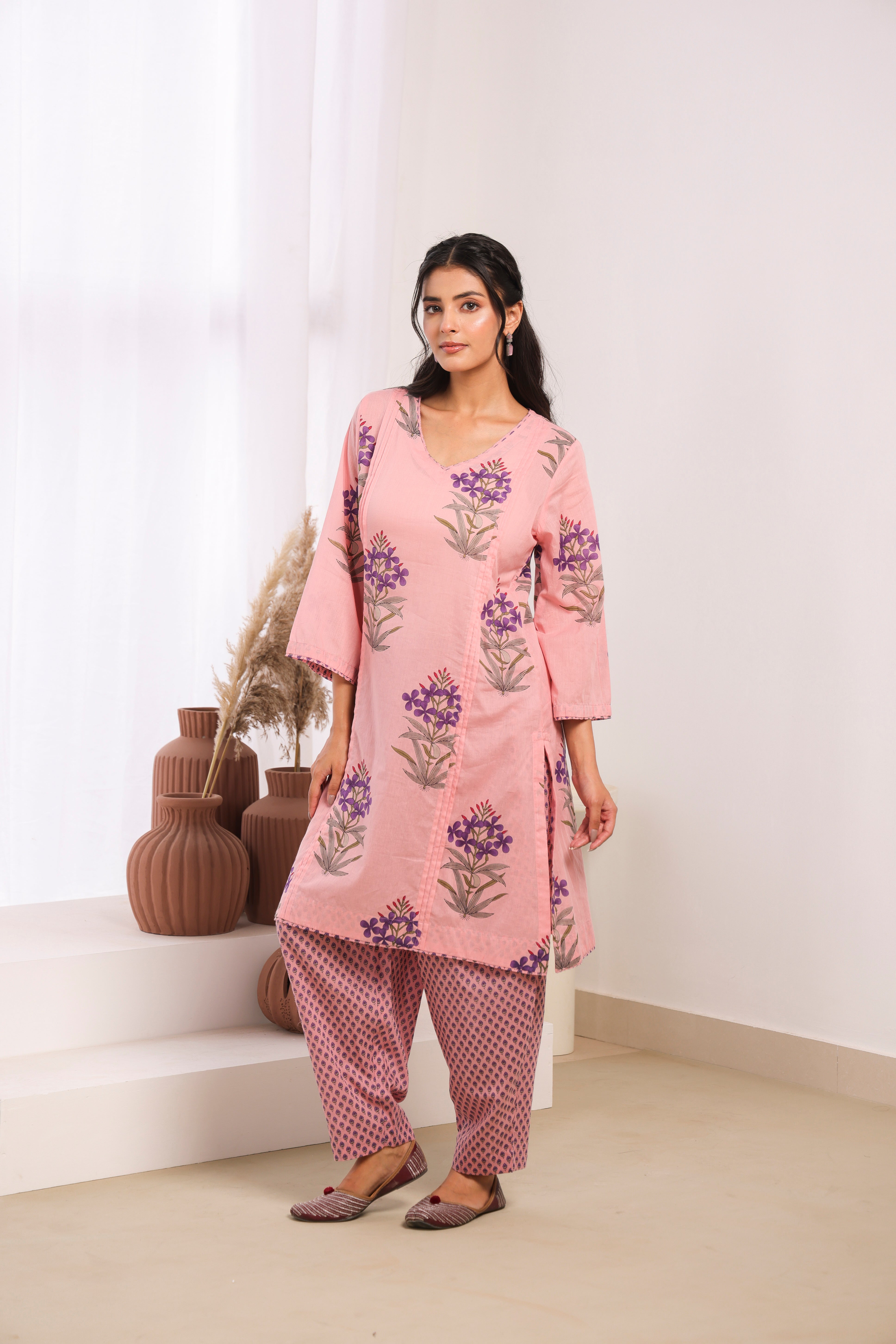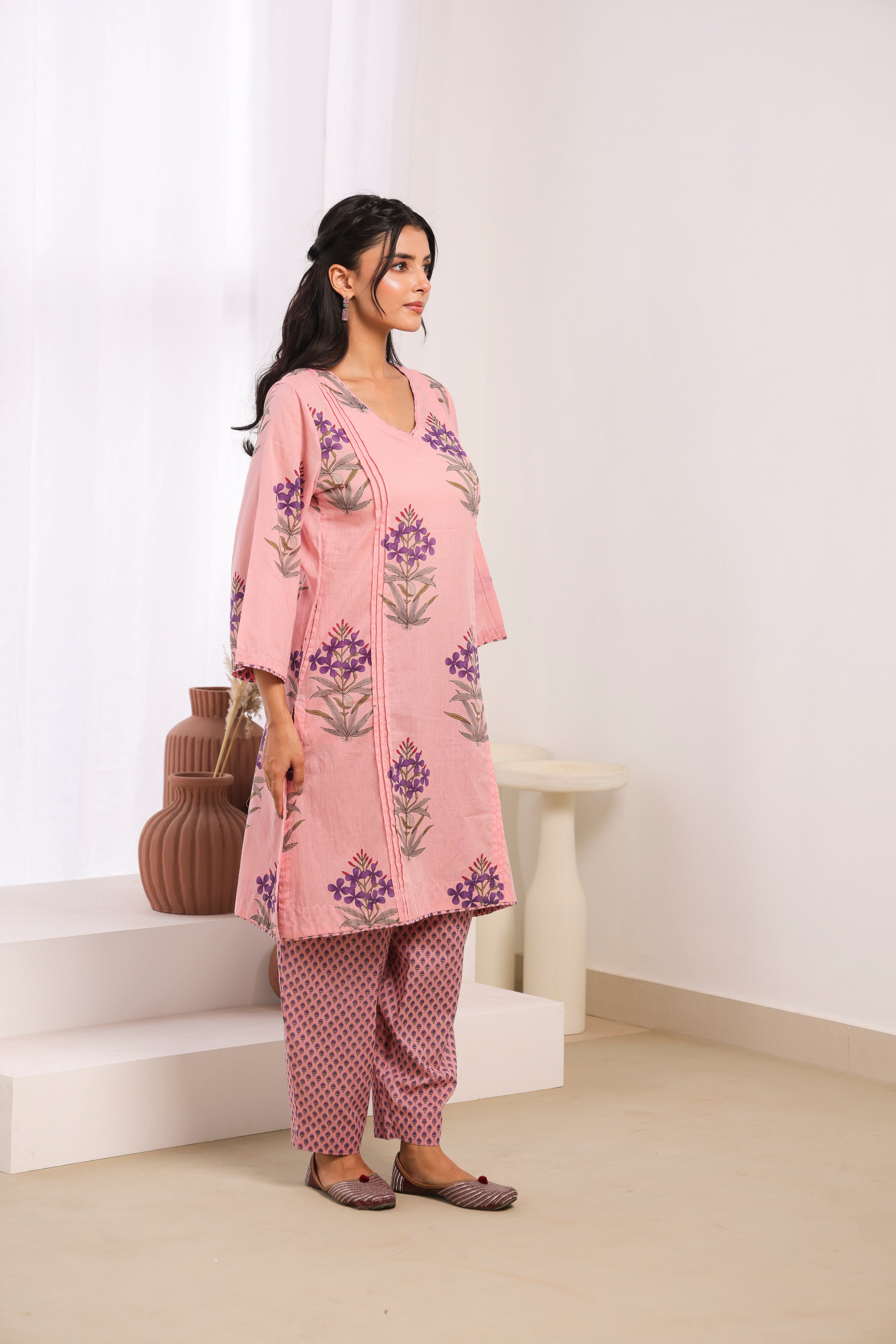 Charming pink printed cotton mulmul kurta set featuring elegant pleats on the front kurta. This lightweight Indian ethnic dress offers exceptional comfort and breathability, making it ideal for daily wear and casual gatherings. The knee-length kurta with 3/4 sleeves and V-neck design creates a modern, flattering silhouette. Perfect for Indian women seeking comfortable ethnic wear for everyday use.