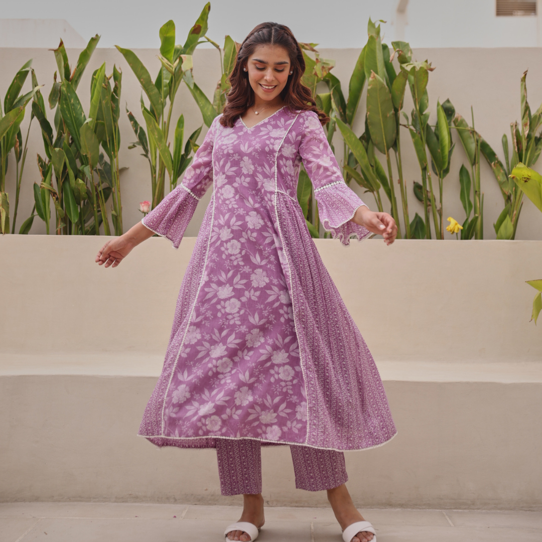 Purple Mul Cotton Gathered Kurta with All-Over Lace Work & Bell Sleeves