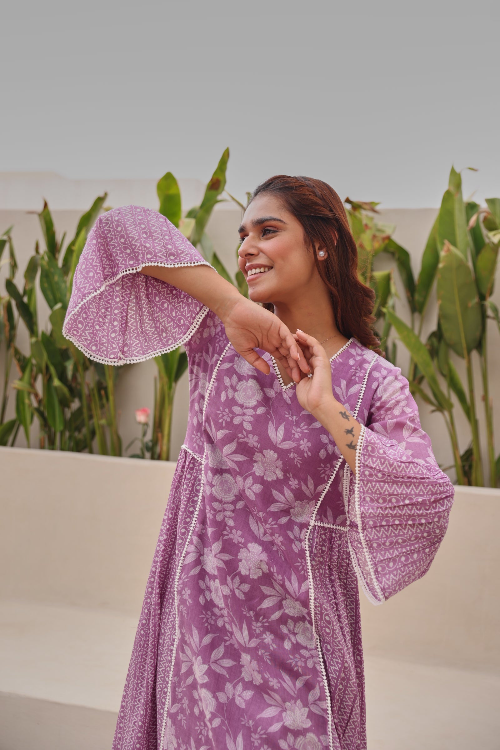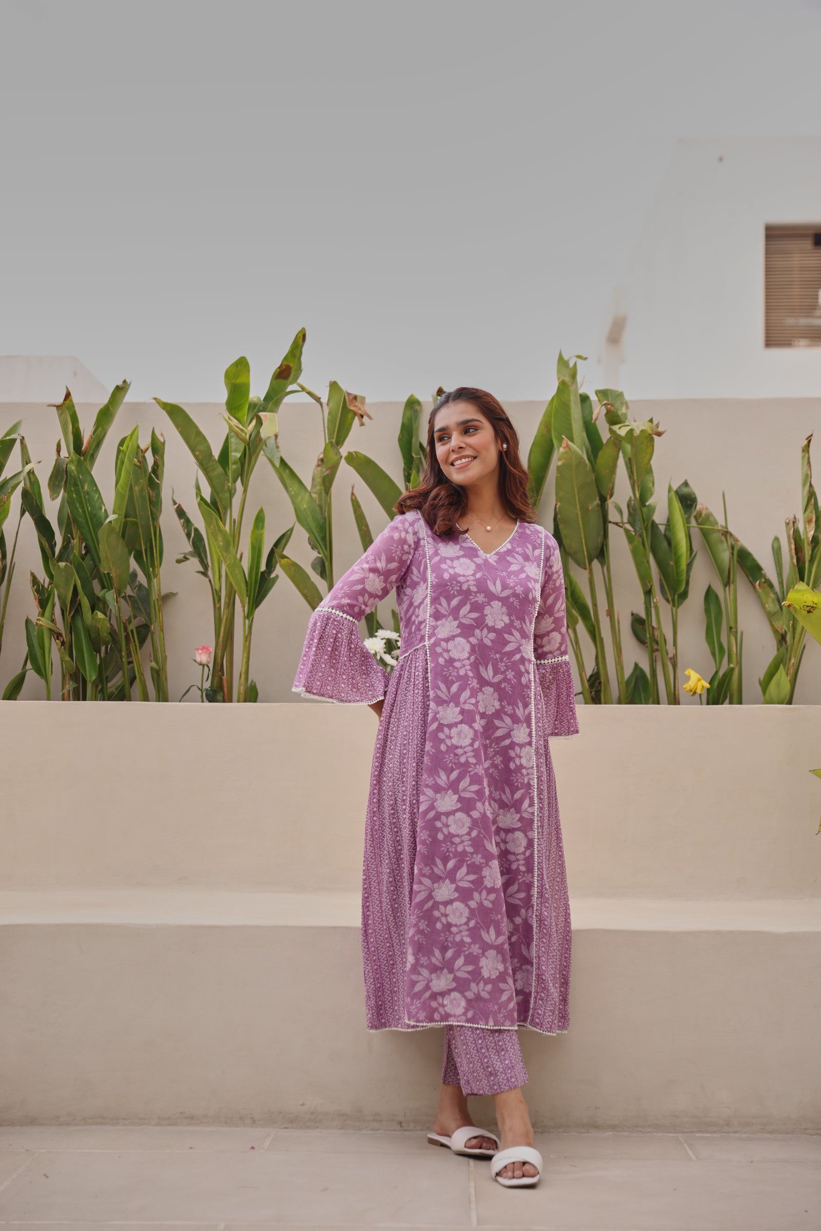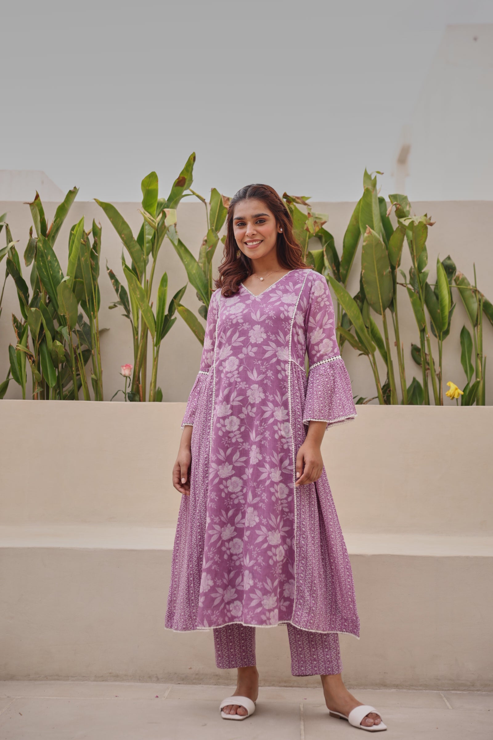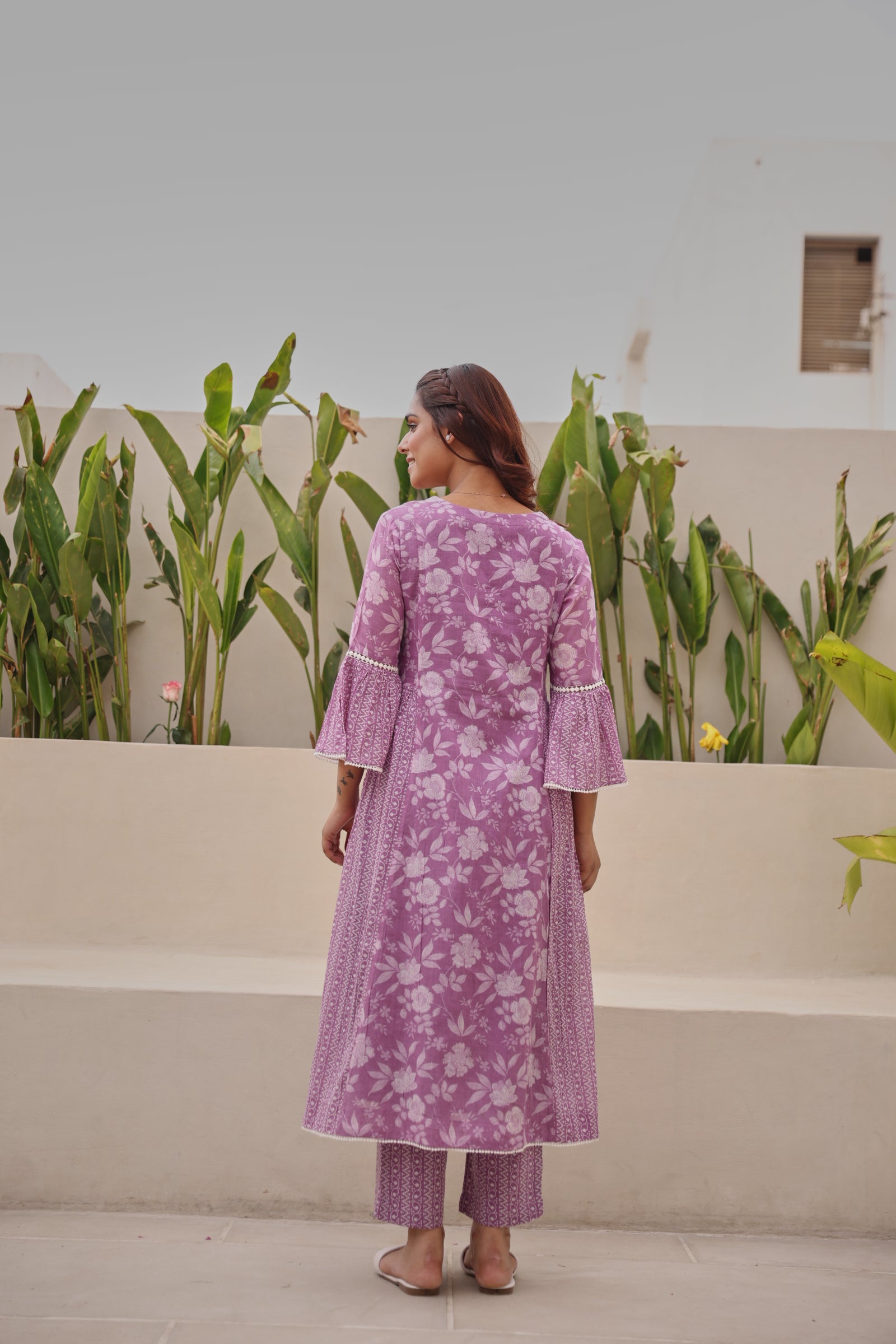Graceful and feminine, this purple mul cotton kurta showcases exquisite all-over lace detailing with elegant bell-shaped sleeves and a flattering gathered silhouette. Designed with a classic V-neckline and calf-length cut, the kurta offers effortless comfort while maintaining a refined ethnic appeal. Crafted from breathable mul cotton, it is ideal for daily wear, festive gatherings, office wear, and casual outings. The soft texture and regular fit ensure ease of movement with a timeless aesthetic.