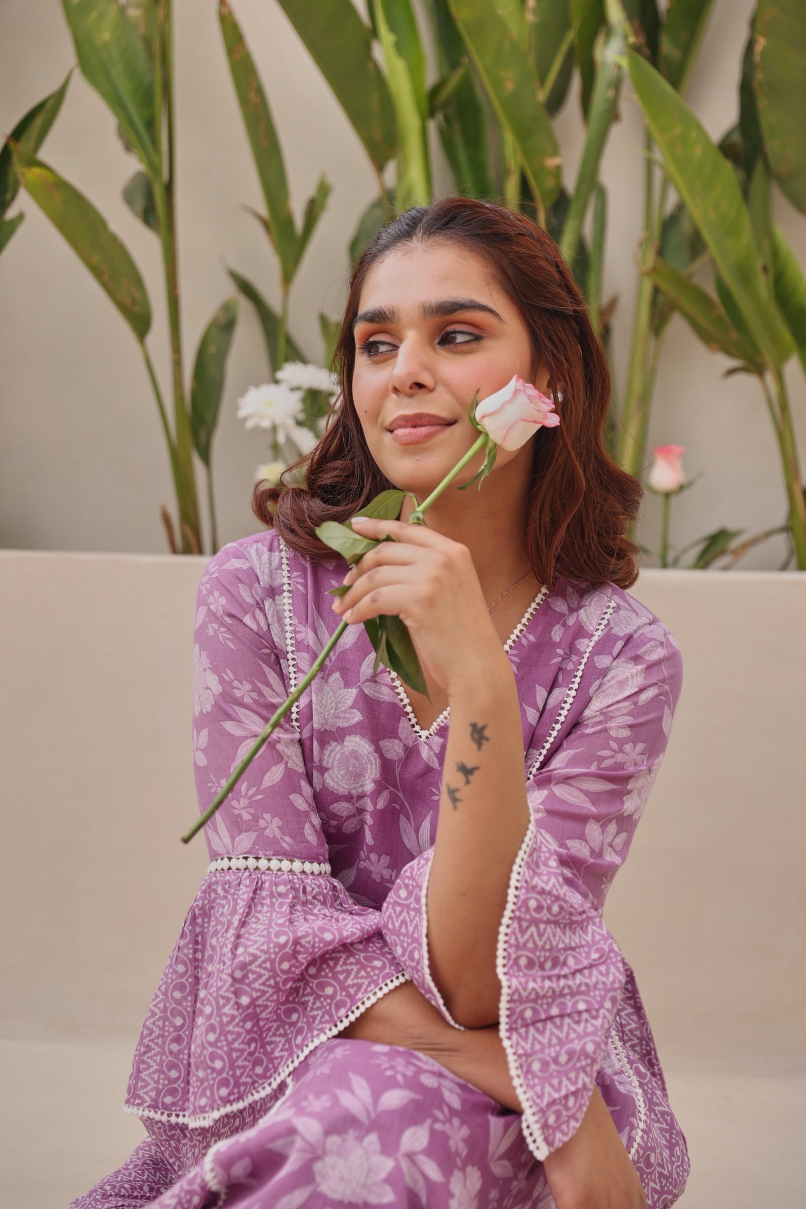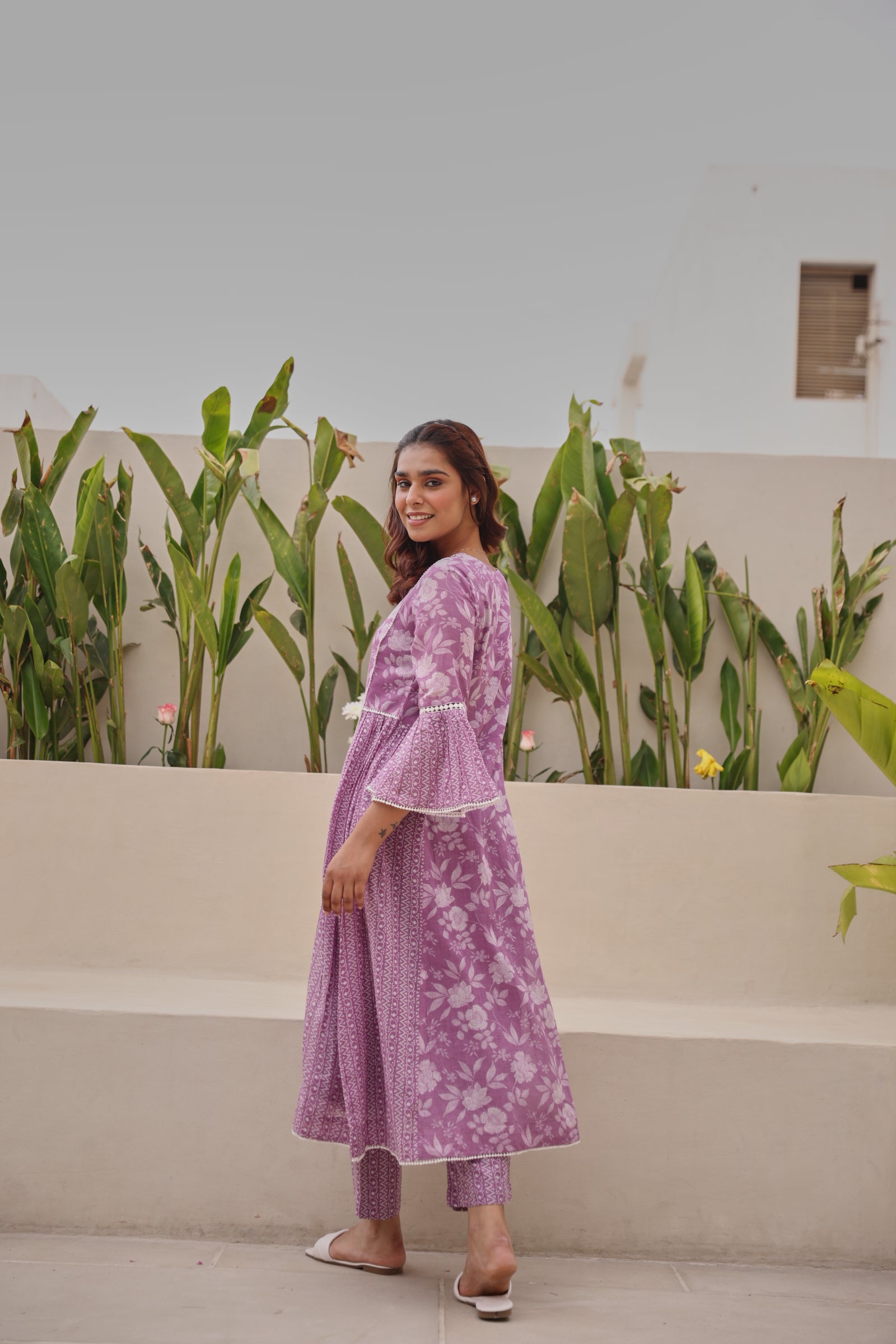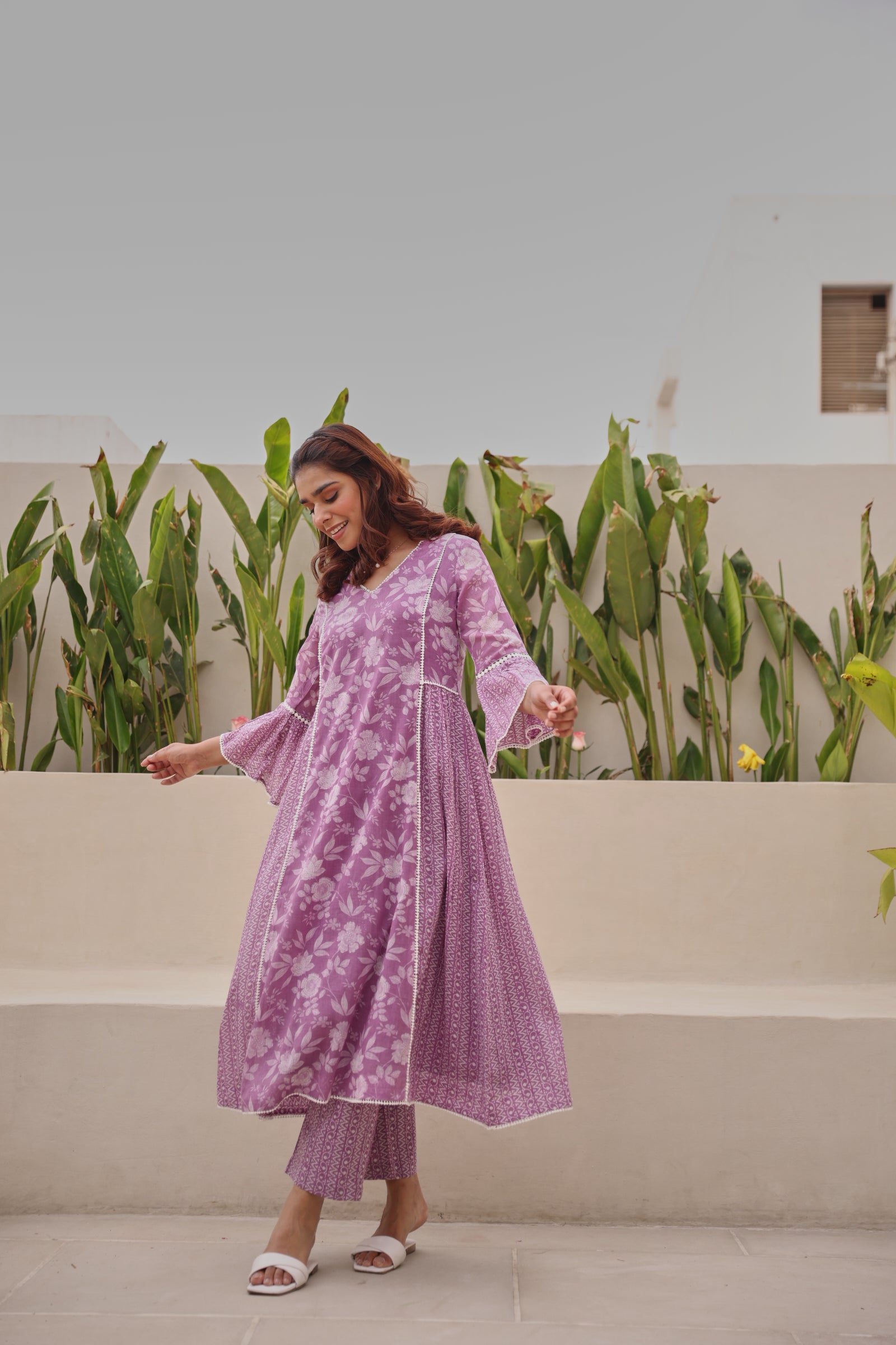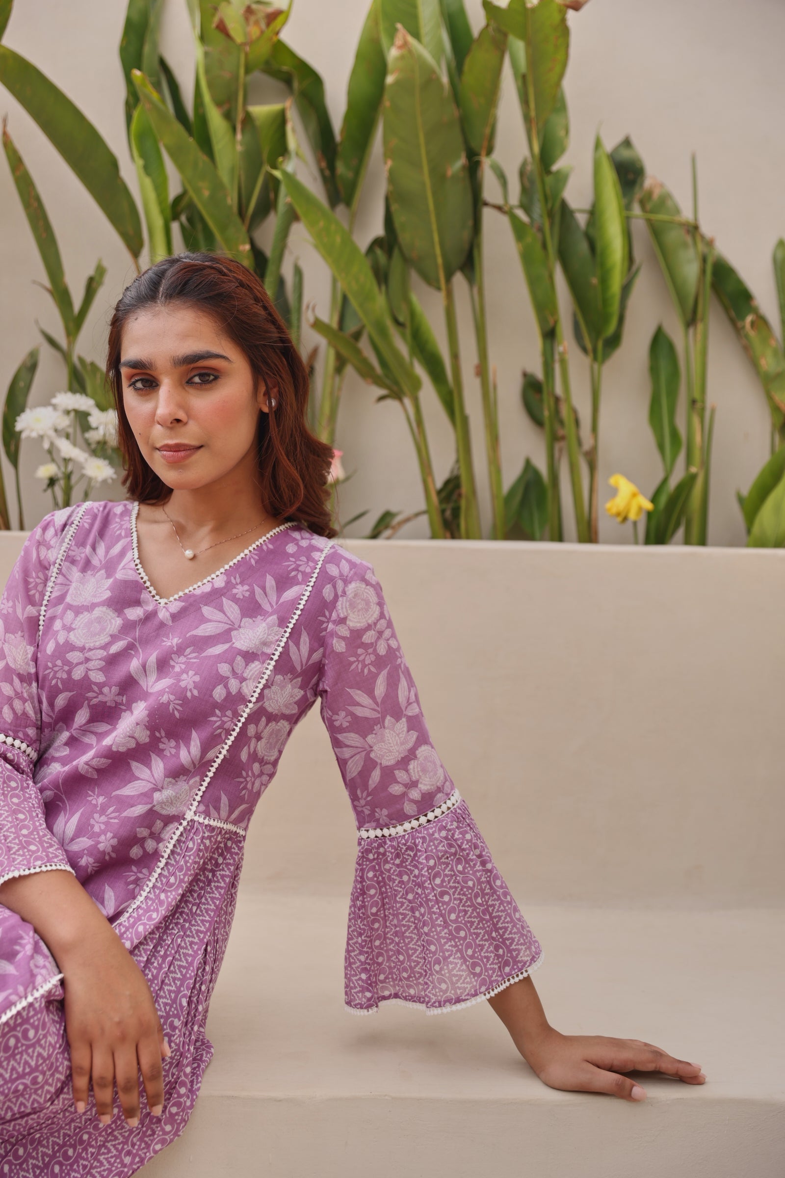 Graceful and feminine, this purple mul cotton kurta showcases exquisite all-over lace detailing with elegant bell-shaped sleeves and a flattering gathered silhouette. Designed with a classic V-neckline and calf-length cut, the kurta offers effortless comfort while maintaining a refined ethnic appeal. Crafted from breathable mul cotton, it is ideal for daily wear, festive gatherings, office wear, and casual outings. The soft texture and regular fit ensure ease of movement with a timeless aesthetic.