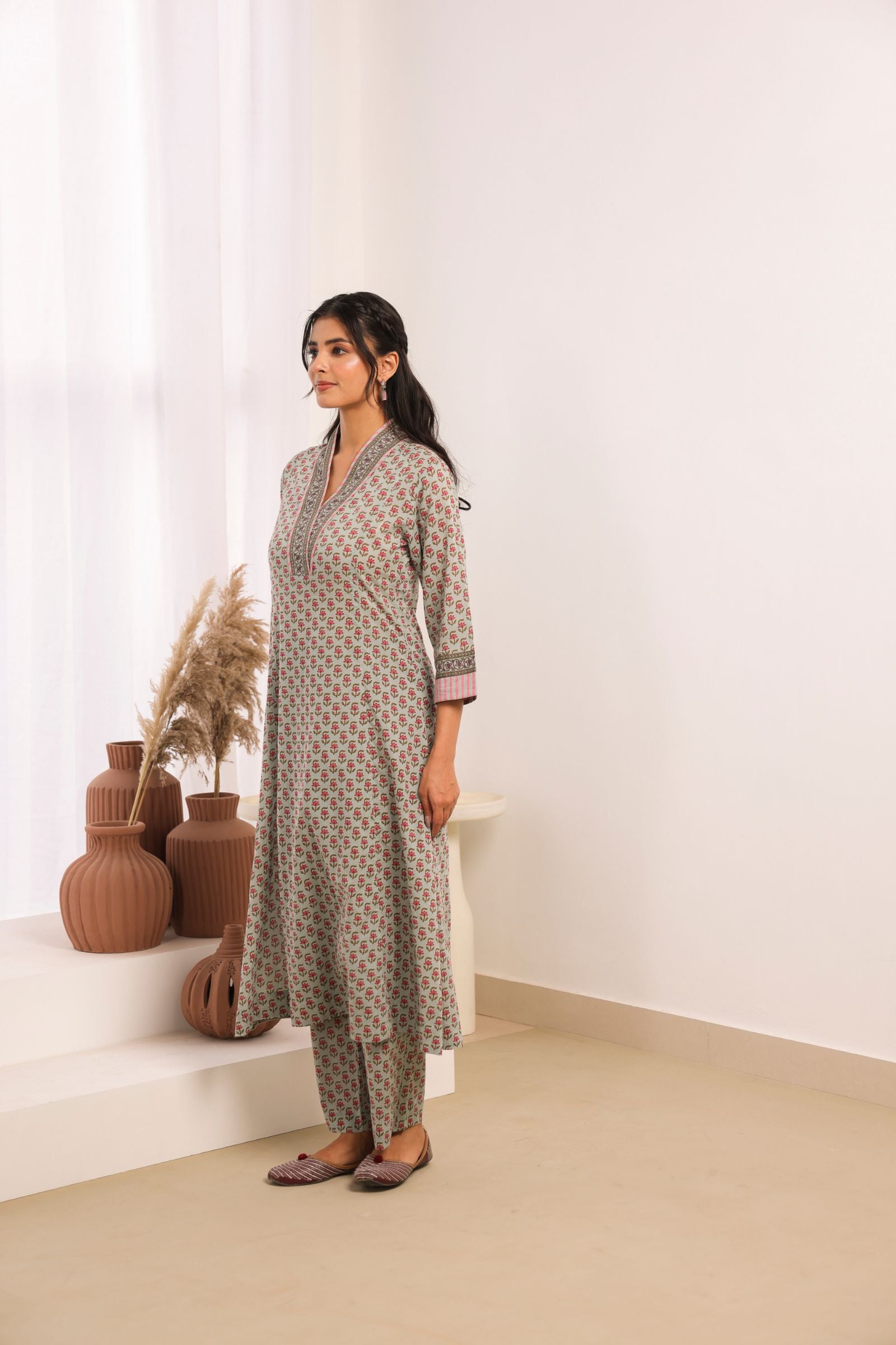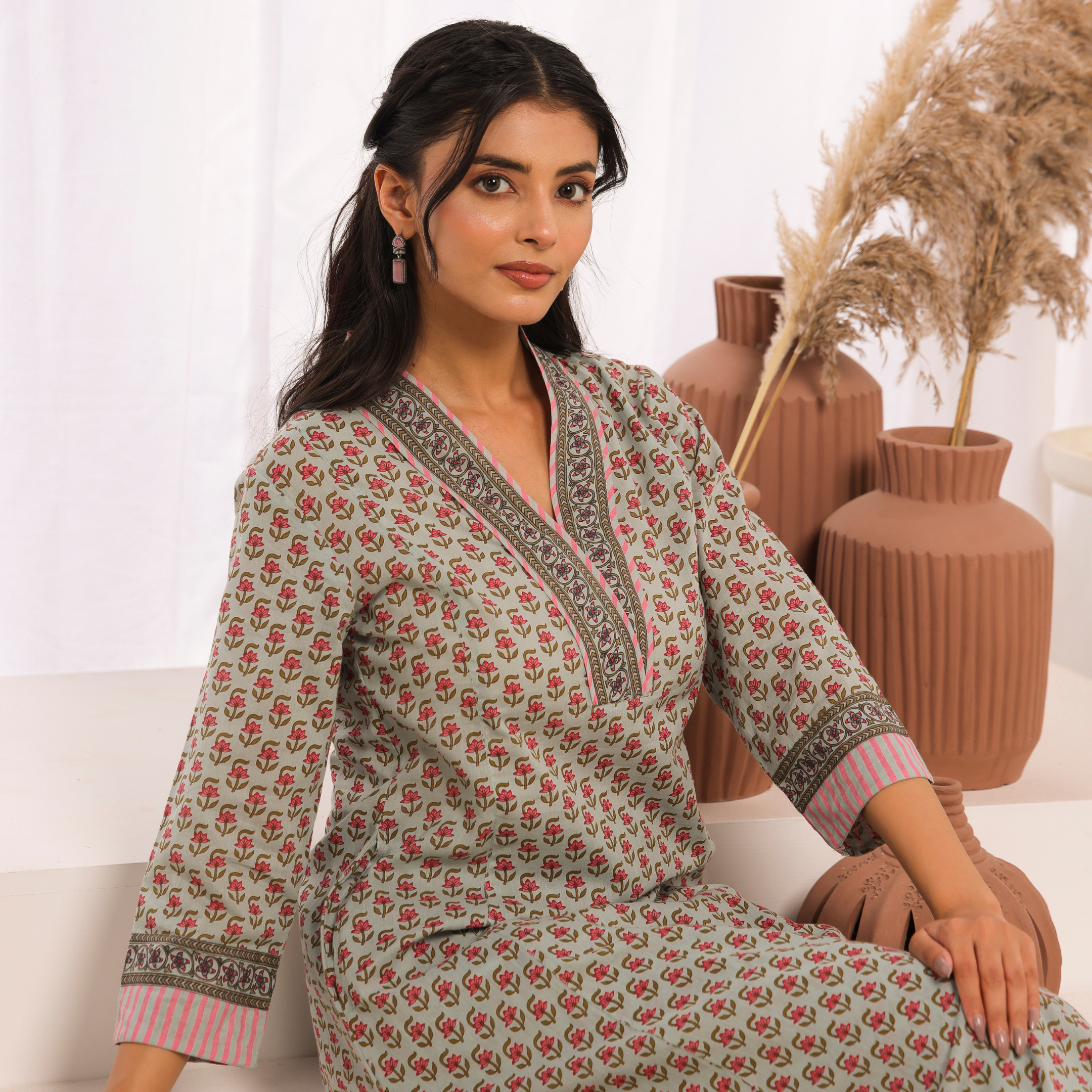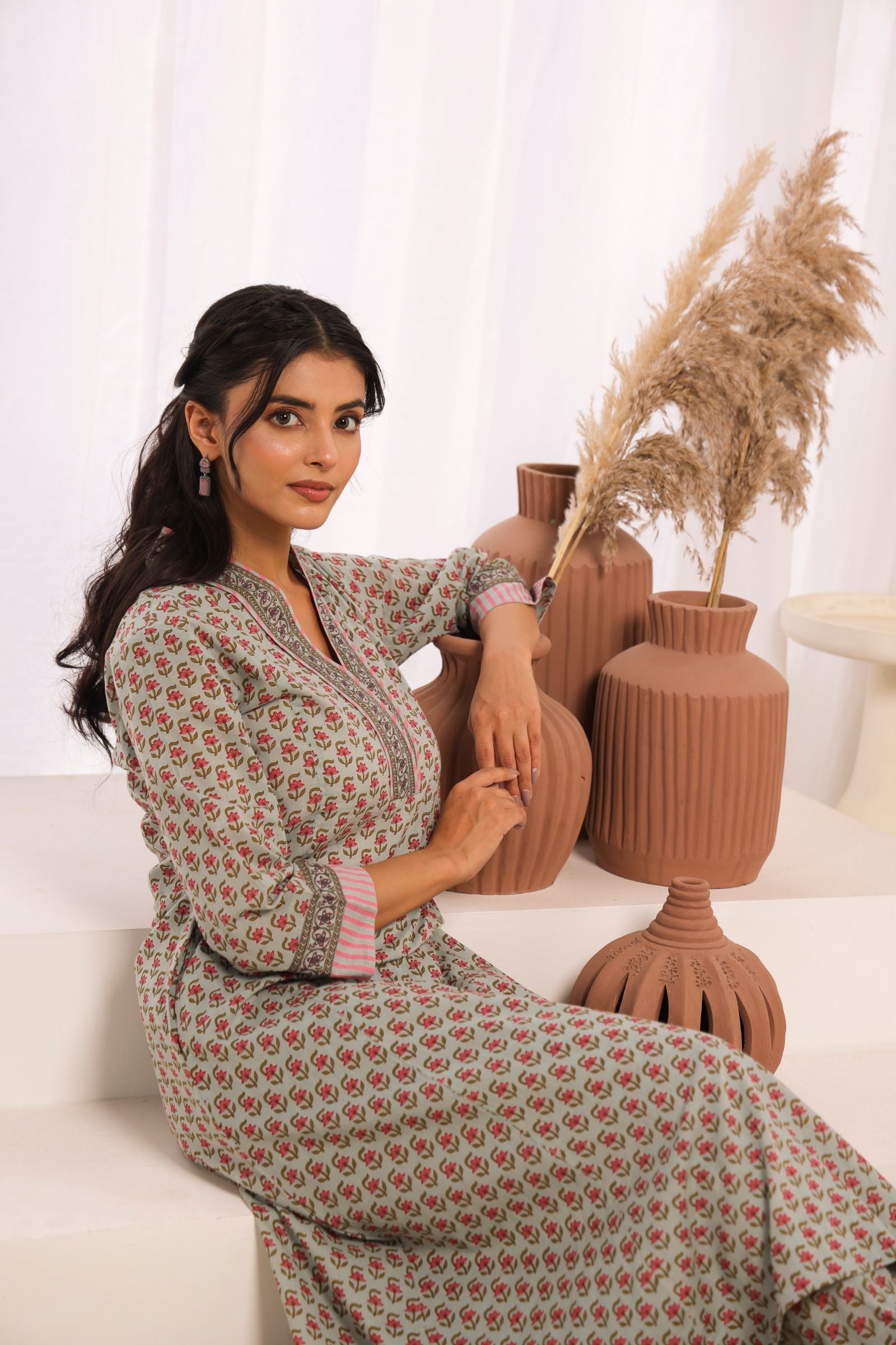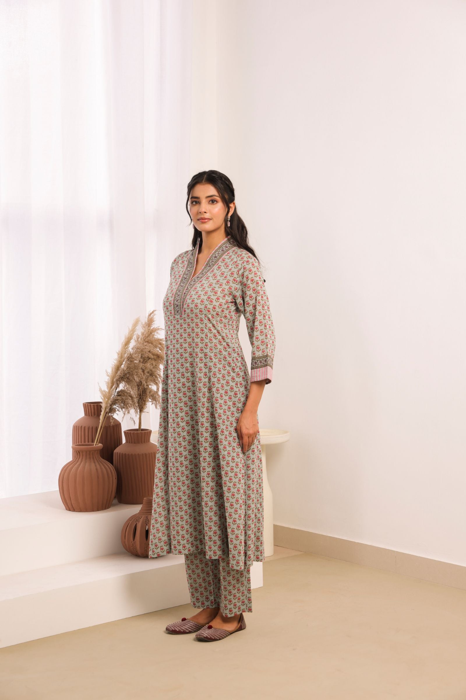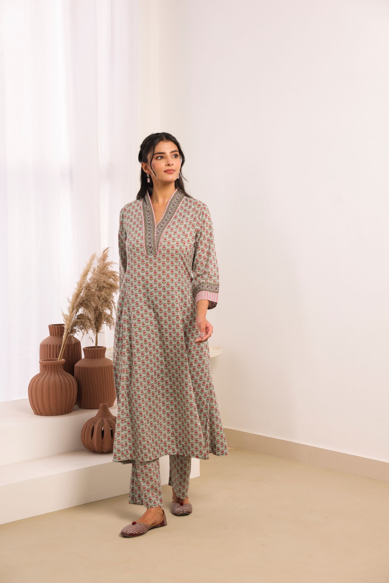 Sage Green Cotton Comfort Fit A-Line Kurta with Printed Cotton Pants