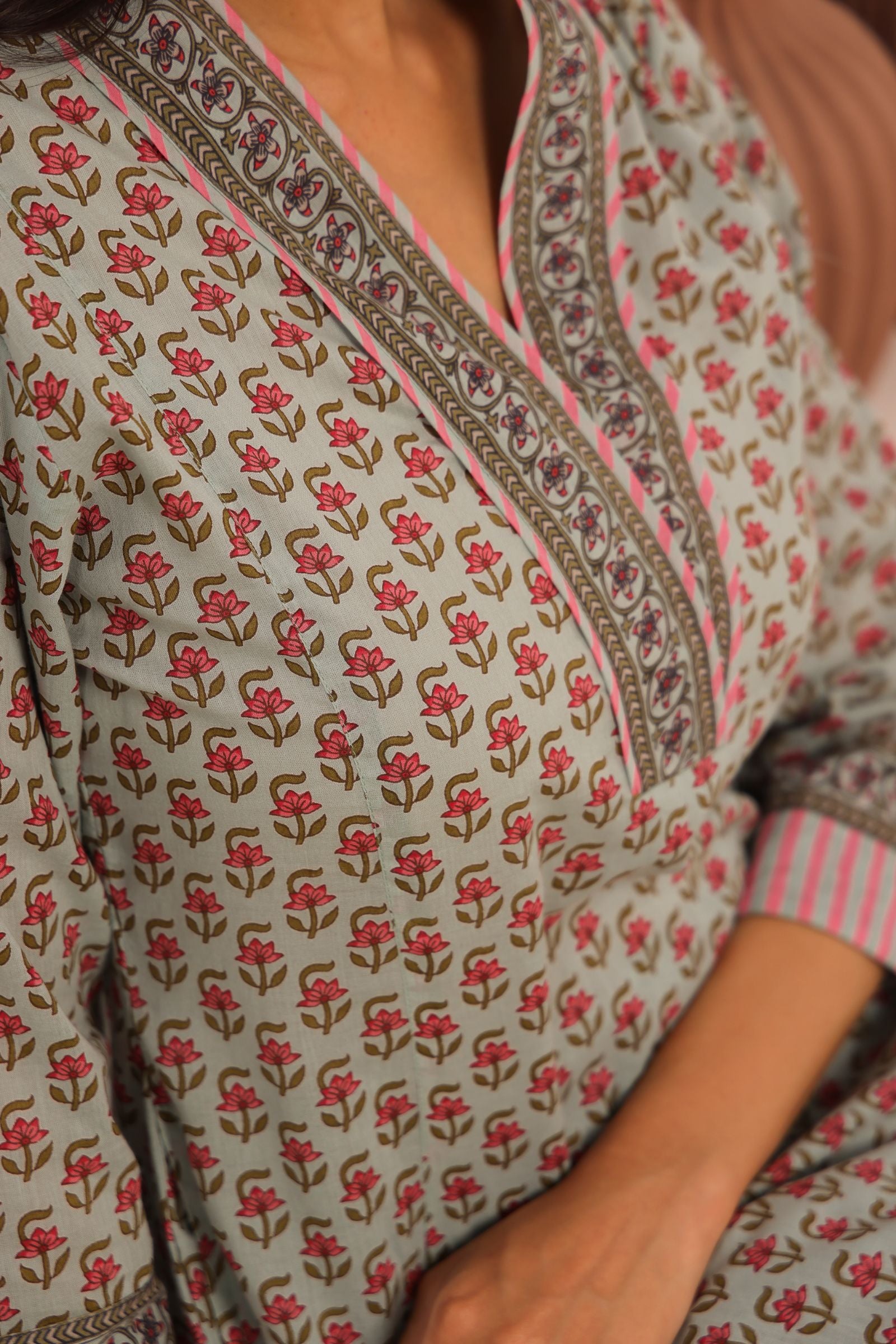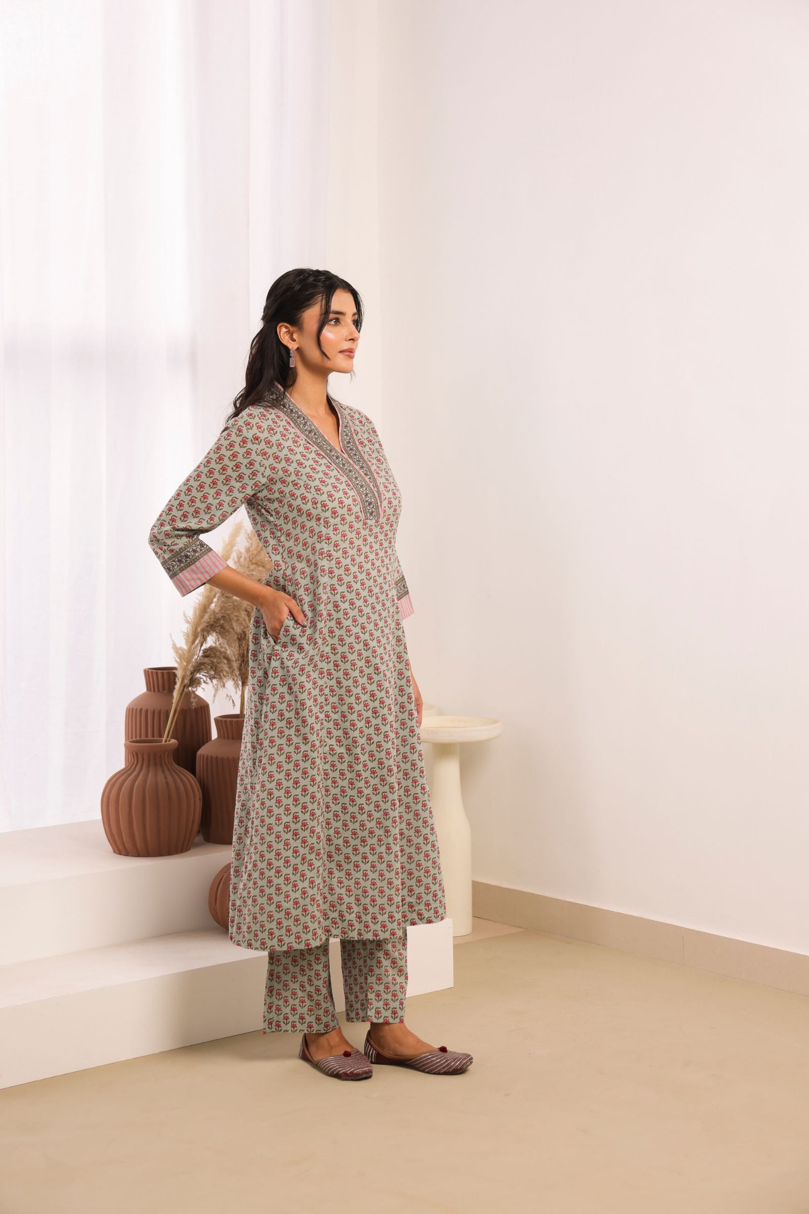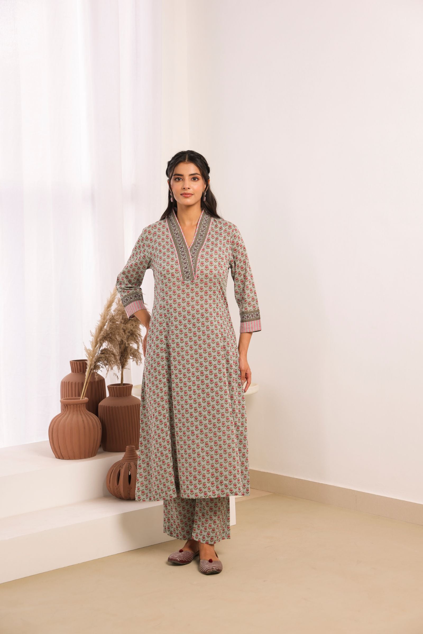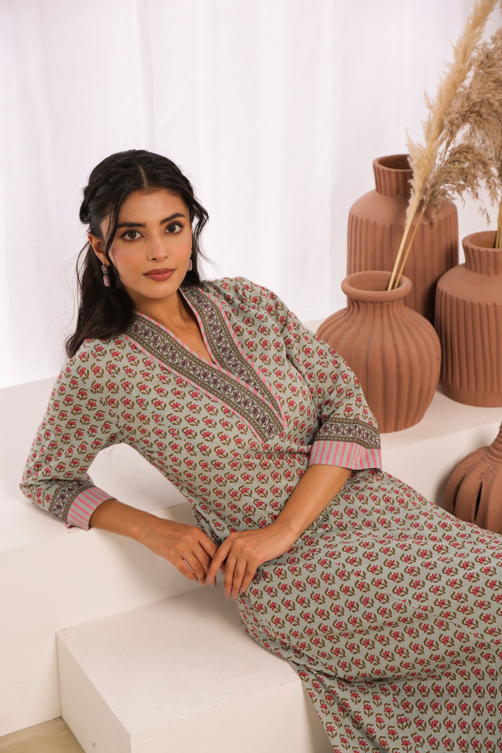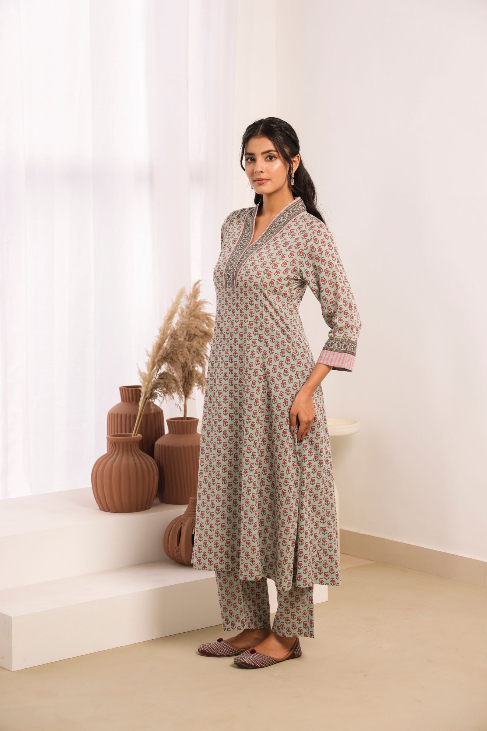Sage Green Cotton Comfort Fit A-Line Kurta with Printed Cotton Pants