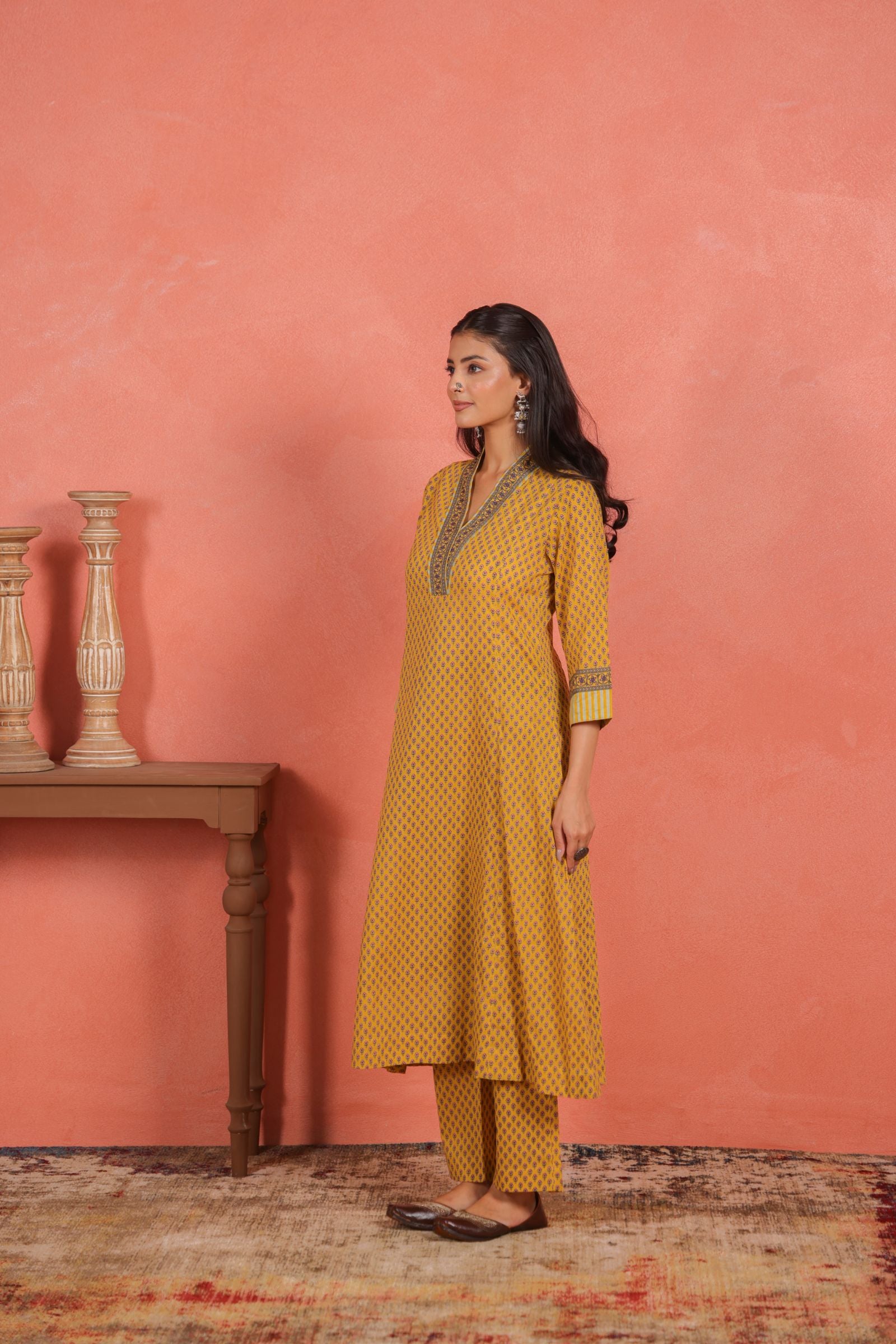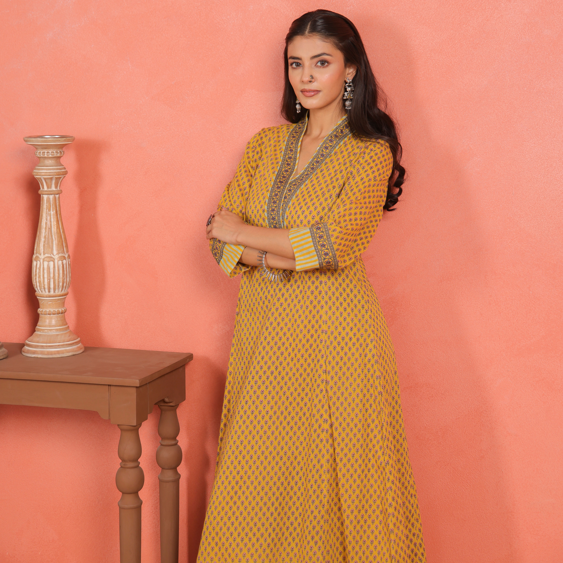 Infuse sunshine and style into your ethnic wardrobe with this Yellow Cotton A-Line Kurta Set. Crafted from soft, breathable cotton, this outfit combines timeless comfort with a refreshing, contemporary look.