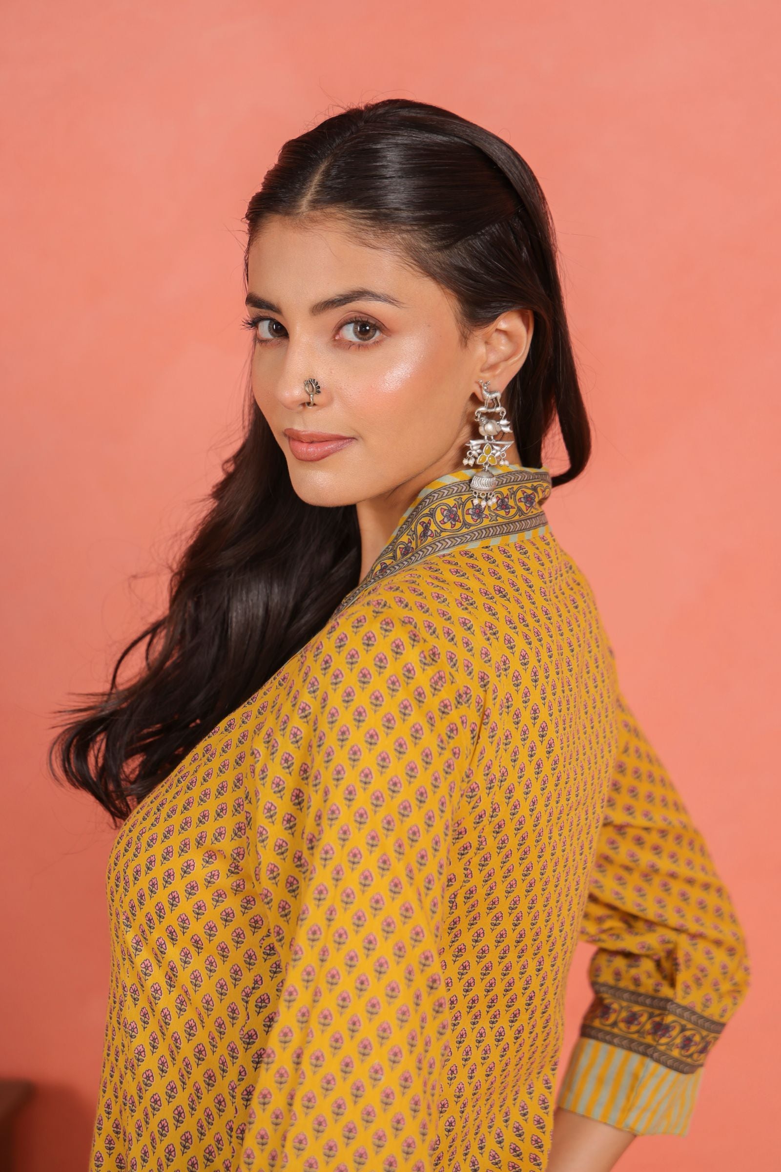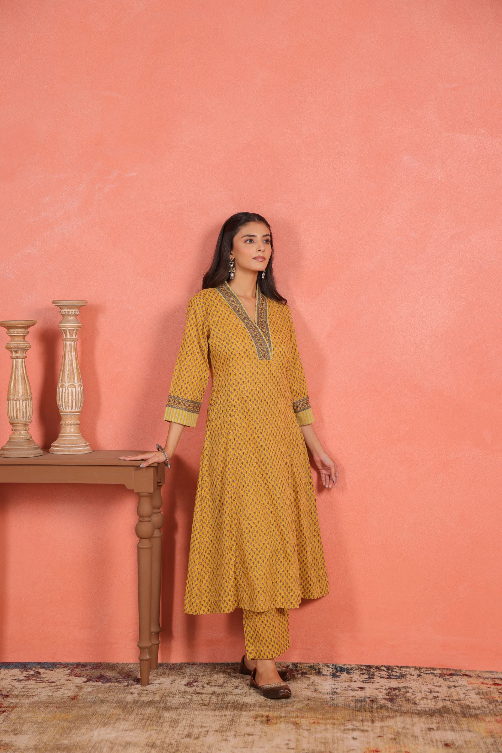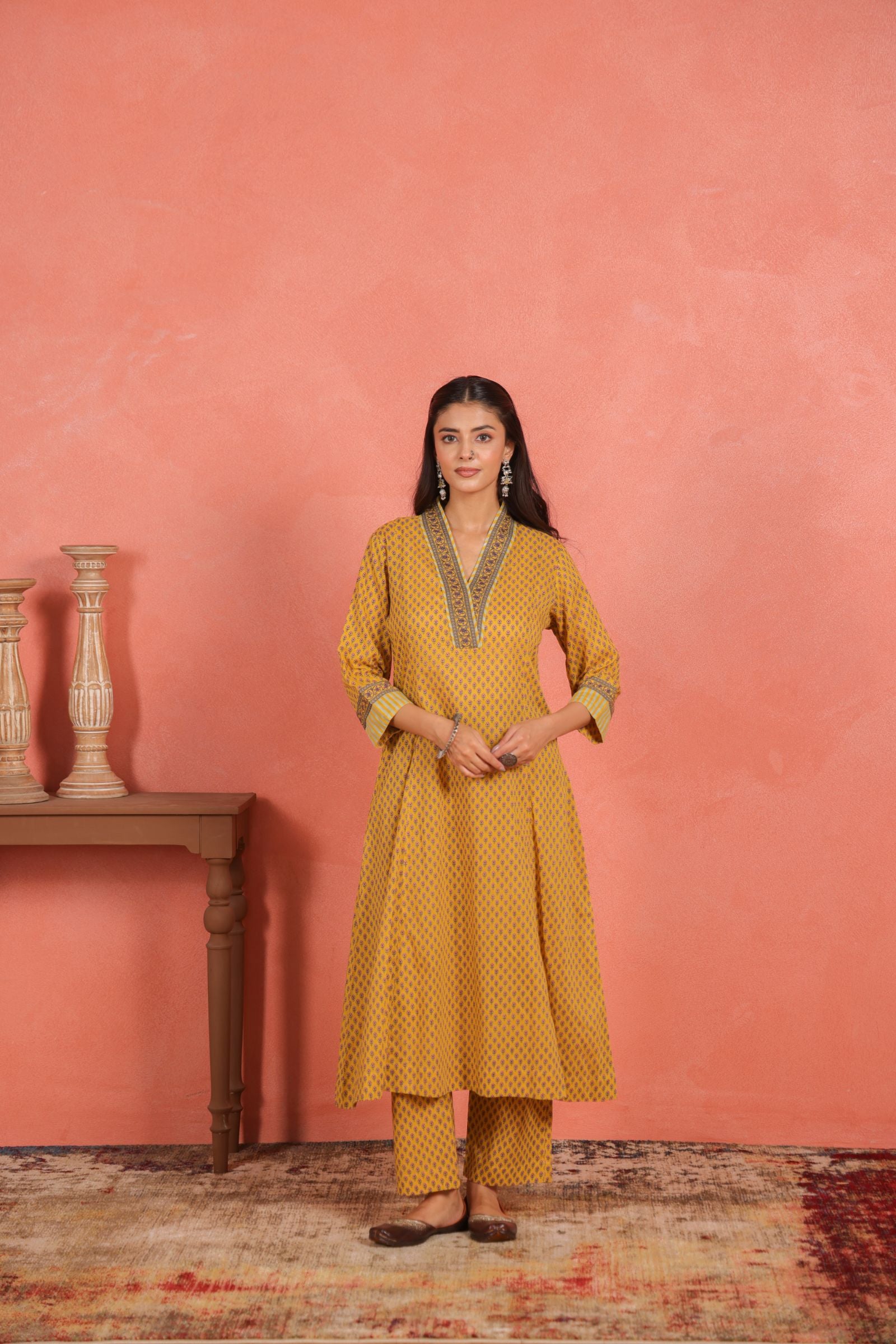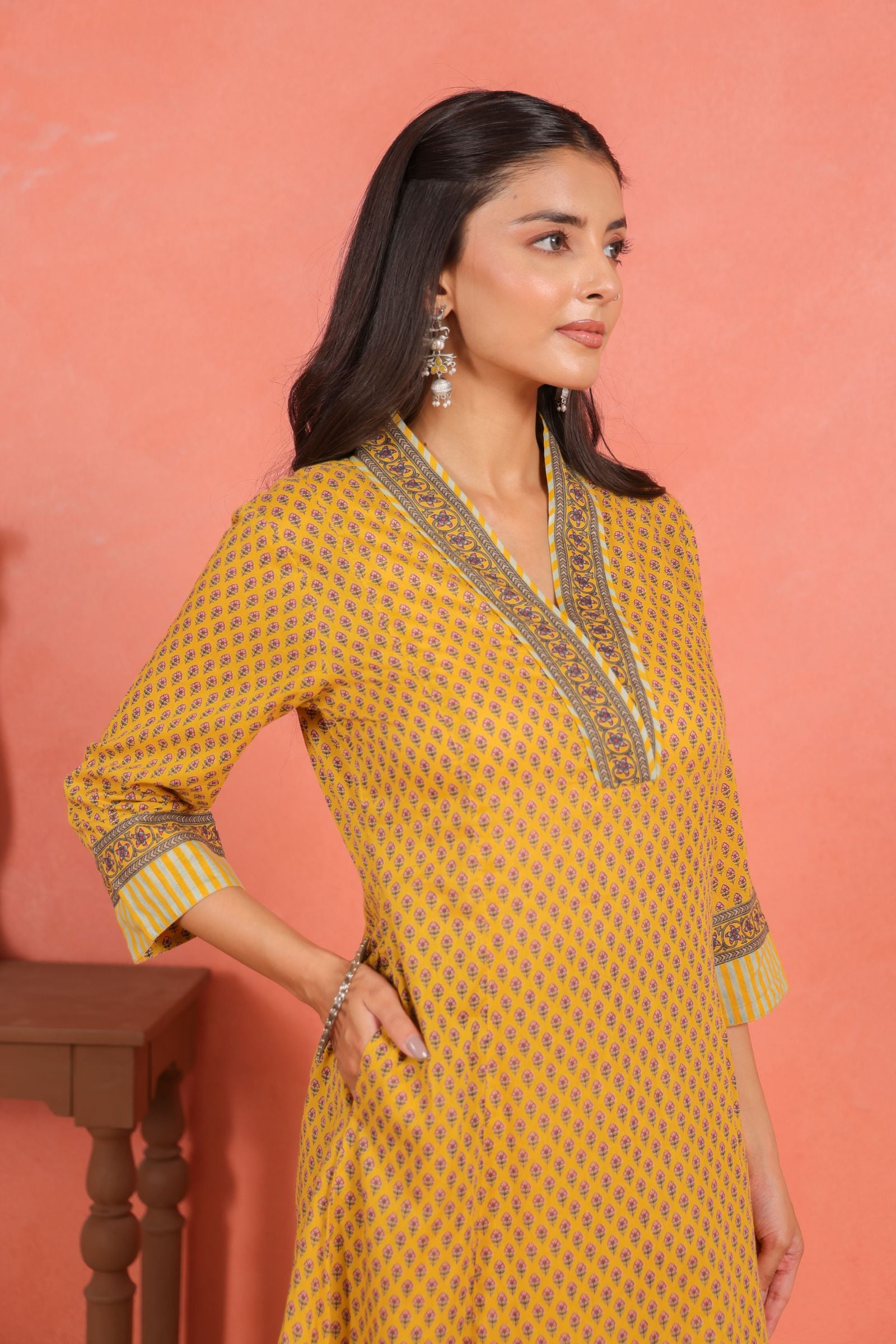 Yellow Cotton Comfort Fit A-Line Kurta with Printed Cotton Pants