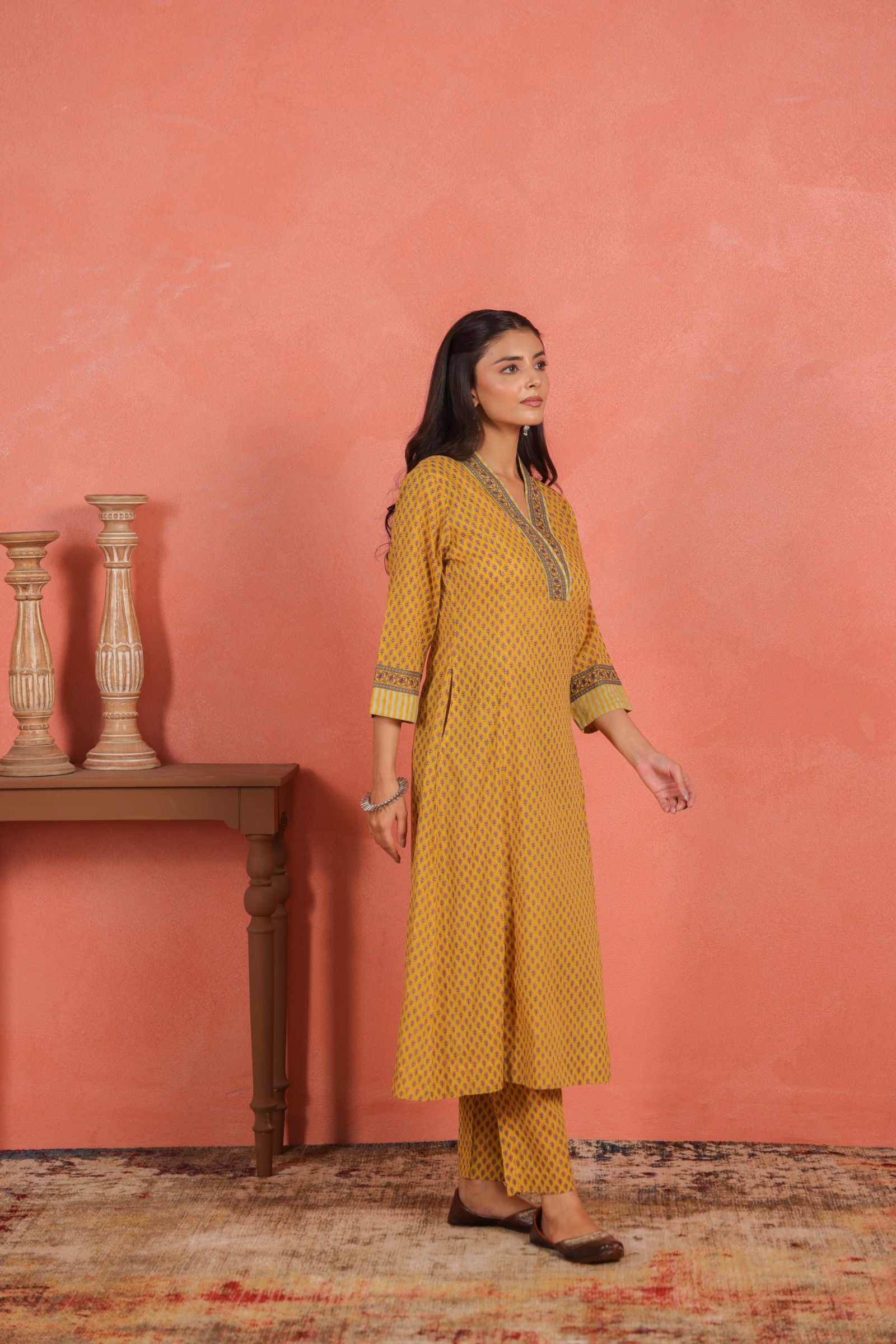 The A-line calf-length kurta gently flares for a flattering shape, while the V-neckline and 3/4th sleeves offer an airy, modern feel. The printed cotton pants add a subtle layer of texture, completing the look with relaxed sophistication.