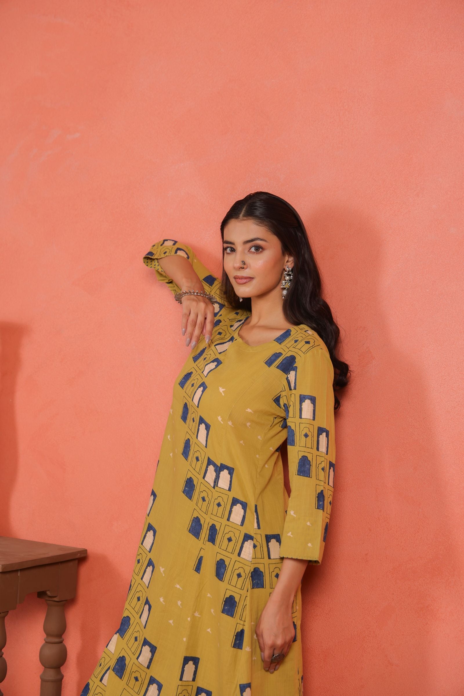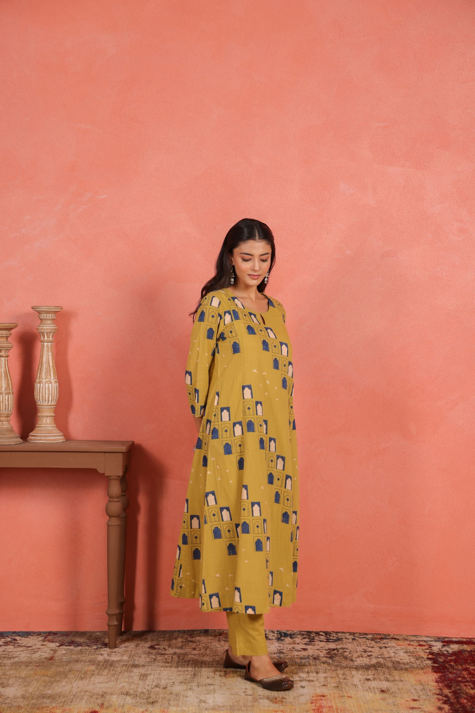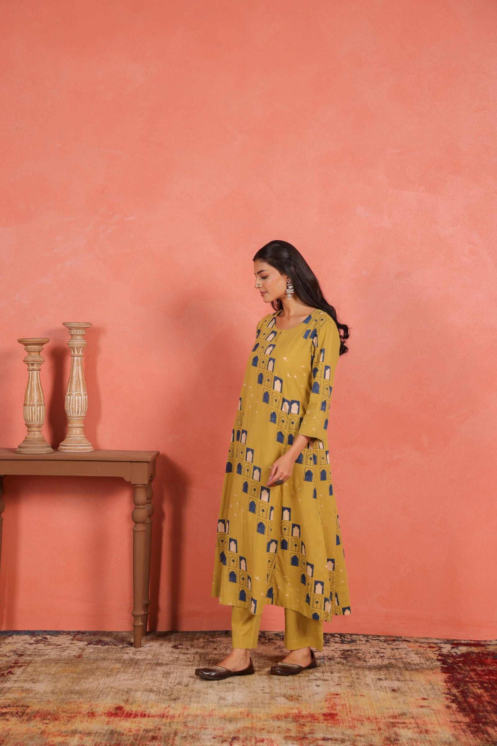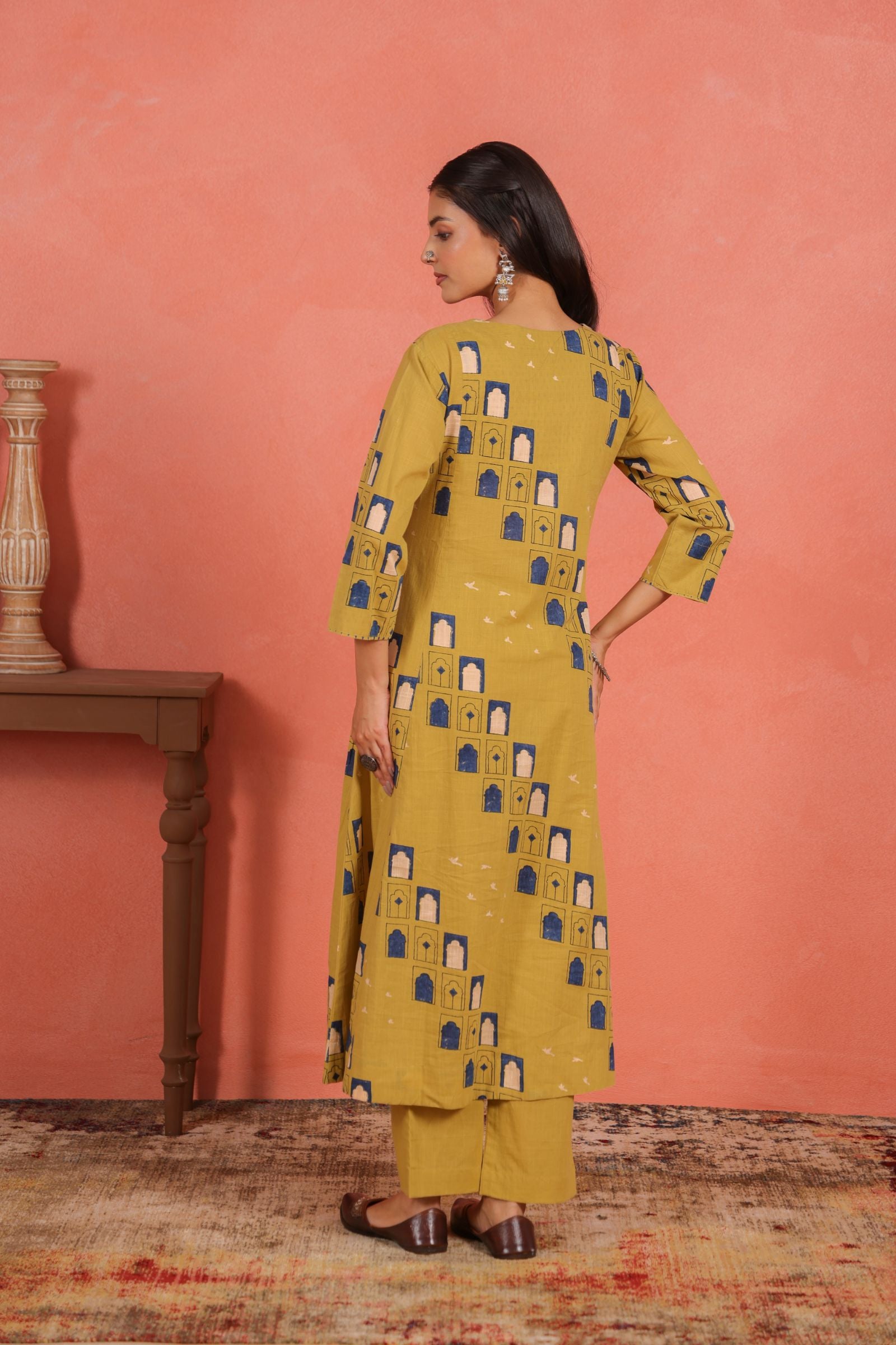 The A-line calf-length kurta drapes beautifully, offering a flattering fall and freedom of movement. Designed with a round neckline and 3/4th sleeves, it brings a balanced mix of traditional grace and everyday comfort. The printed cotton pants add a subtle contrast that enhances the kurta’s minimal yet vibrant appeal.