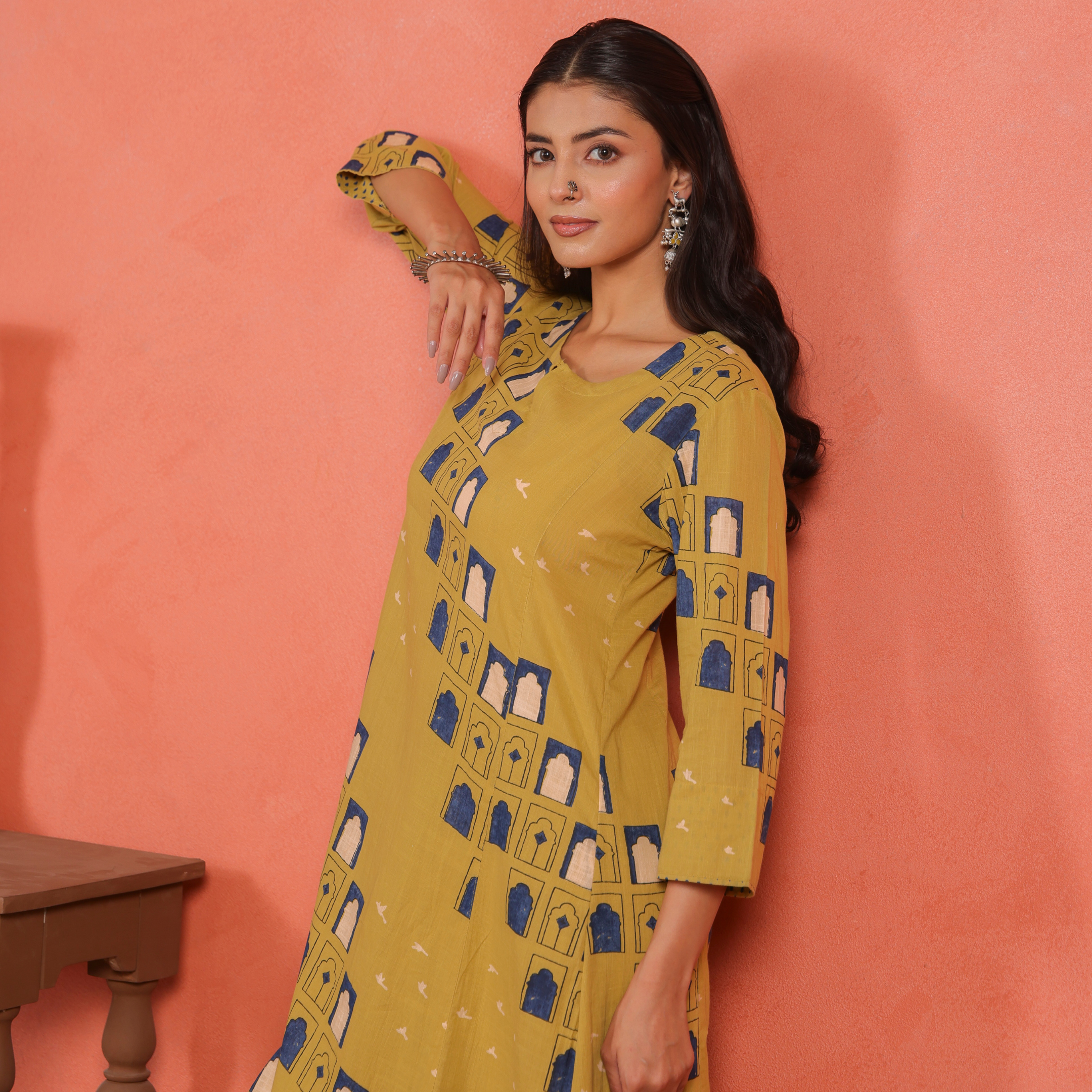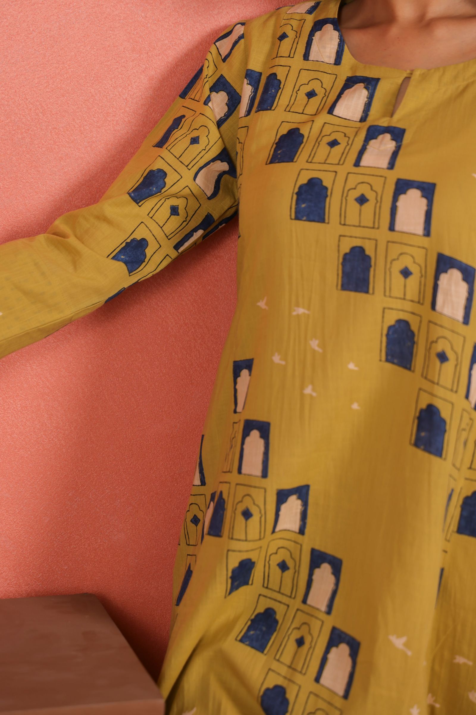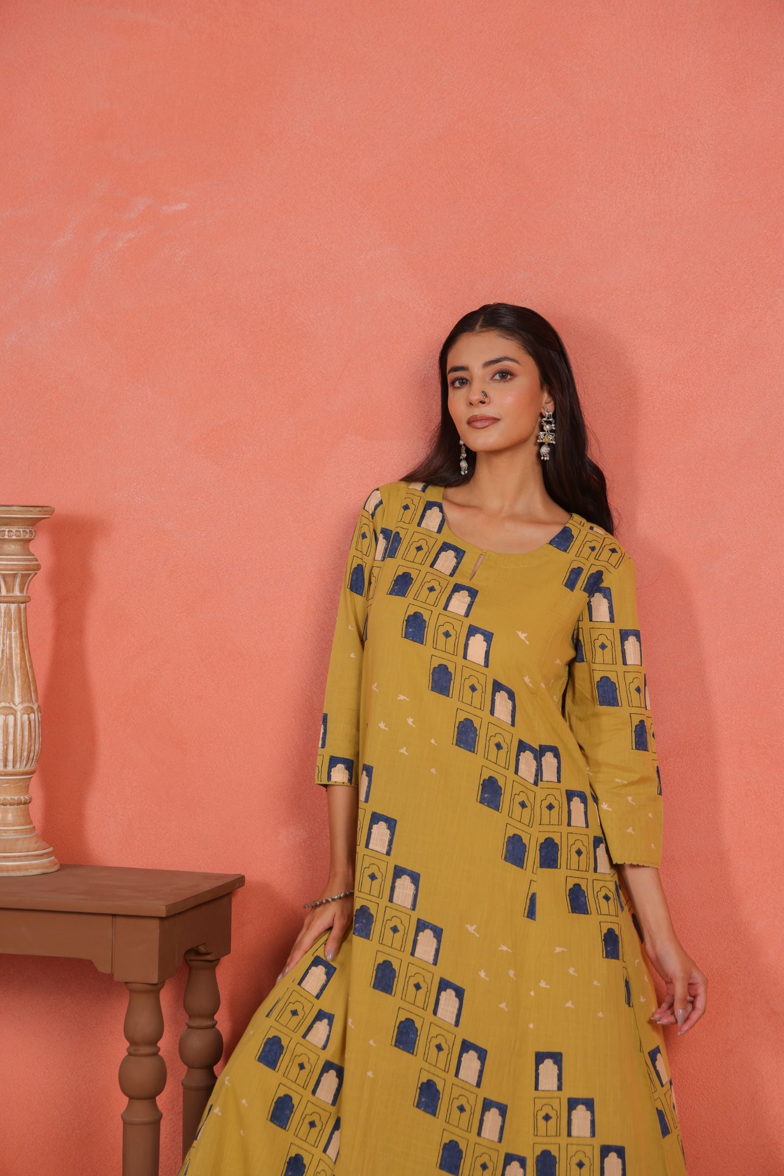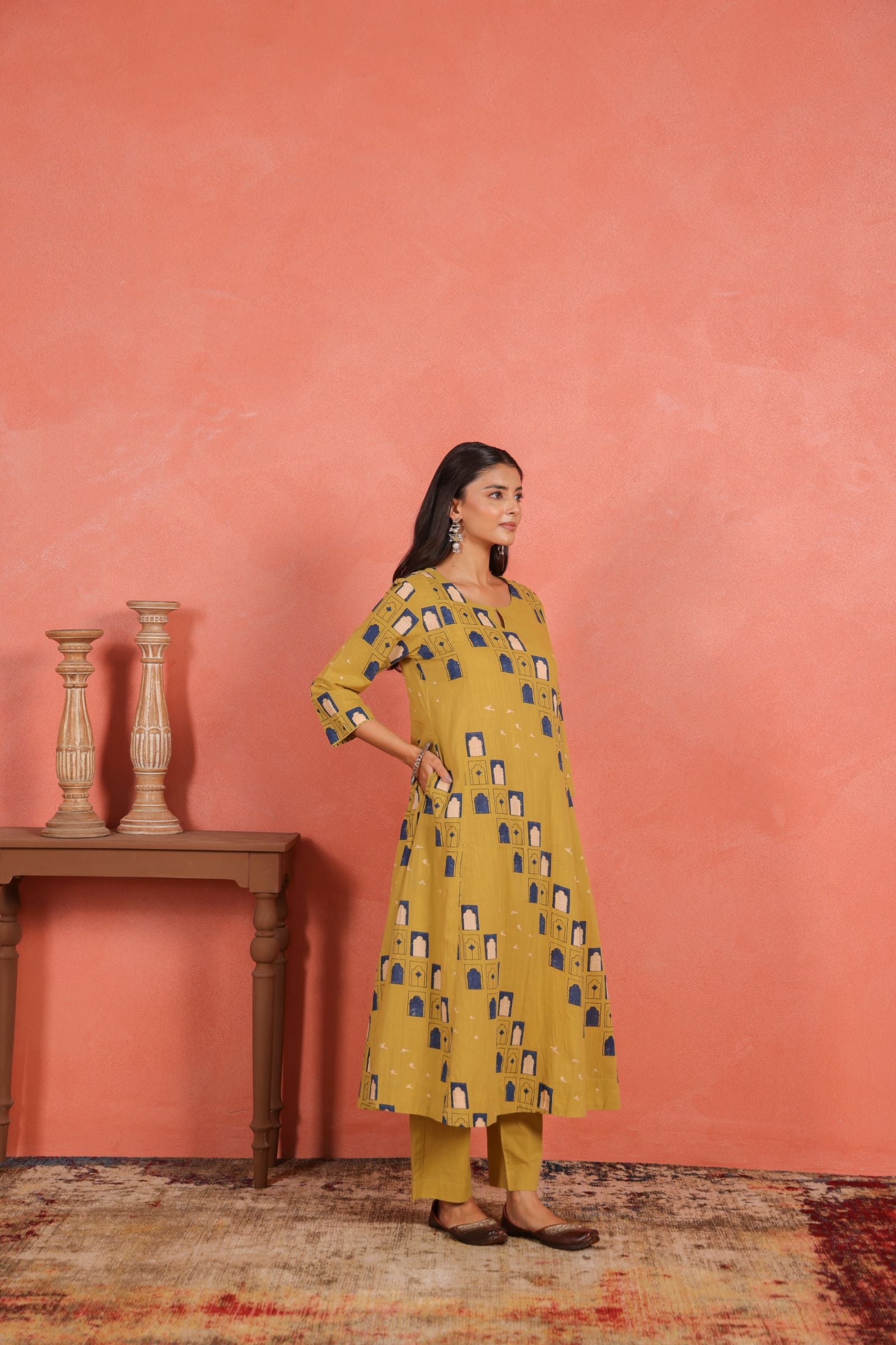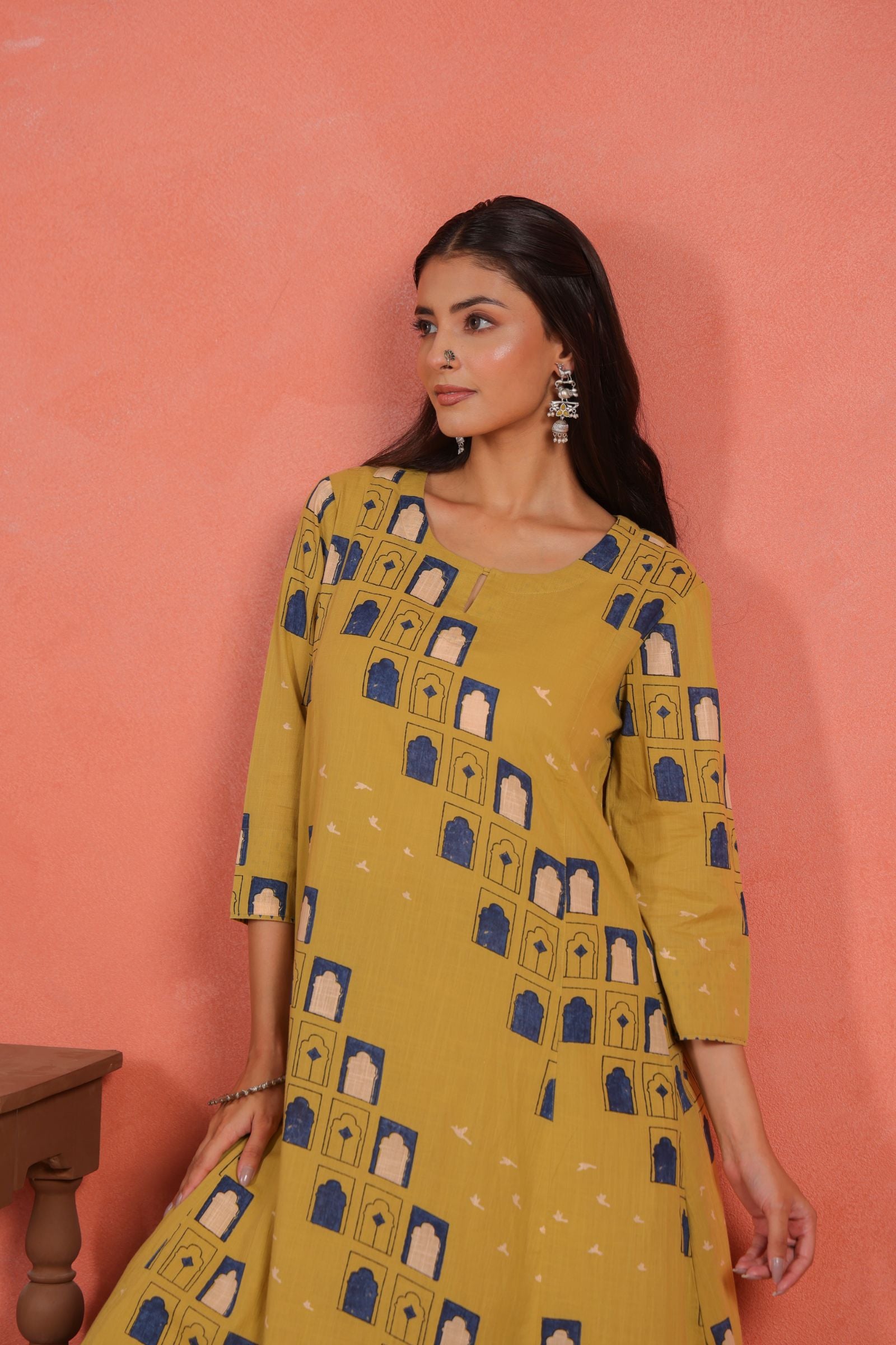 The A-line calf-length kurta drapes beautifully, offering a flattering fall and freedom of movement. Designed with a round neckline and 3/4th sleeves, it brings a balanced mix of traditional grace and everyday comfort. The printed cotton pants add a subtle contrast that enhances the kurta’s minimal yet vibrant appeal.