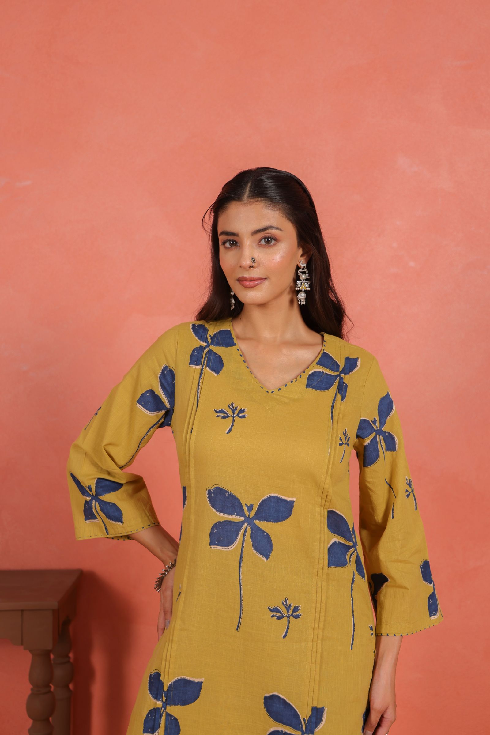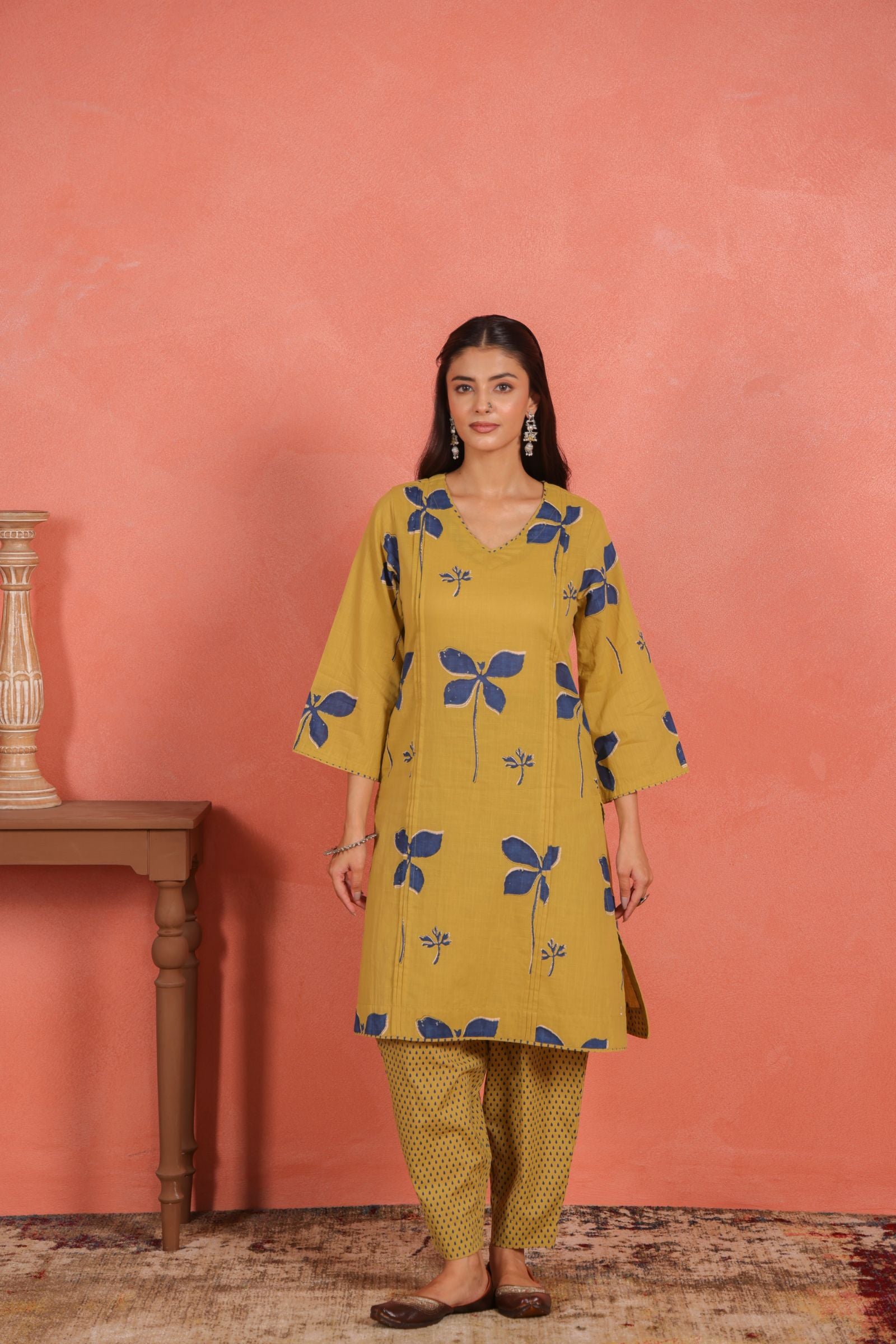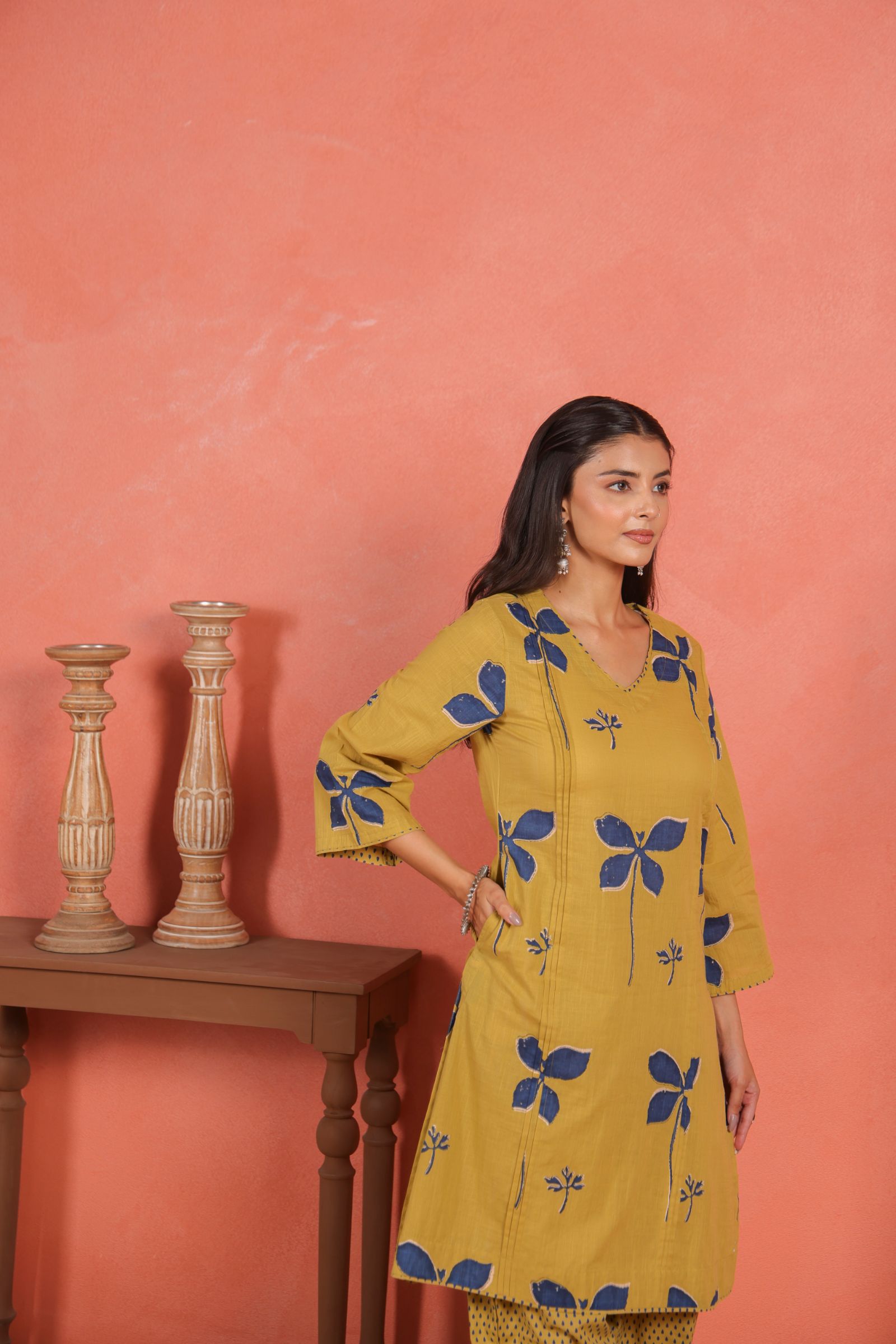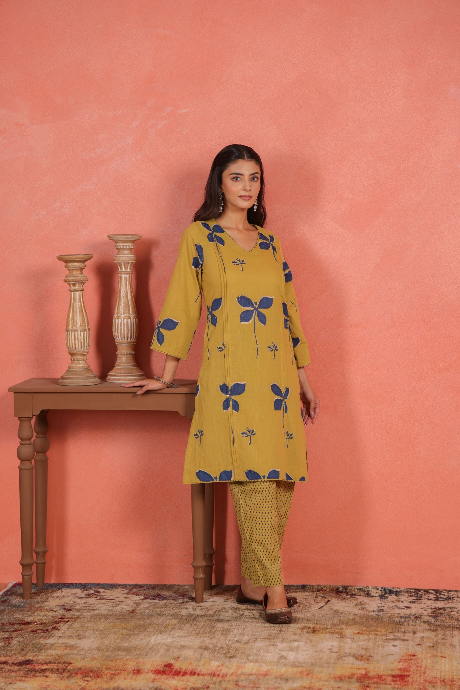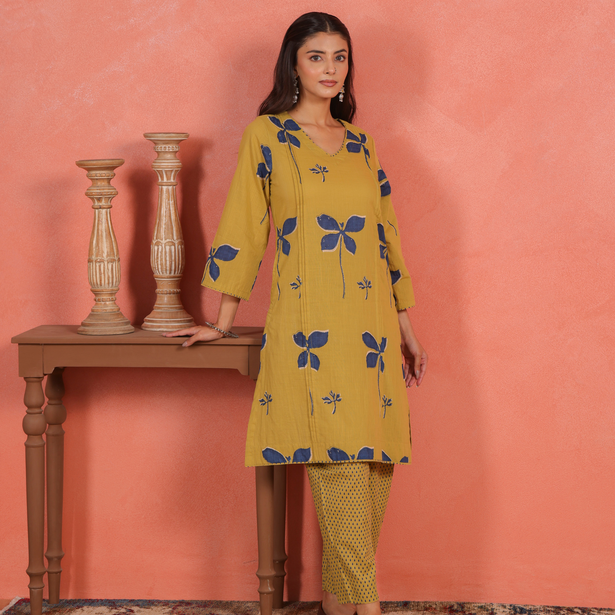Bring cheerful sophistication to your casual or festive occasions with the Yellow Cotton Slub Pleated Kurta Set. Crafted from soft, breathable cotton slub, the A-line knee-length kurta provides a flattering comfort fit that drapes beautifully.