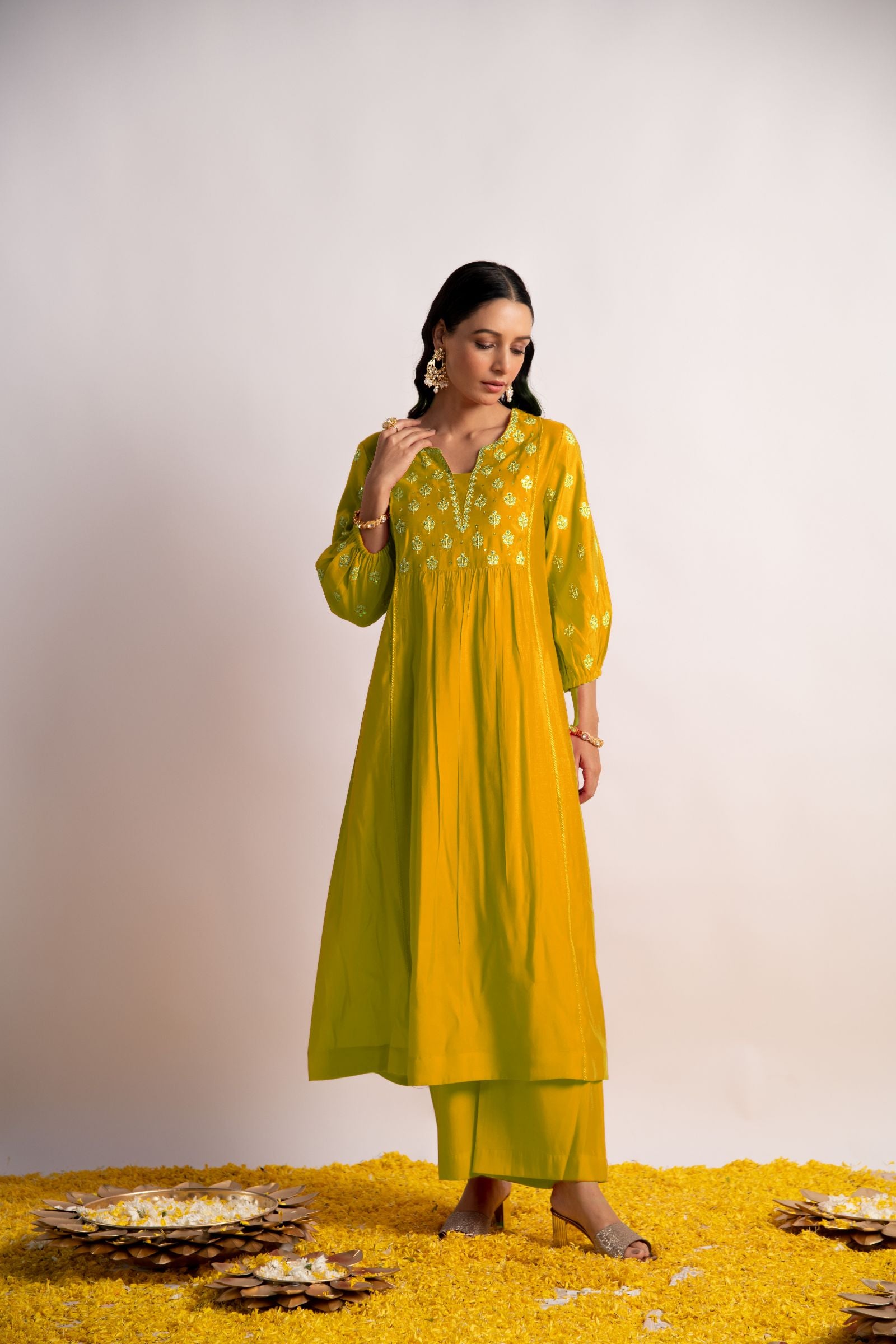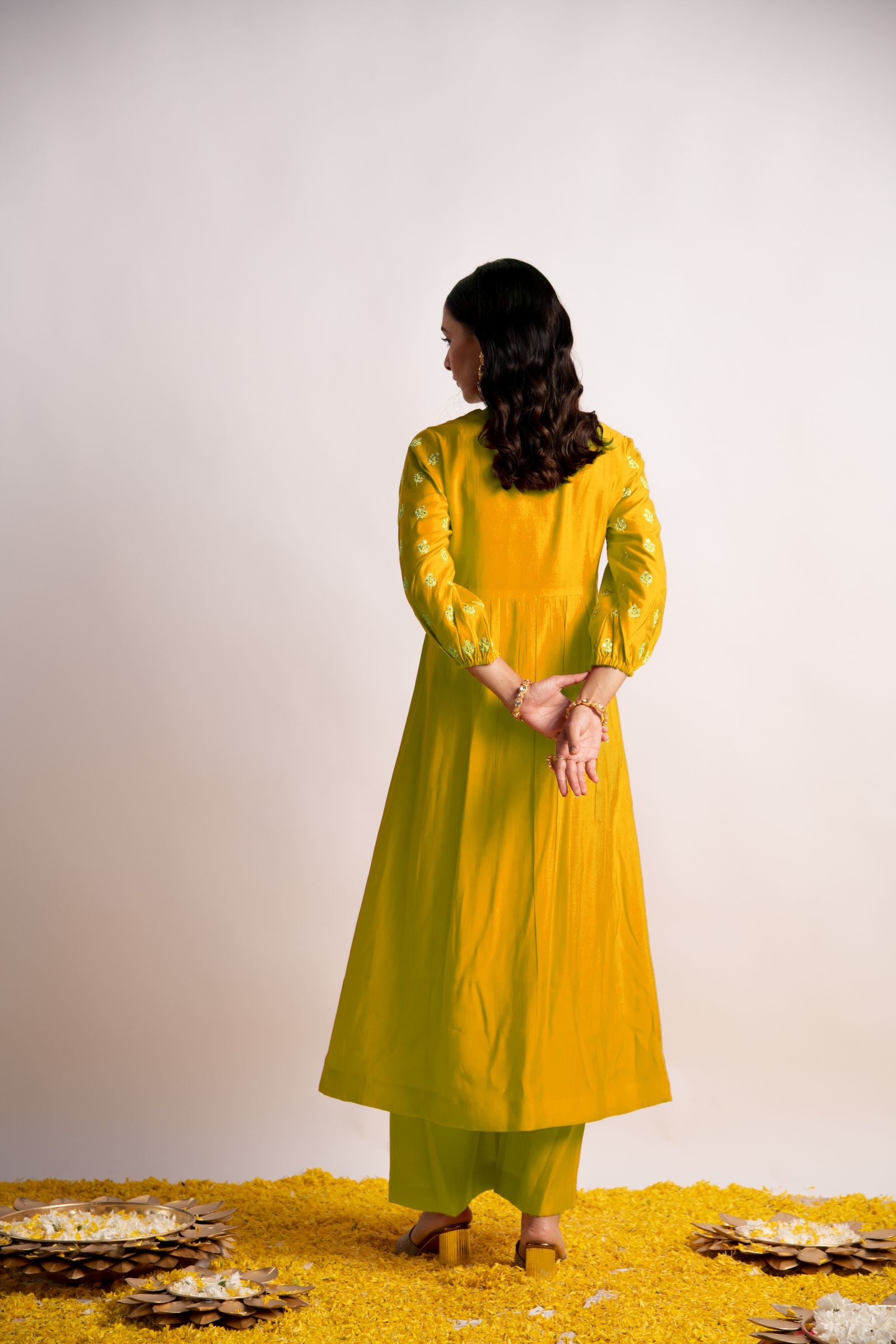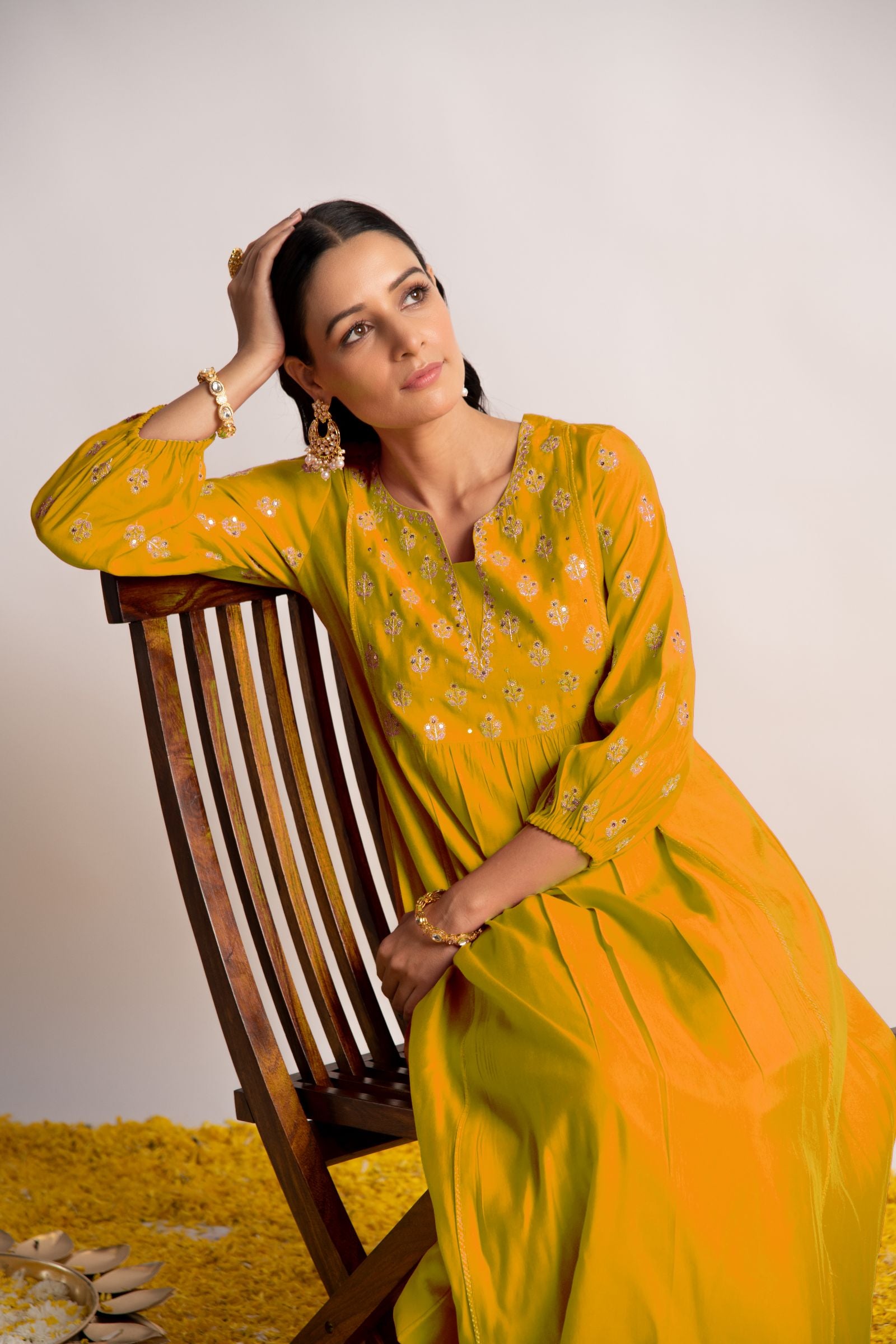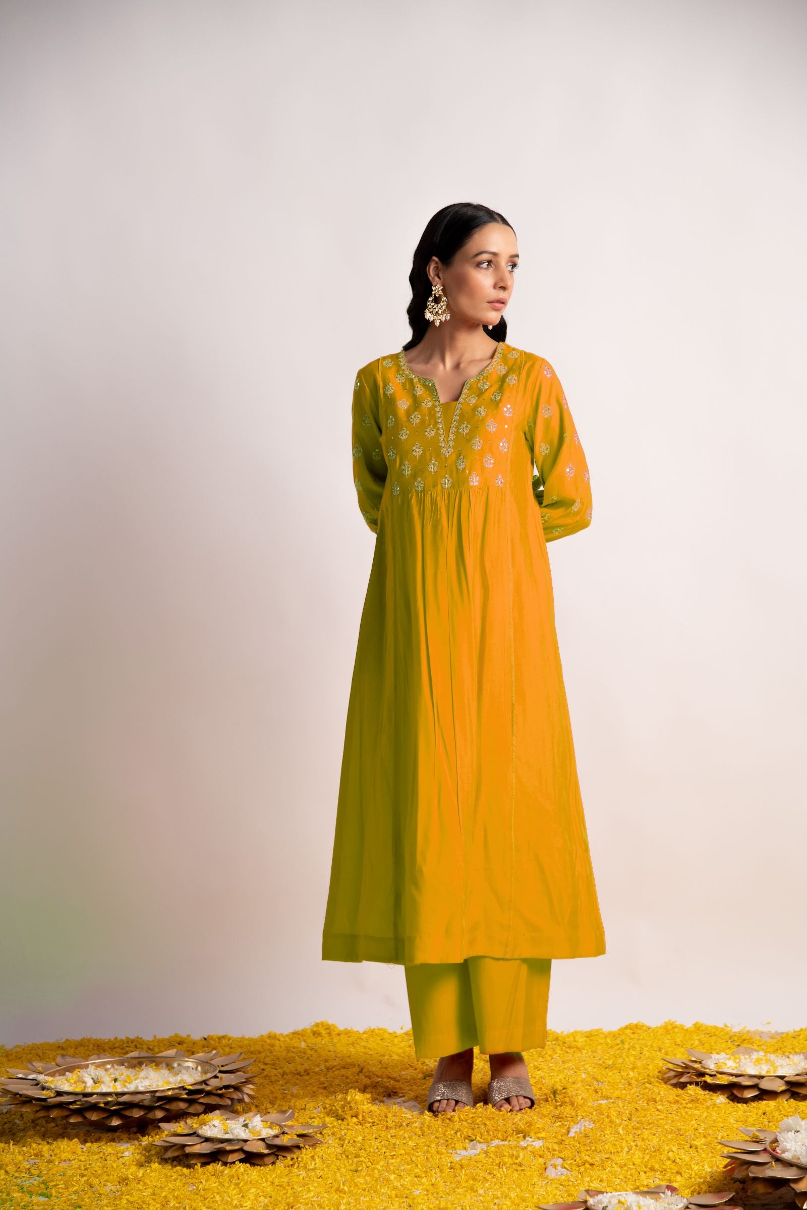 Yellow modal silk fabric a-line kurta detailed with beautiful aari work, has a round neck, three-quarter sleeves. This kurta comes with Yellow modal silk fabric pant.