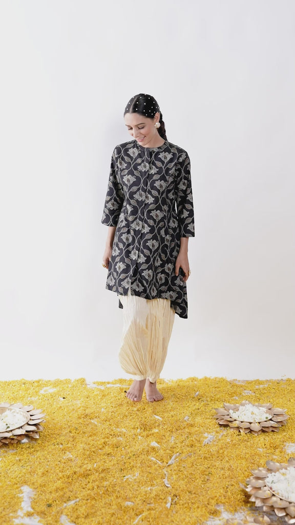 Black gold print up and down flaredd kurta, has a mandarin collar, three-quarter sleeves. This kurta comes with cream wrinkled heram pant.