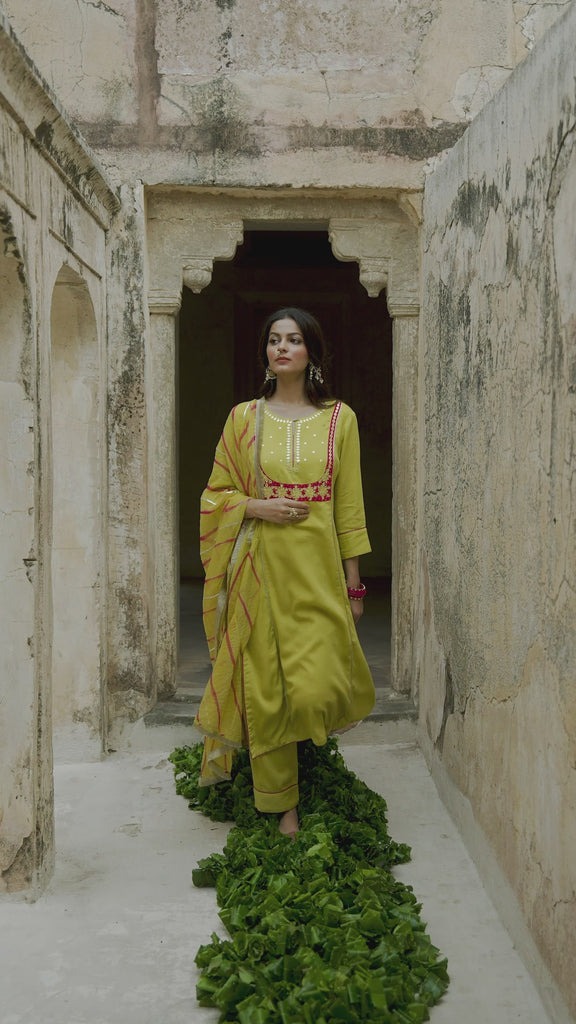 Lime Green Embroidered Cotton Kurta Pant Set with Dupatta