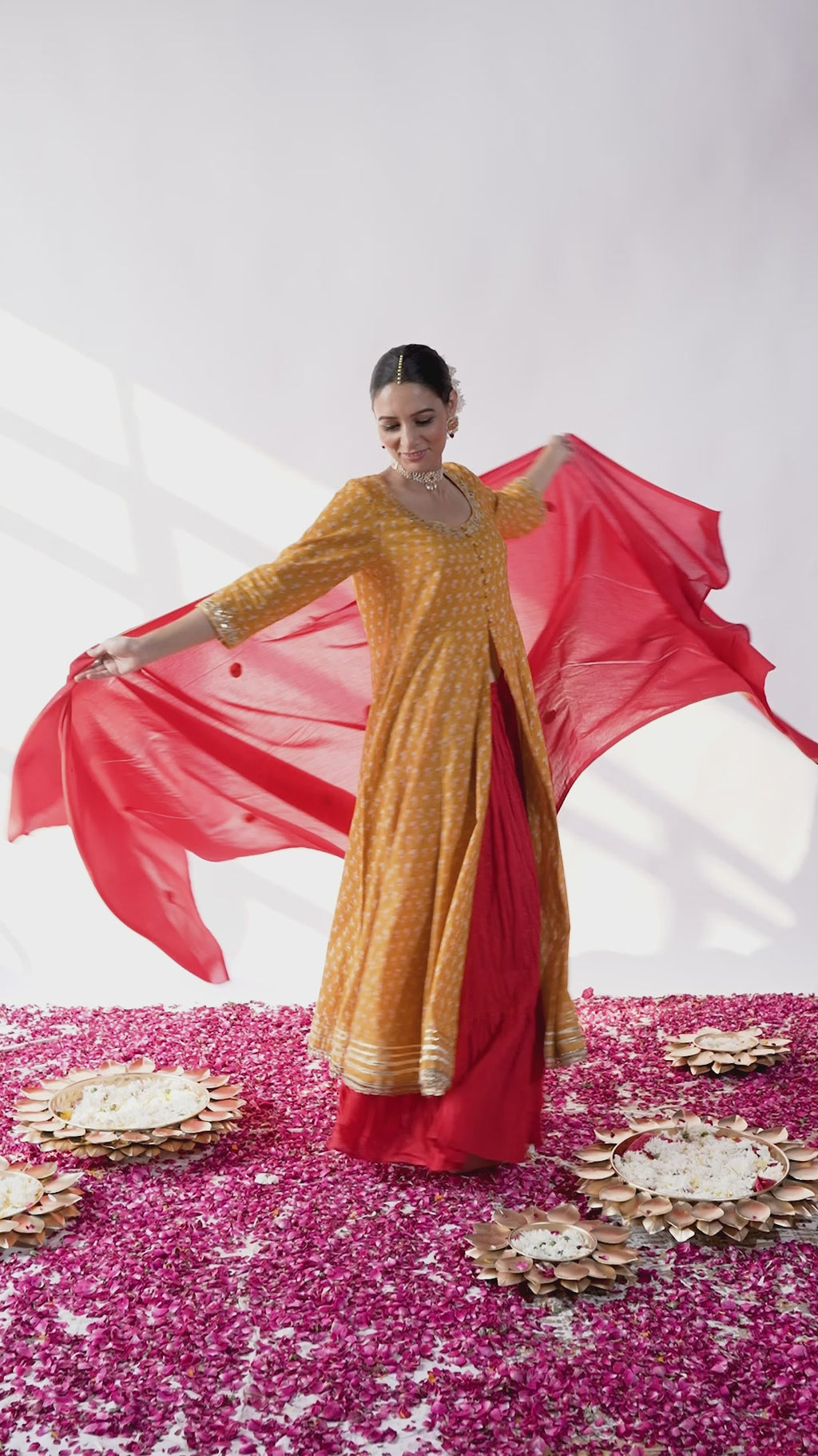 Mustard printed kali kurta detailed with gotta pati work on neck and gotta lace on hem and sleeves, has a scoop neck, three-quarter sleeves, Red wrinkled skirt. This kurta skirt comes with dupatta highlighted with gotta flower and gotta.