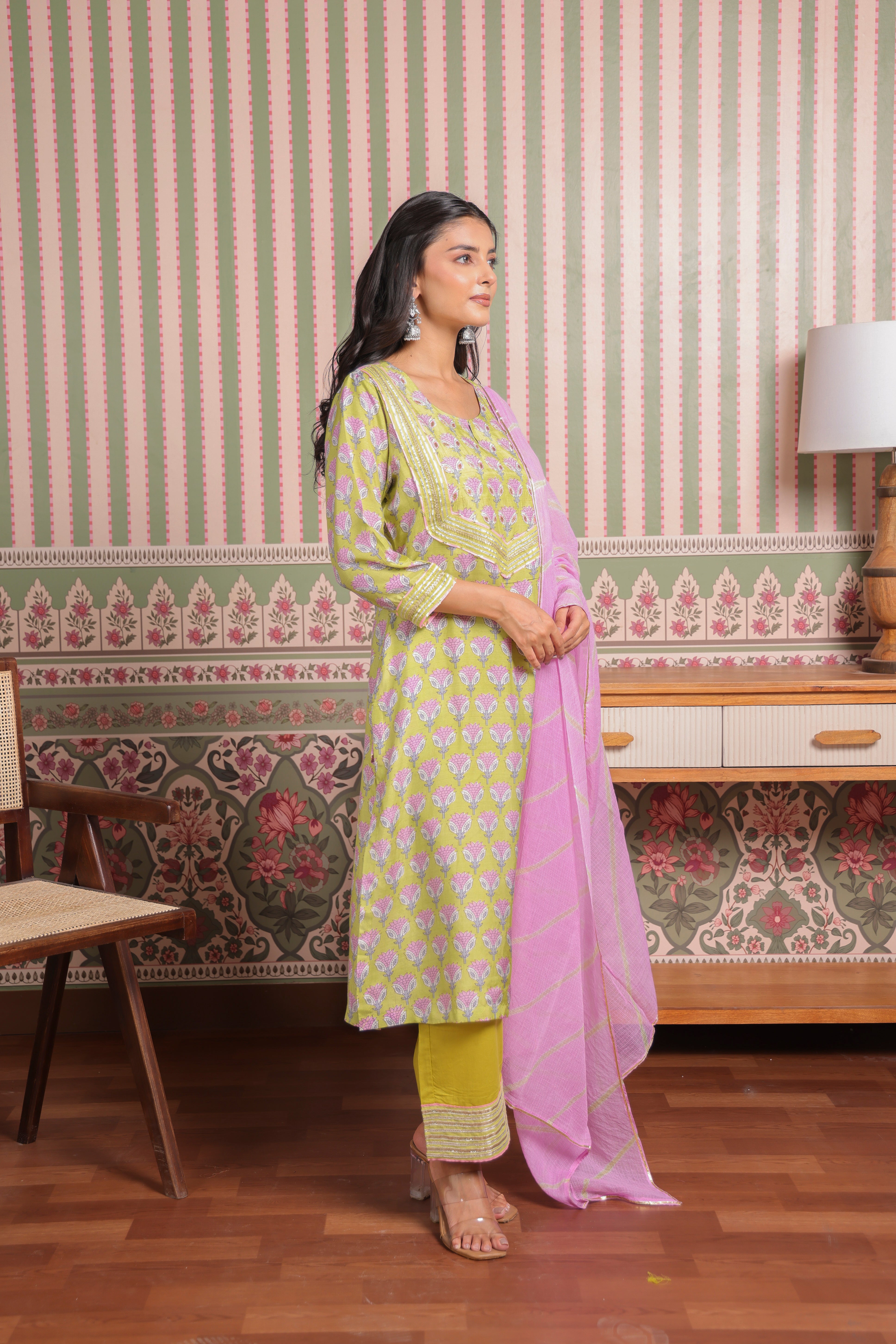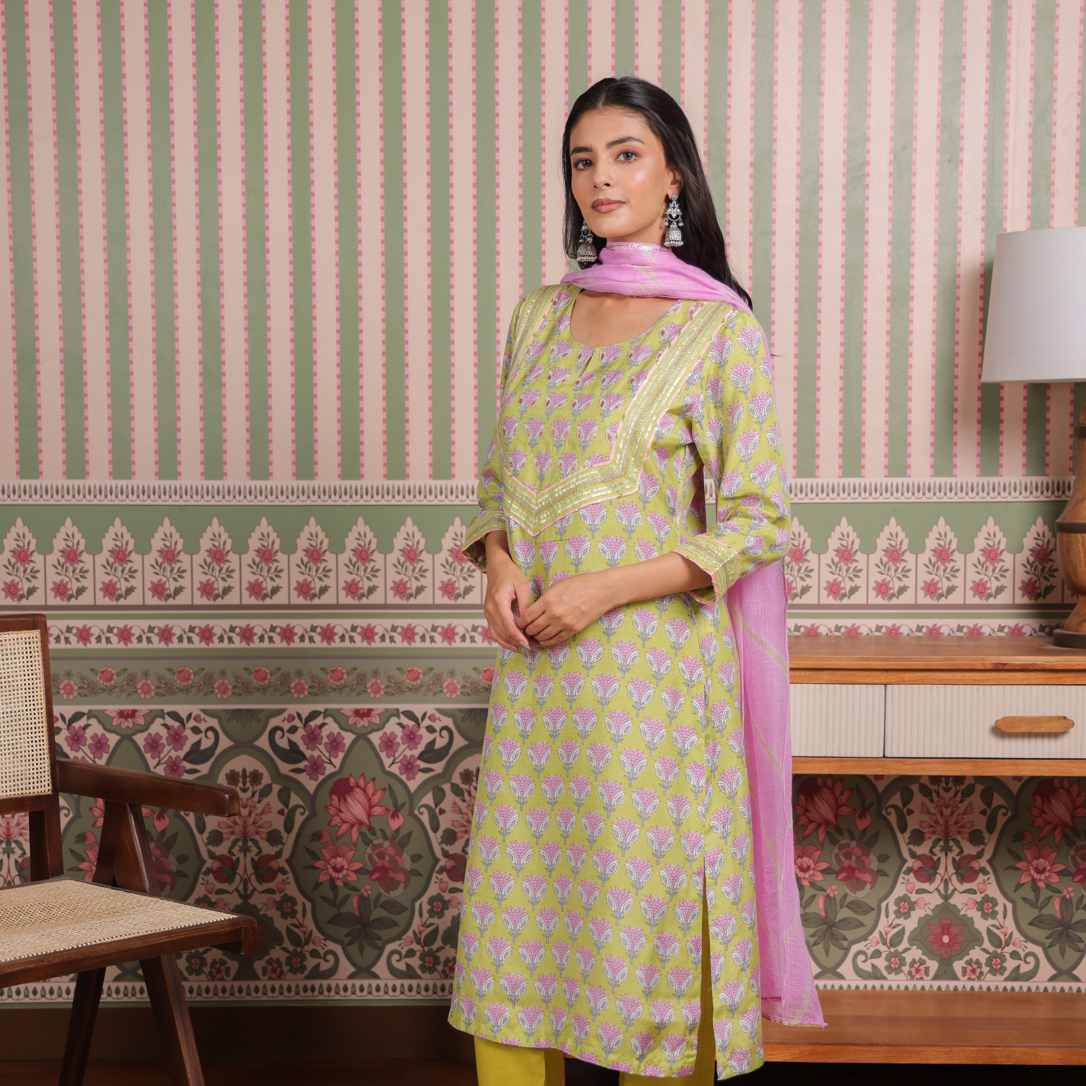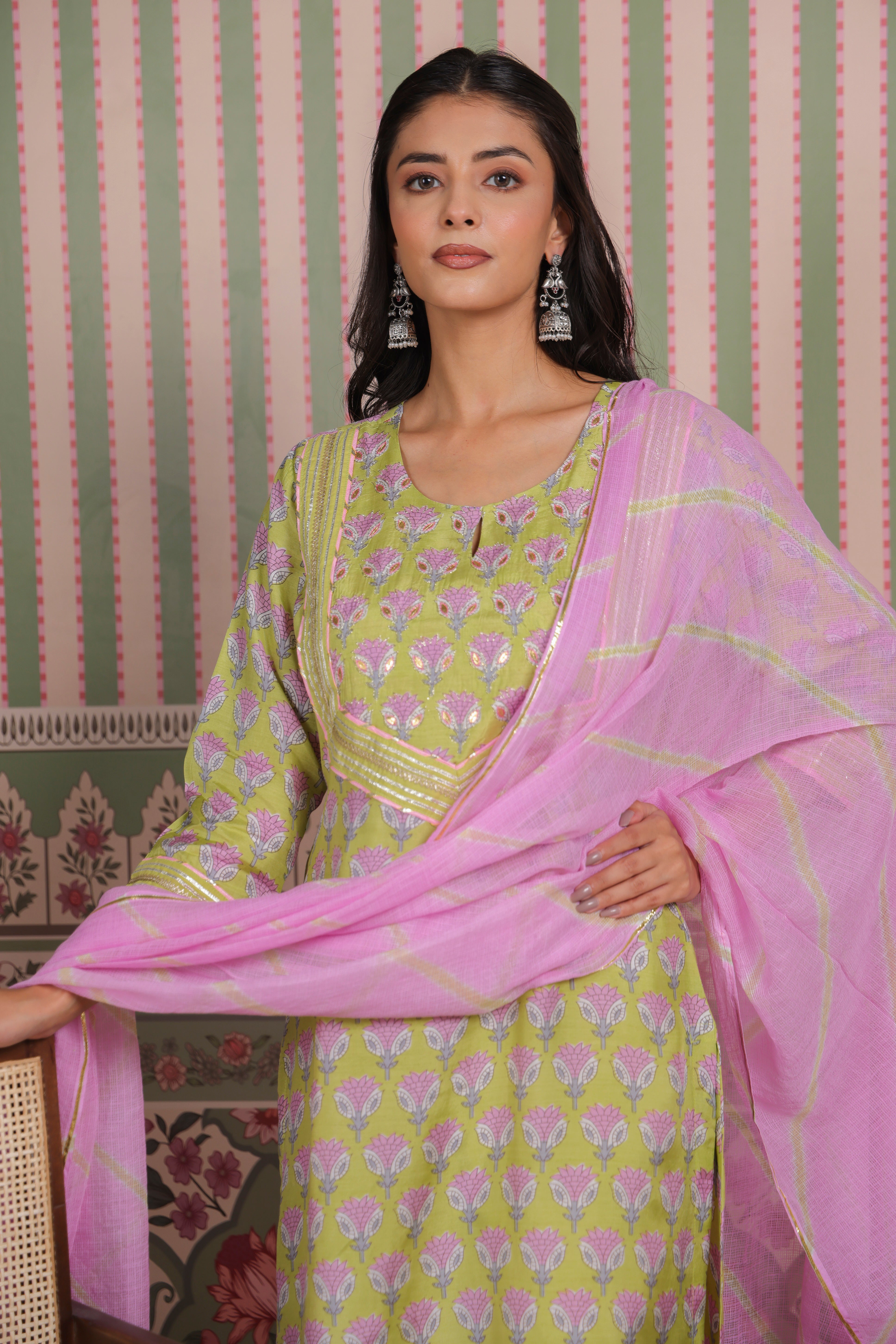 Exquisite green printed muslin suit set featuring intricate Gota Patti and Zari embroidery on the yoke. This premium Indian suit ensemble showcases traditional Indian craftsmanship with modern design sensibilities. The 3-piece set includes a kurta, pant, and dupatta, making it perfect for special occasions, Indian festivals, and cultural celebrations. A must-have for Indian ethnic wear enthusiasts.