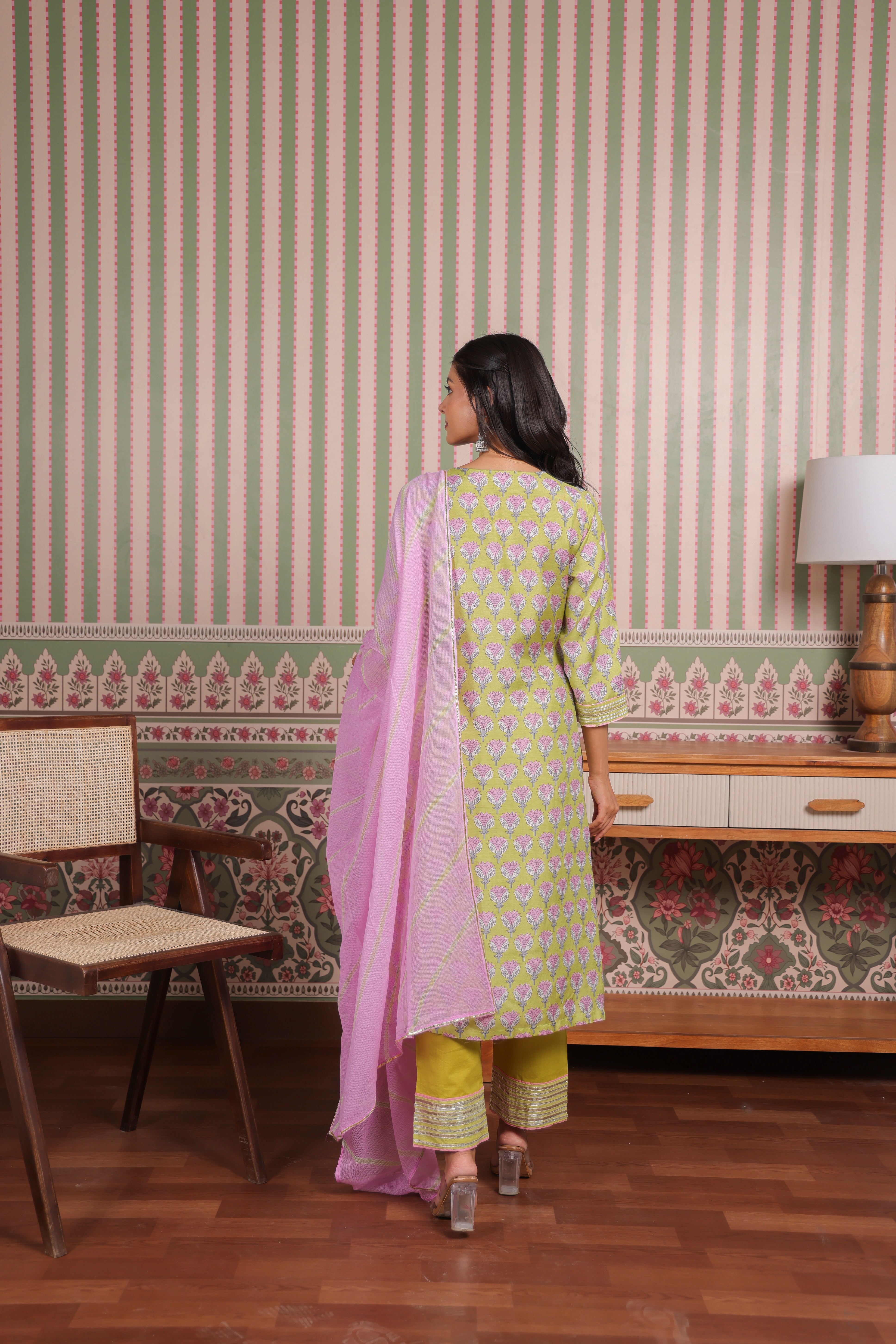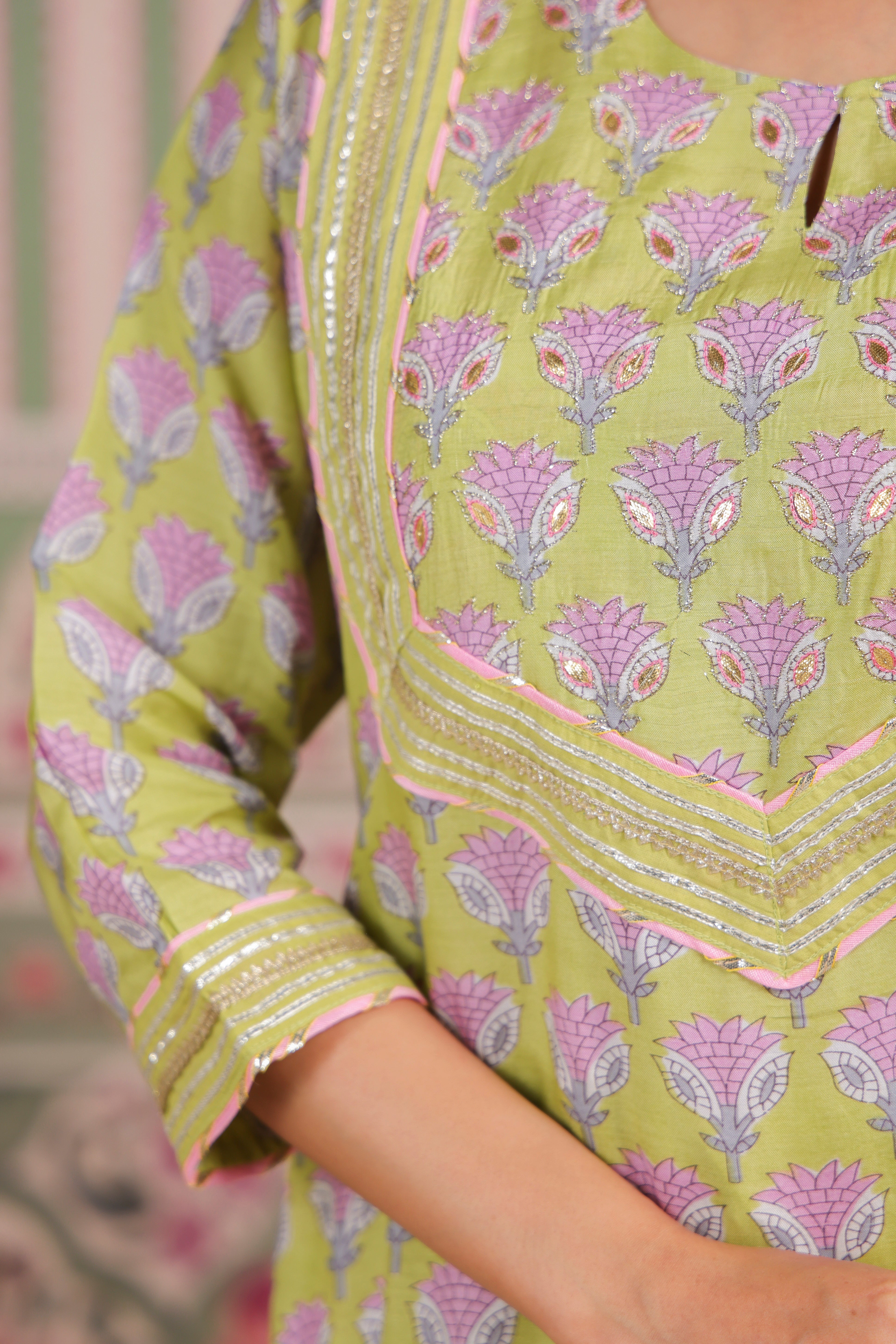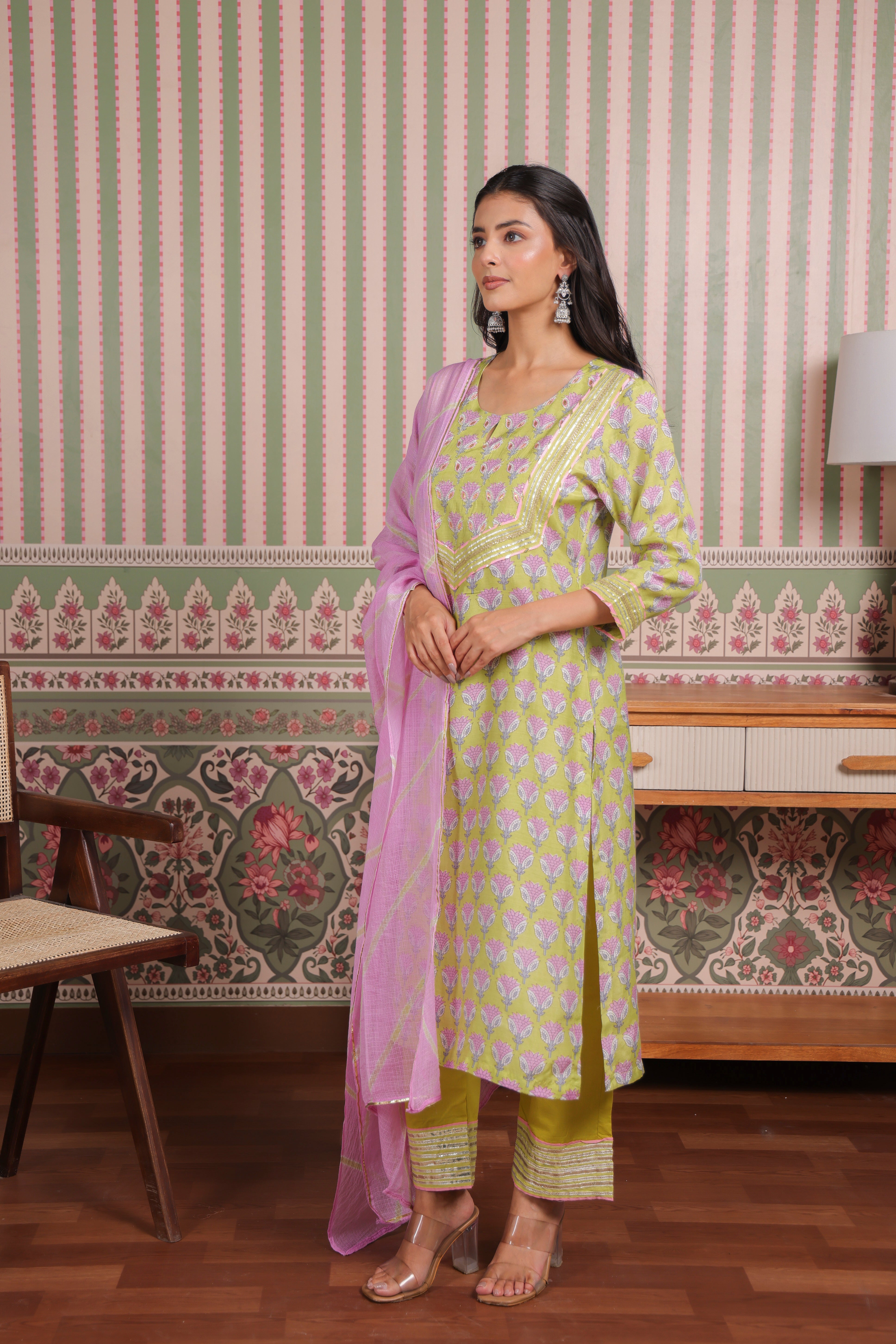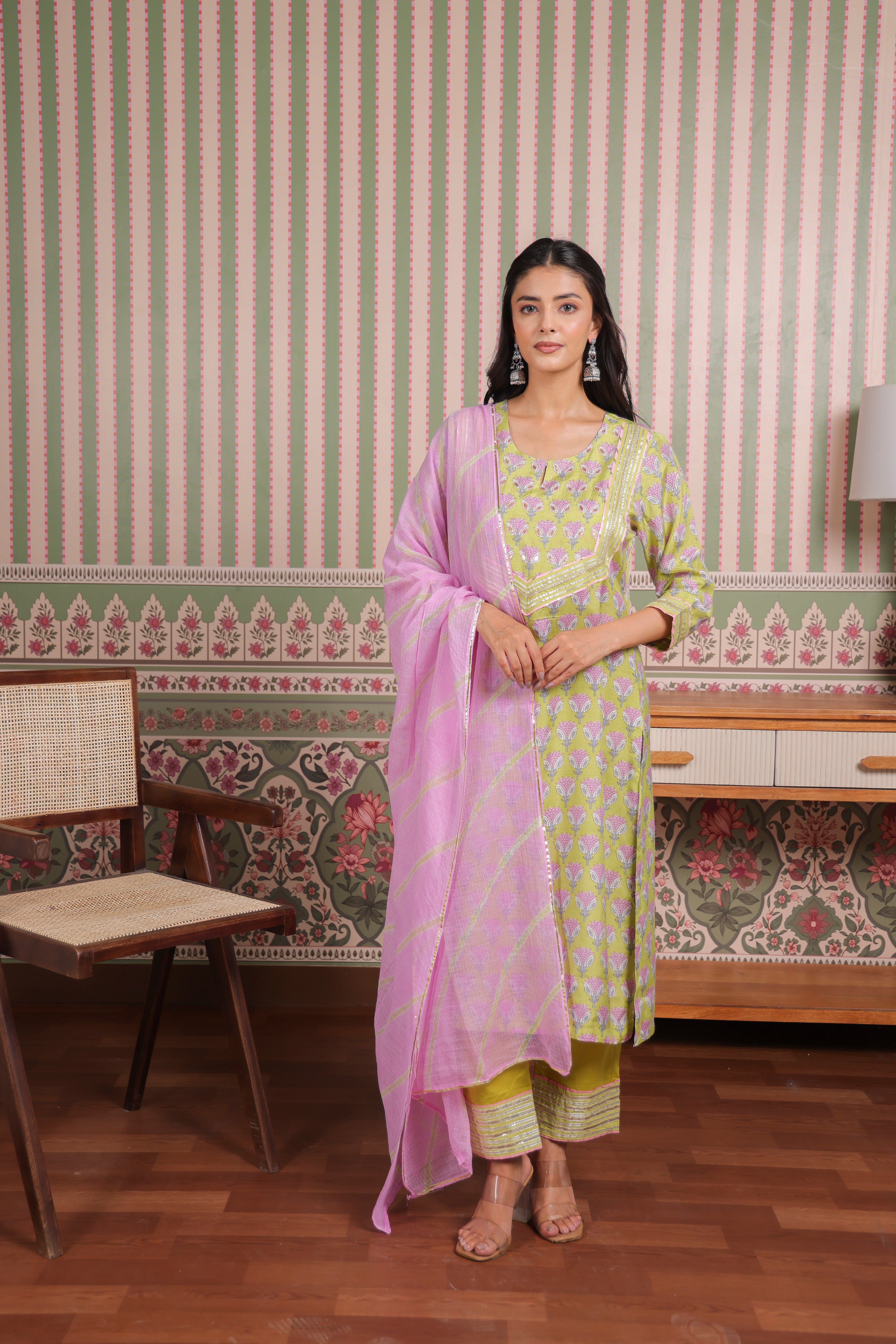 Green Printed Muslin Gota Patti Zari Embroidered Suit Set