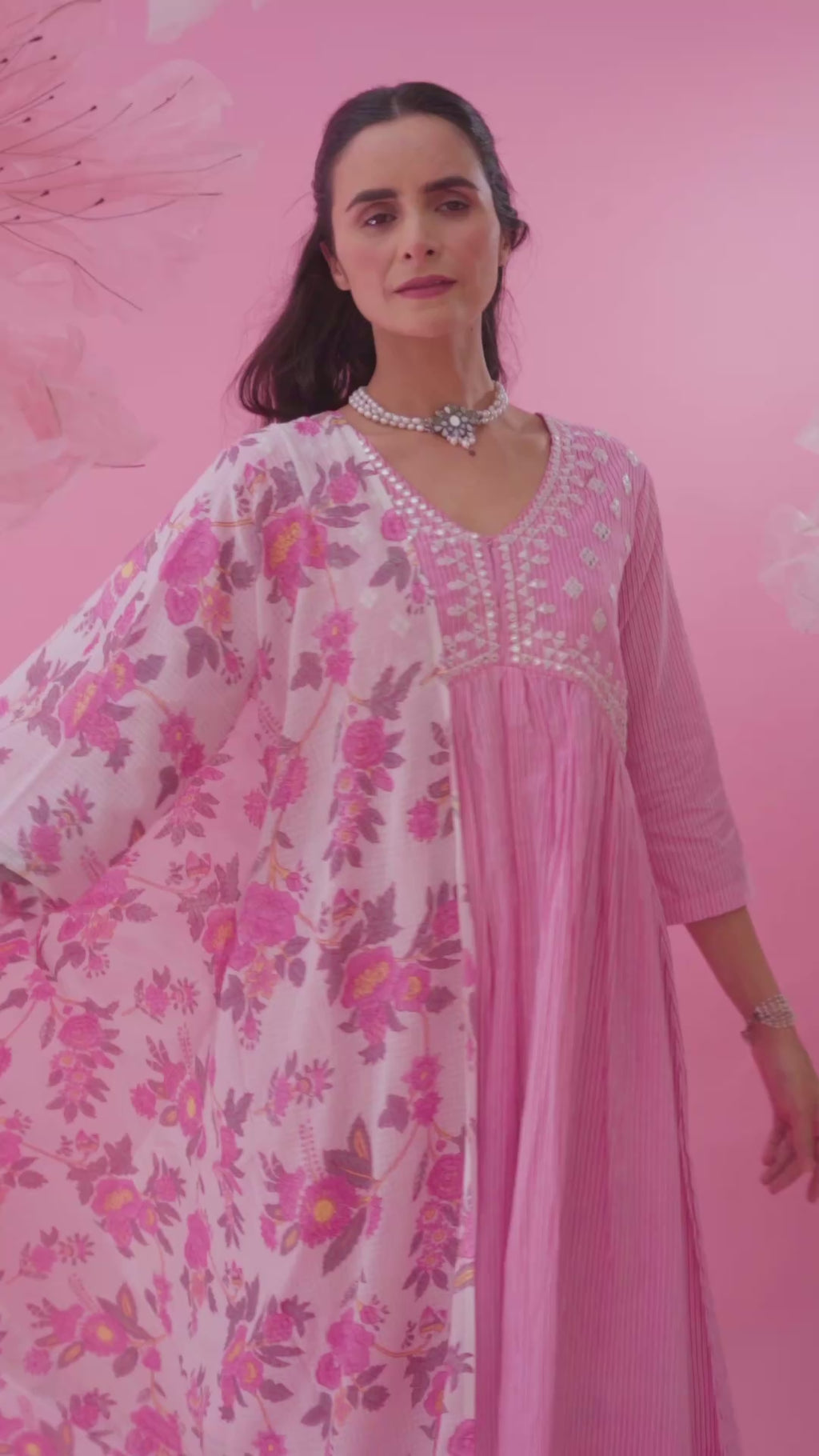 Get ready for your ethnic occasion and look like a diva in this gorgeous Pastel pink stripes printed kurta with mirror embroidered yoke and 3/4 sleeves along with floral printed sharara and printed kota doria dupatta with tassels
