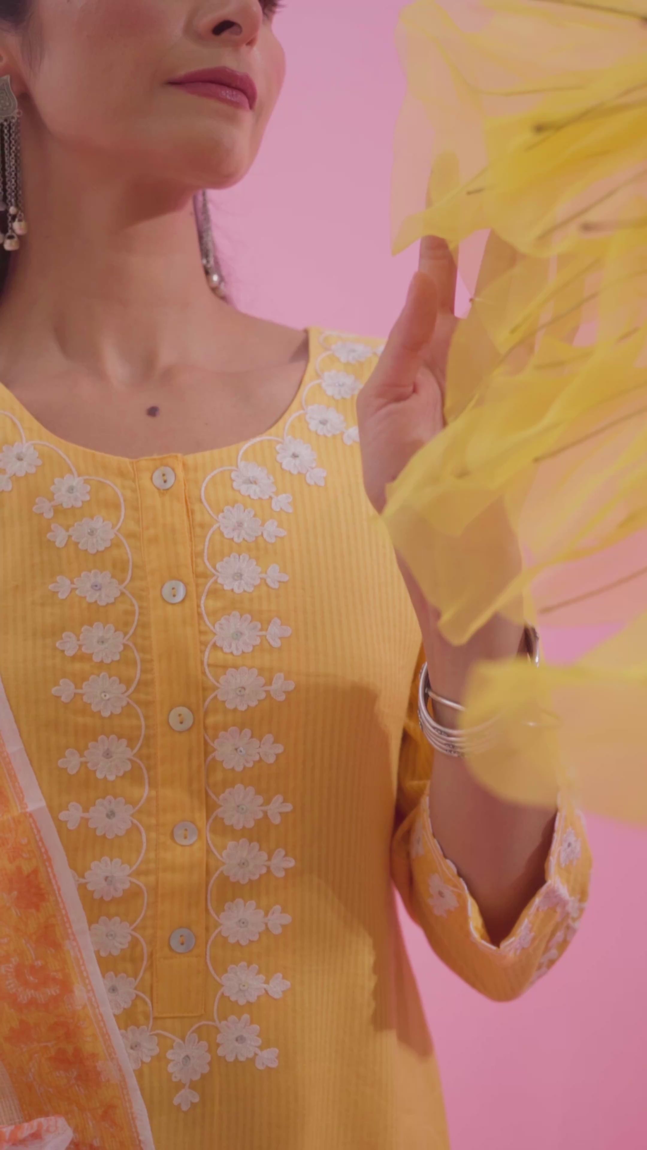 Get ready for your ethnic occasion and look like a diva in this gorgeous in our Ekohum Yellow woven dyed cotton dobby kurta with aari sequin embroidery neckline and sleeves. Comes along with hand block printed pant and hand block printed kota doria dupatta.