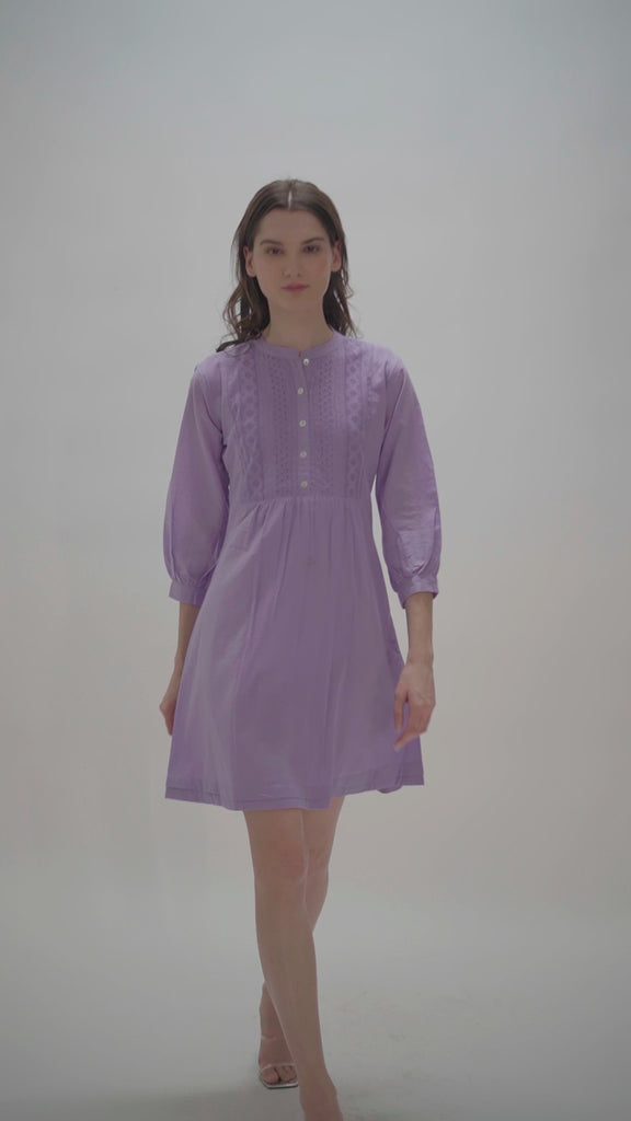 Lavender cotton short dress with beautiful cutwork yoke, has a manderian collar, three-quarter sleeves, and front buttons.