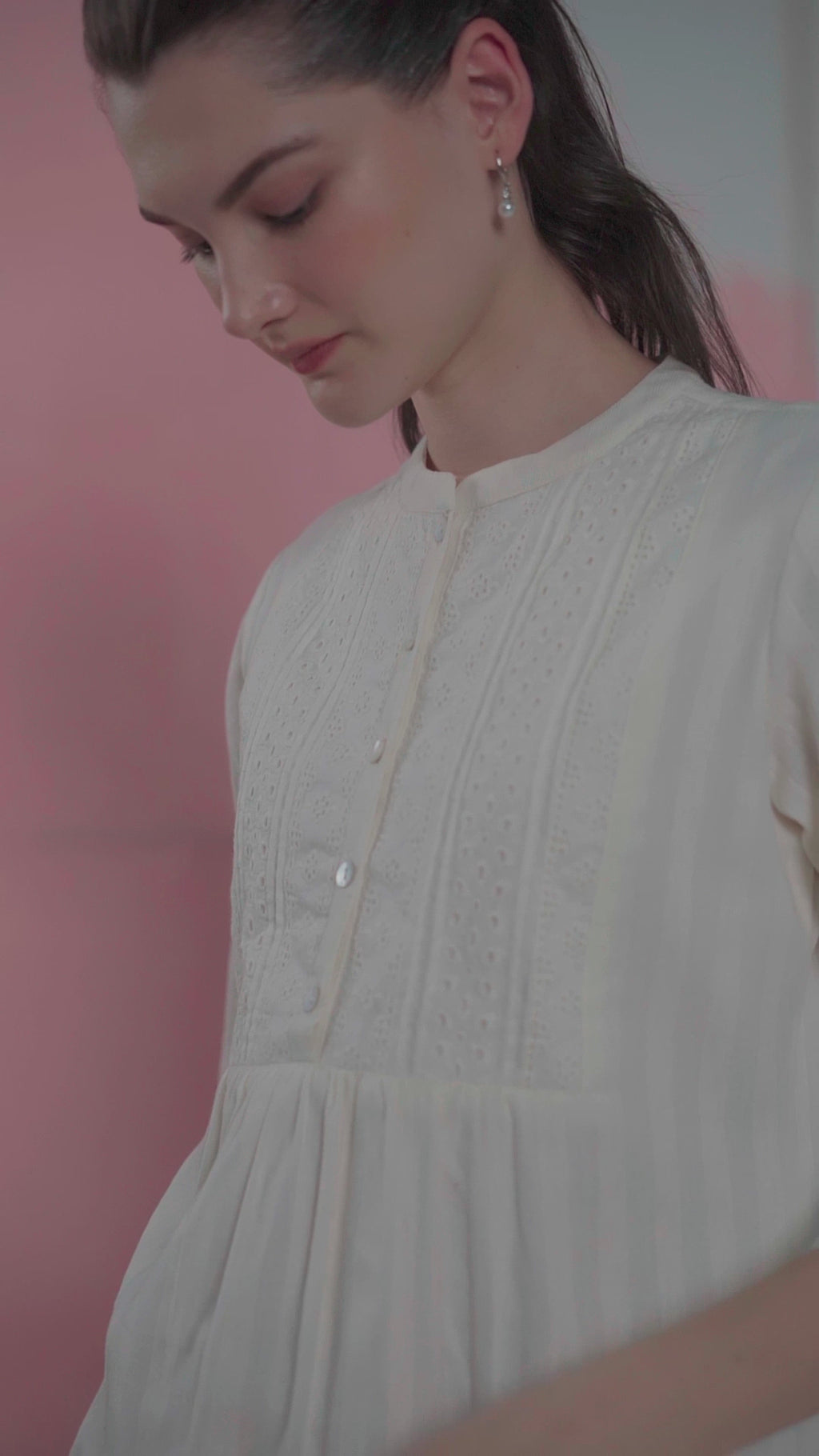 White cutwork crop shirt top, has a shirt collar, elbow sleeves and front button detailling and it comes with an attached lining.