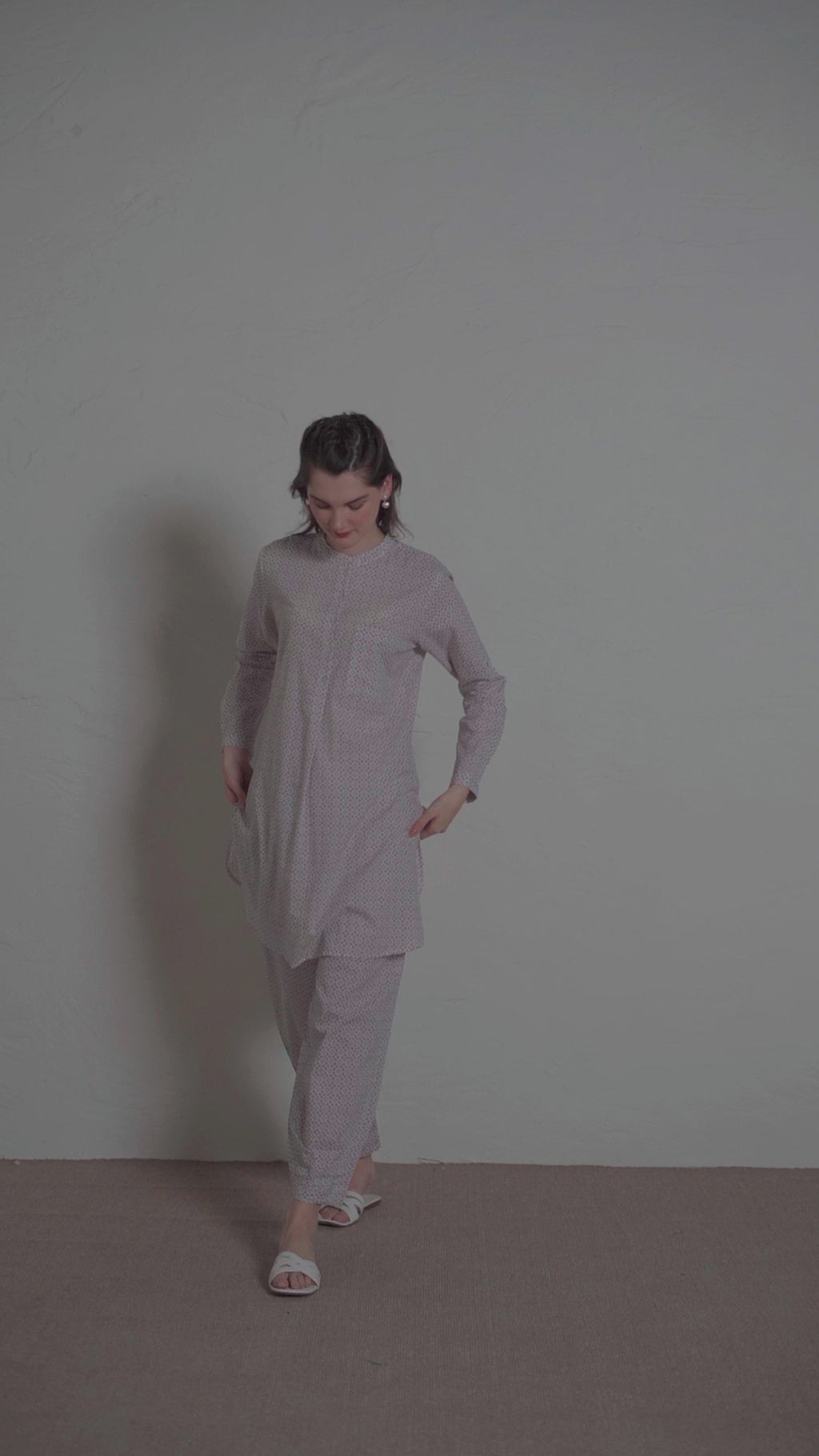 Lavender cotton printed loose fit up-down co-ords Set. This two-piece set includes a kurta with pant, has a manderin collar, three-quarter sleeves and front button detailing.
