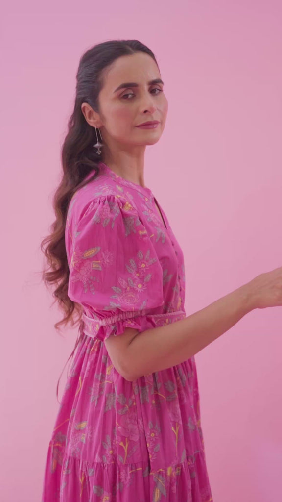 Pink Printed Tiered Maxi Dress with a Belt