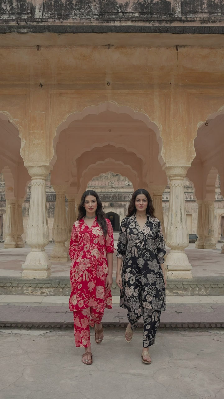 Prepare to make a statement with our captivating Red Printed Modal Co-Ord Set. This vibrant festive Indian outfit is a true work of art, blending timeless elegance with a modern twist.